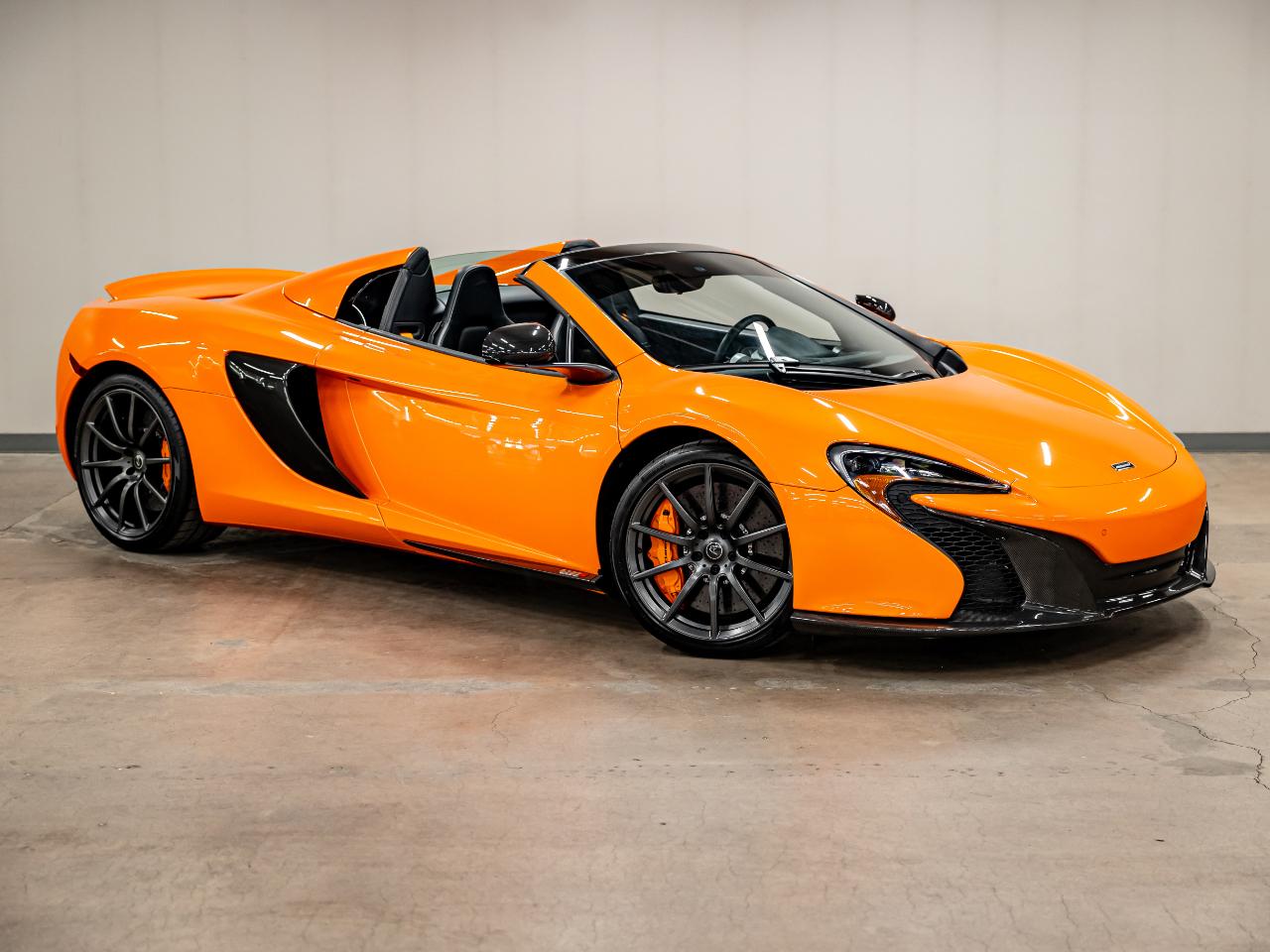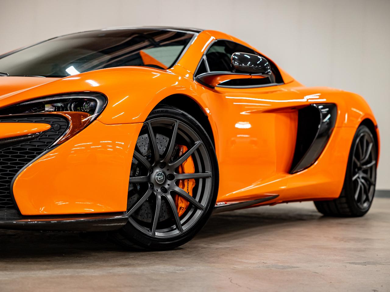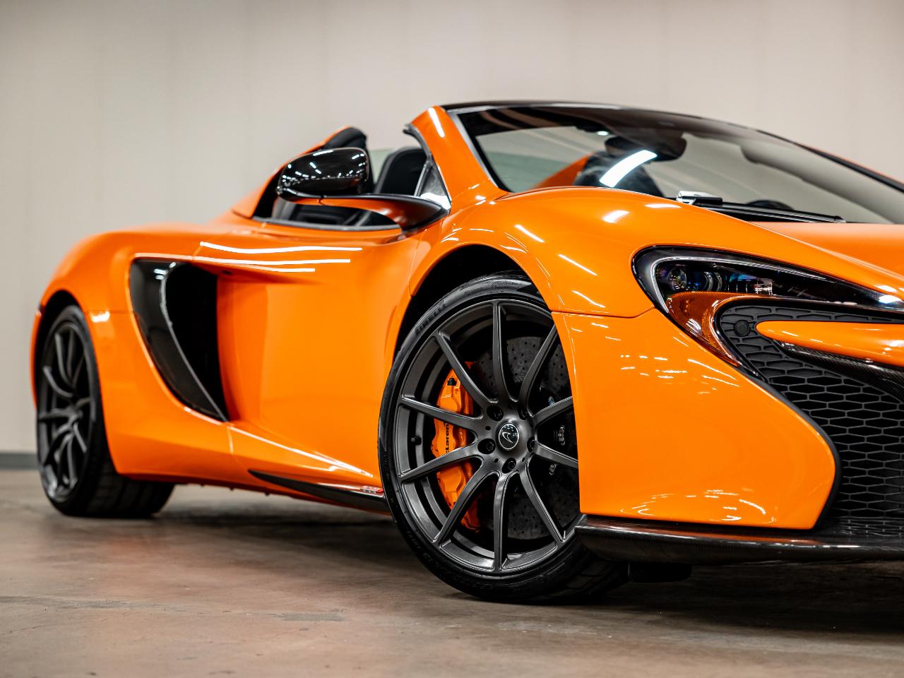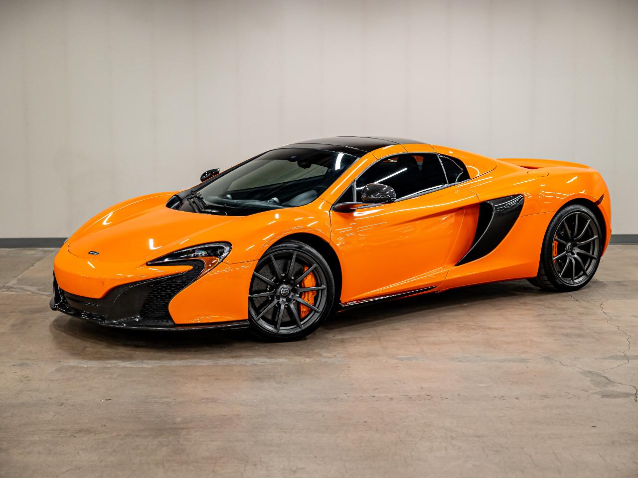 This 2015 McLaren 650S Spider is finished in McLaren Orange over a black leather interior with carbon fiber inlays. Power comes from a 3.8-liter twin-turbocharged V8 engine producing 641 horsepower and 500 lb-ft of torque, sent to the rear wheels via a 7-speed dual-clutch automatic transmission.