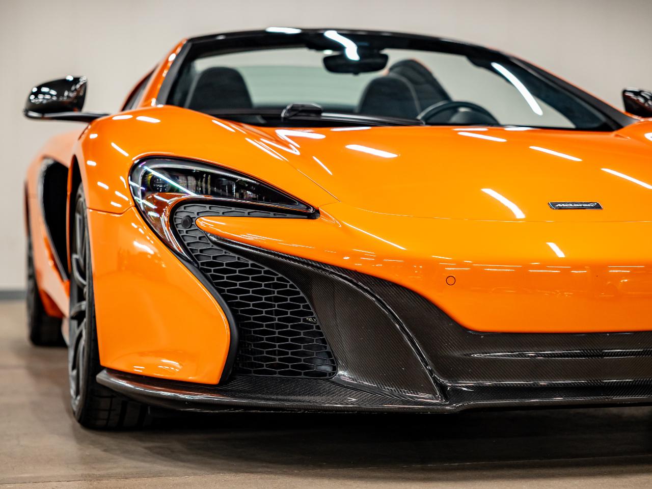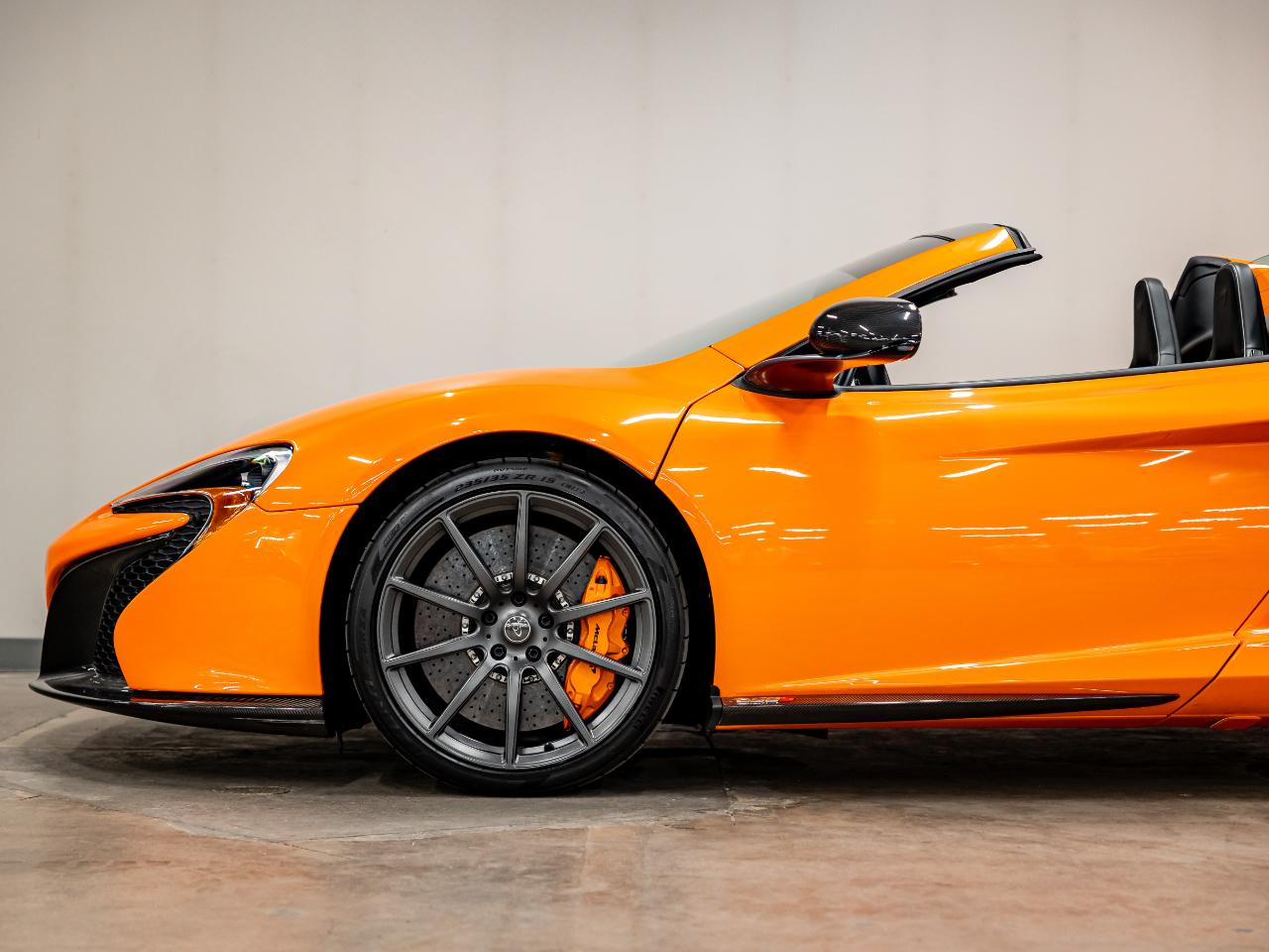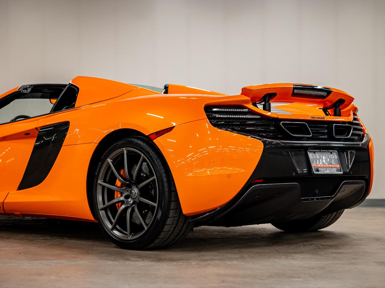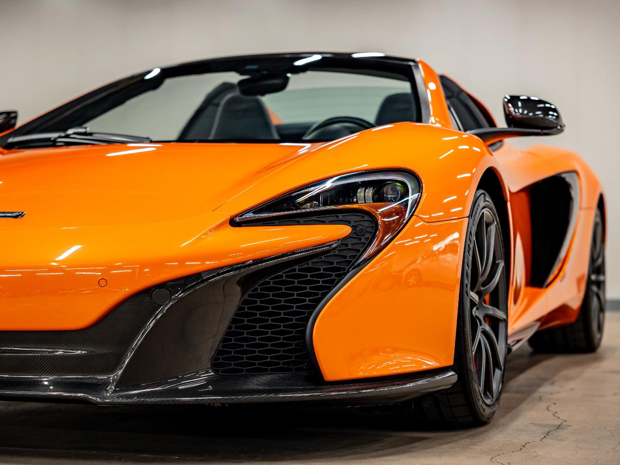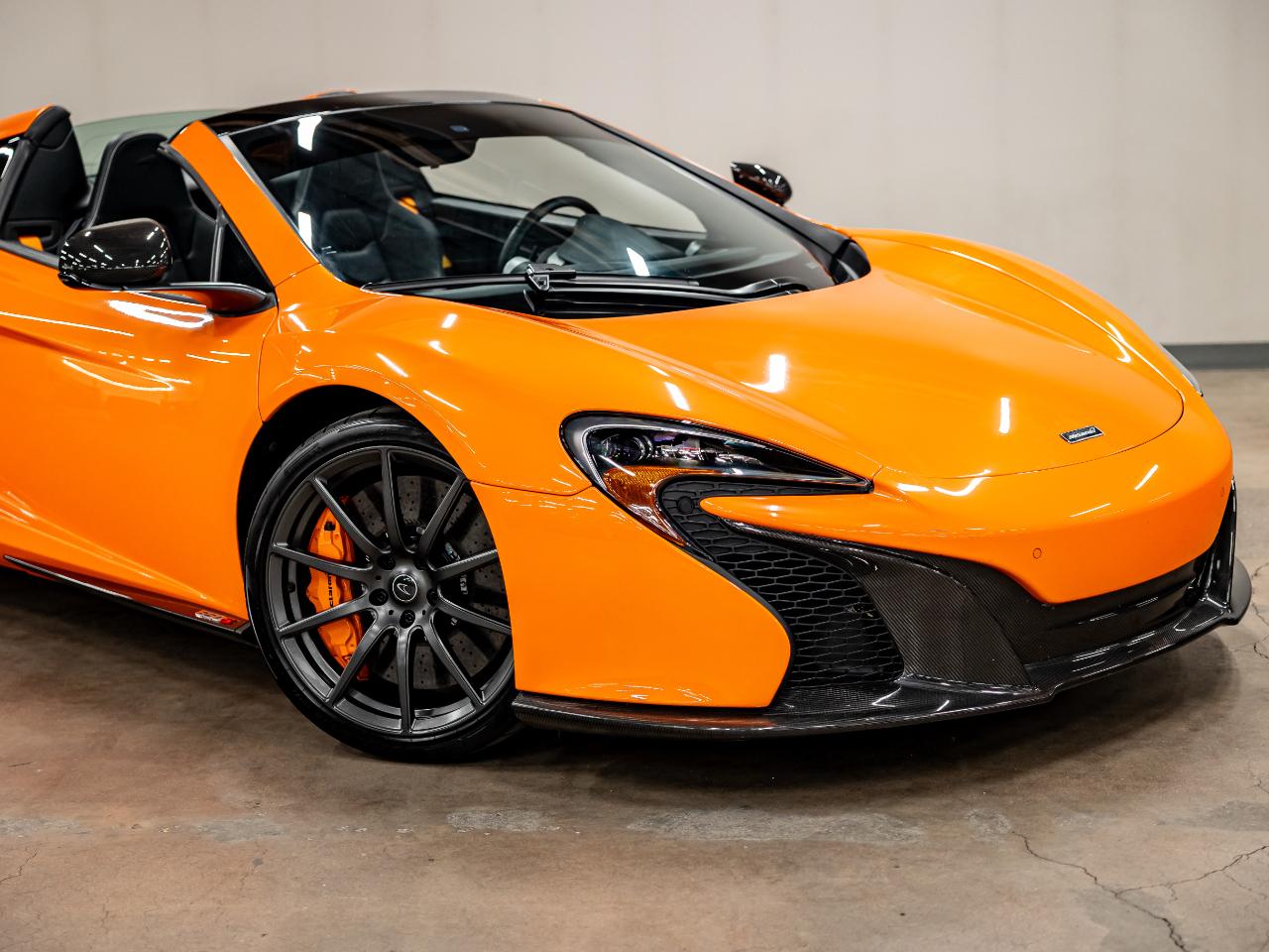 This 2015 McLaren 650S Spider is finished in McLaren Orange over a black leather interior with carbon fiber inlays. Power comes from a 3.8-liter twin-turbocharged V8 engine producing 641 horsepower and 500 lb-ft of torque, sent to the rear wheels via a 7-speed dual-clutch automatic transmission.