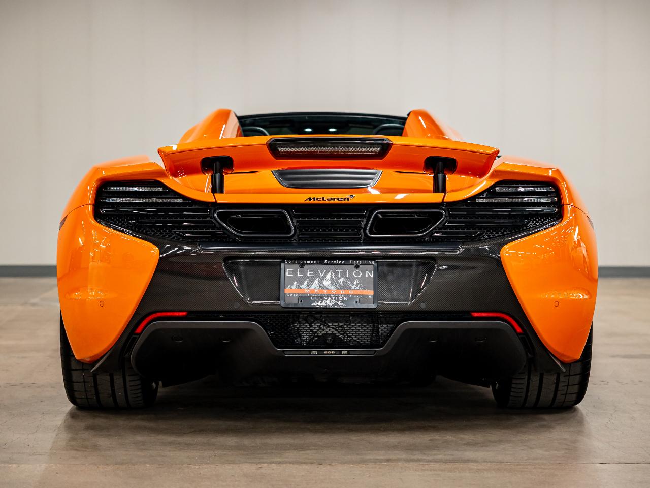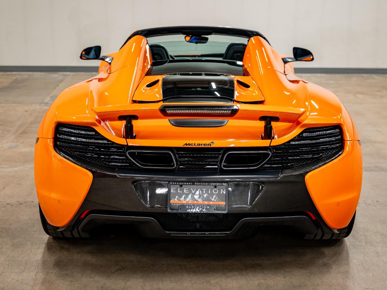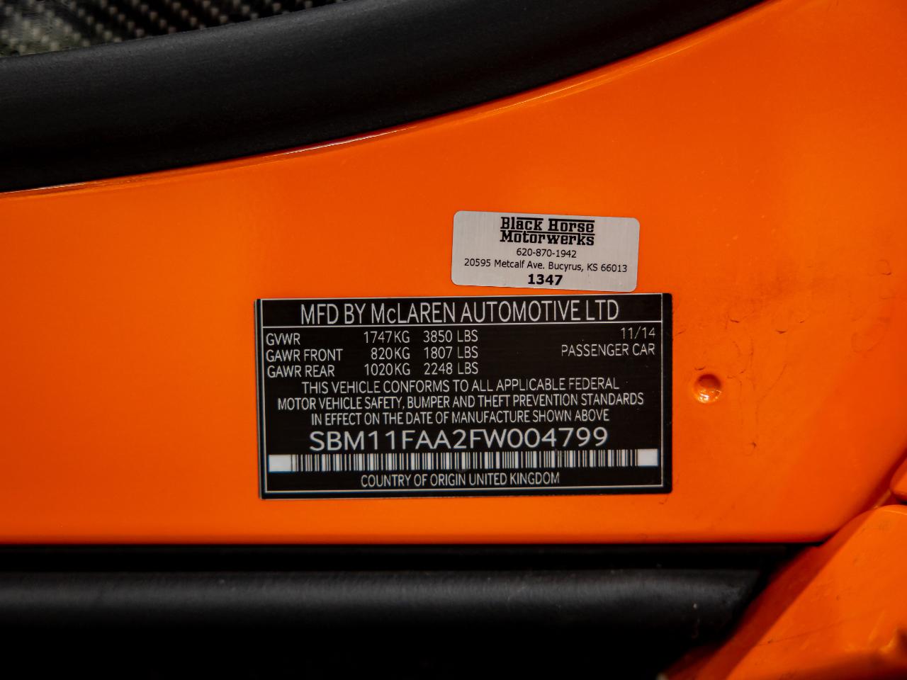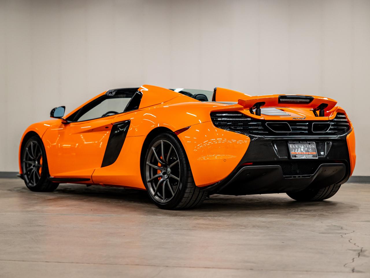 This 2015 McLaren 650S Spider is finished in McLaren Orange over a black leather interior with carbon fiber inlays. Power comes from a 3.8-liter twin-turbocharged V8 engine producing 641 horsepower and 500 lb-ft of torque, sent to the rear wheels via a 7-speed dual-clutch automatic transmission.