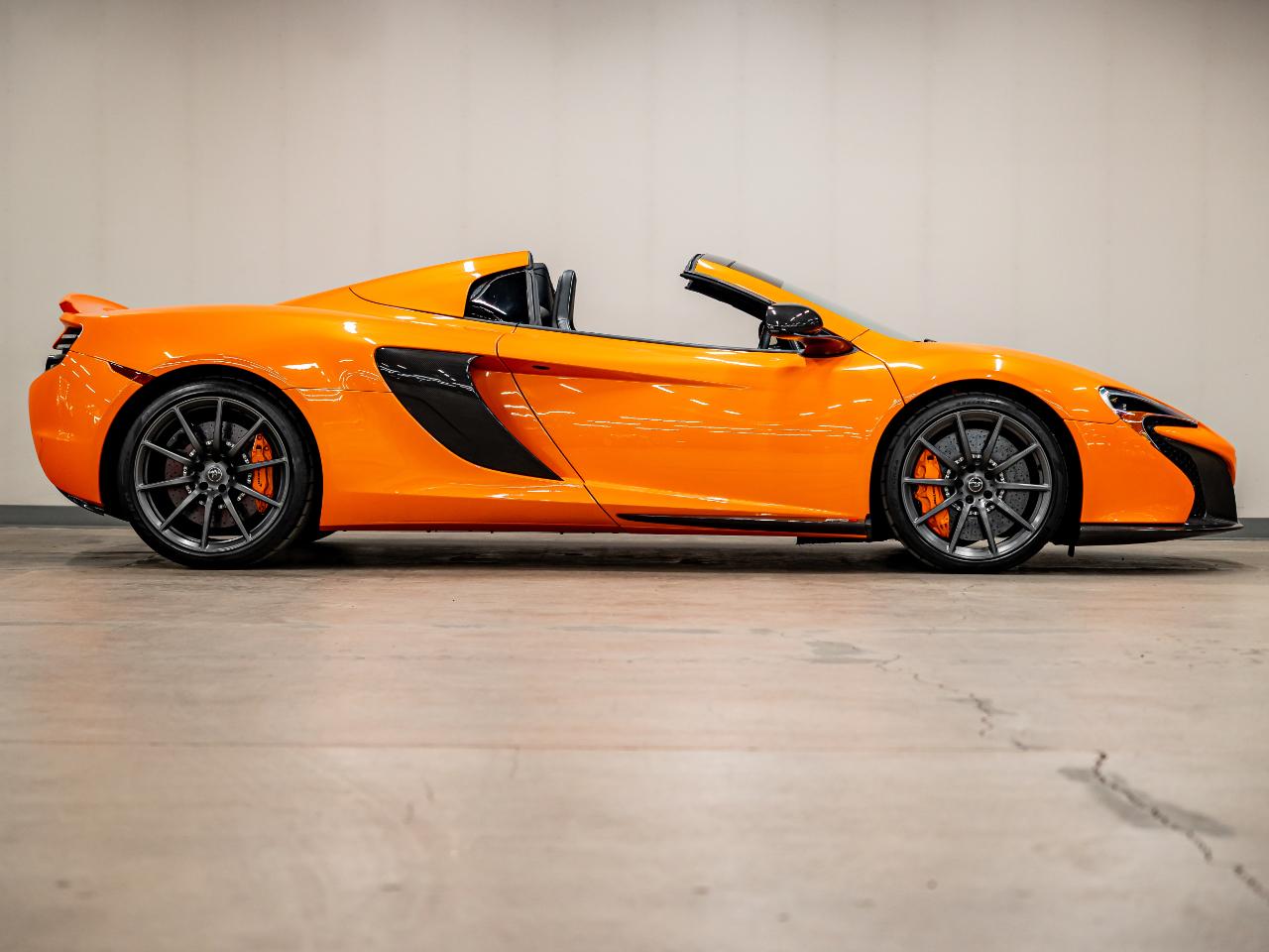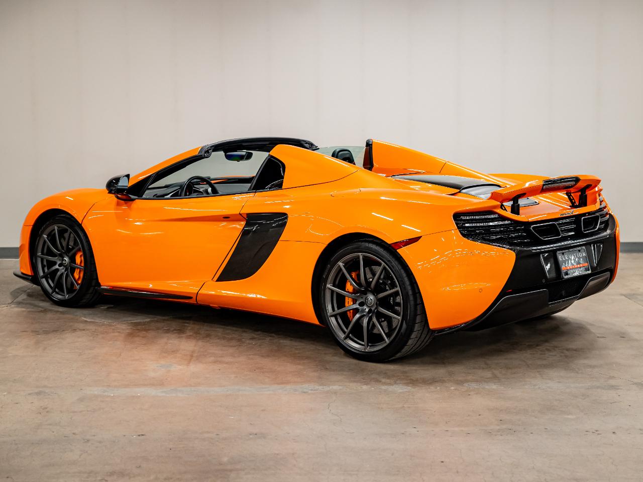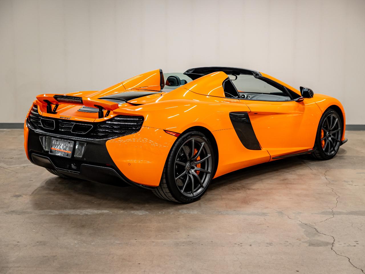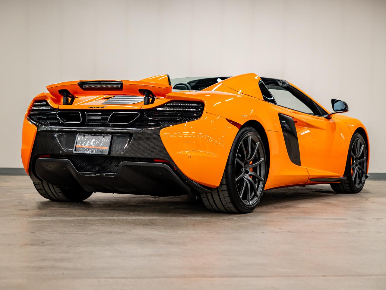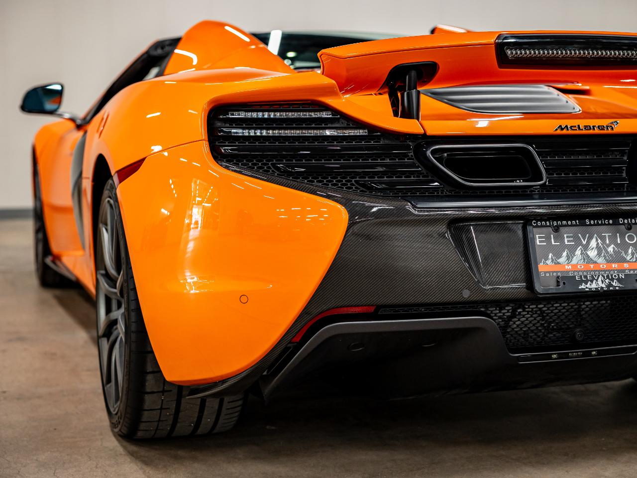 This 2015 McLaren 650S Spider is finished in McLaren Orange over a black leather interior with carbon fiber inlays. Power comes from a 3.8-liter twin-turbocharged V8 engine producing 641 horsepower and 500 lb-ft of torque, sent to the rear wheels via a 7-speed dual-clutch automatic transmission.