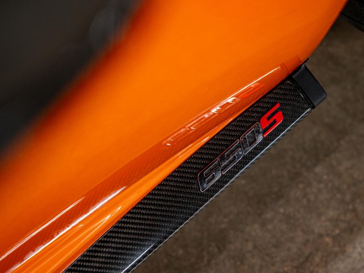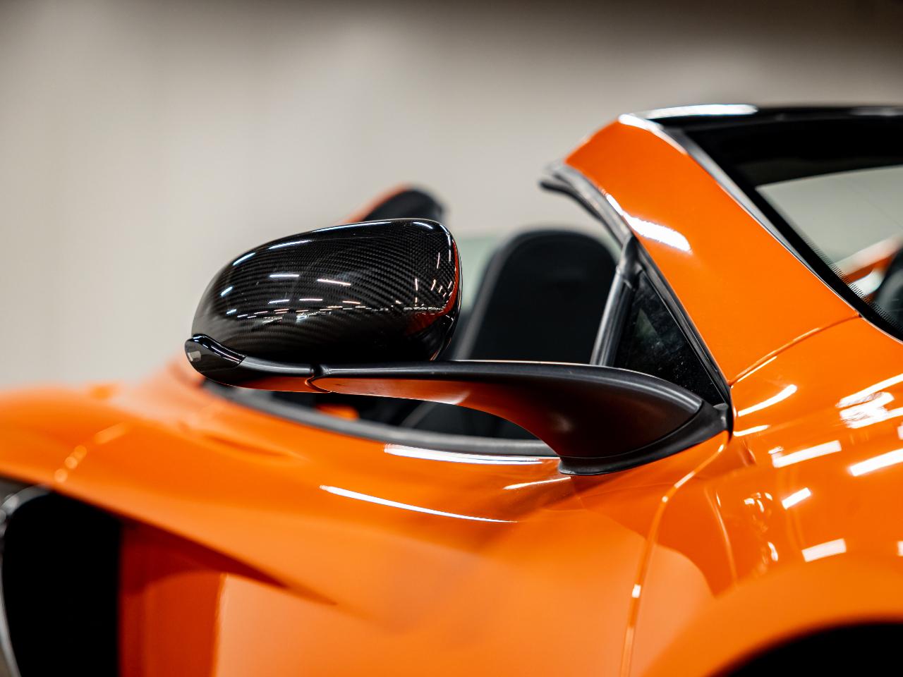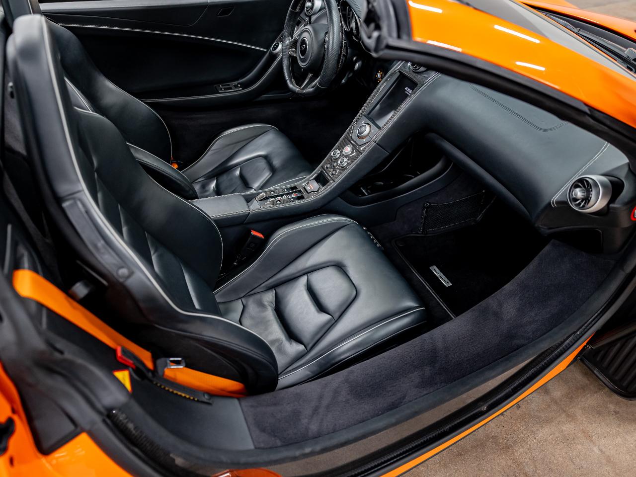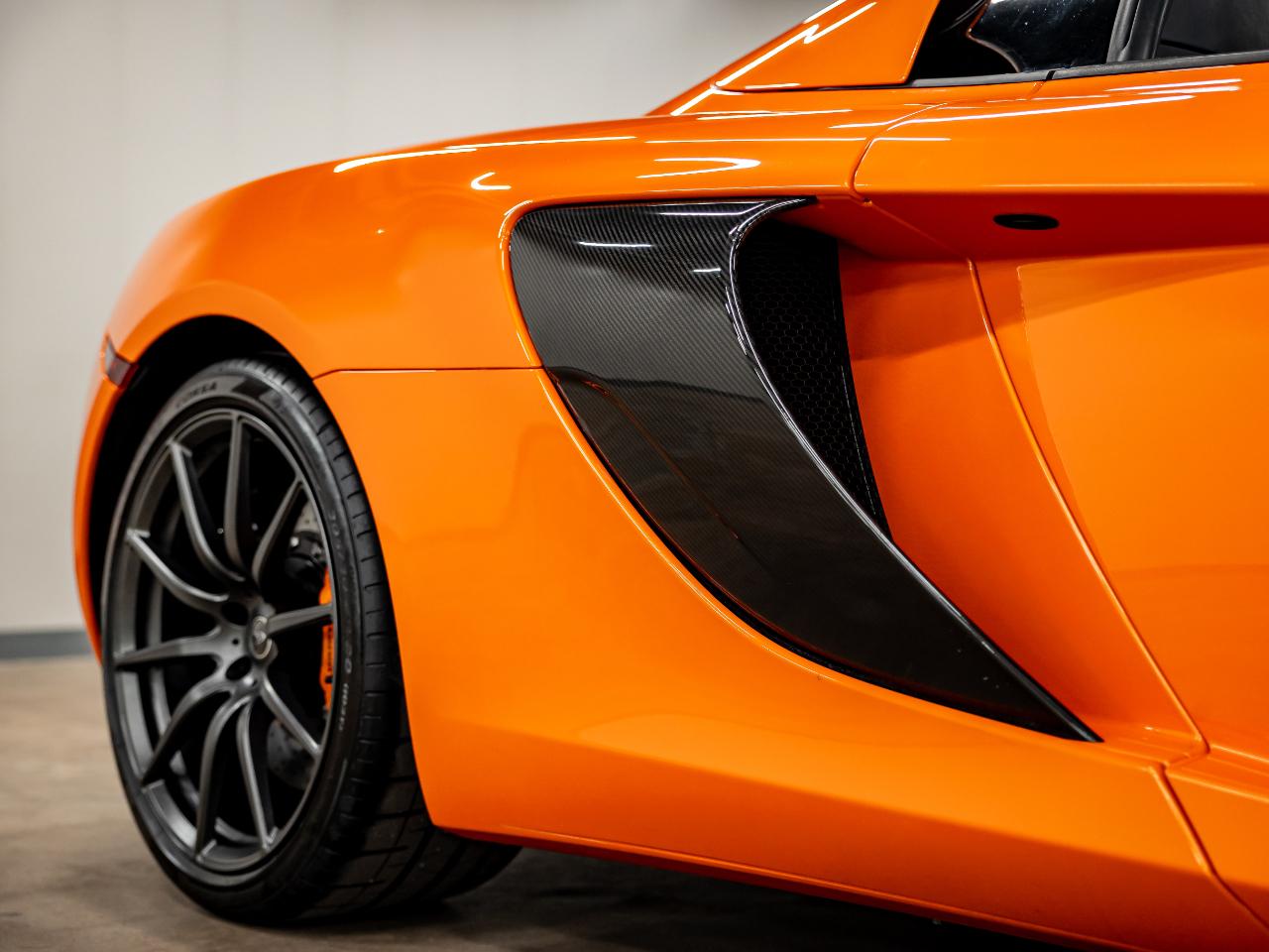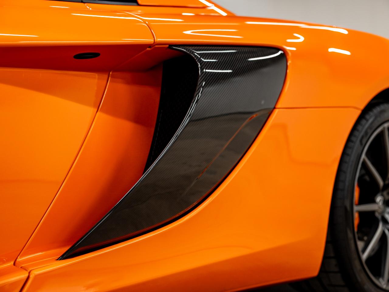 This 650S features the carbon fiber exterior upgrade package, which includes a carbon fiber front splitter, door blades, mirrors, side skirts, and rear bumper. It also comes equipped with carbon-ceramic brakes and orange-painted brake calipers, power-adjustable heated seats, dual-zone climate control, a power-retractable hardtop, a navigation system with a Meridian sound system, and front and rear parking sensors with a backup camera.
