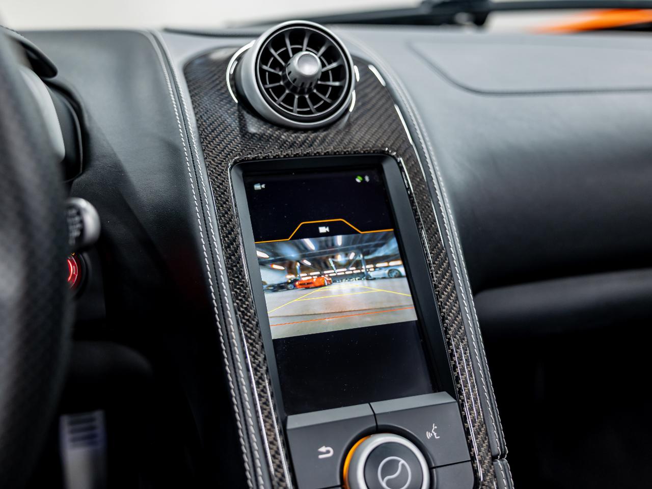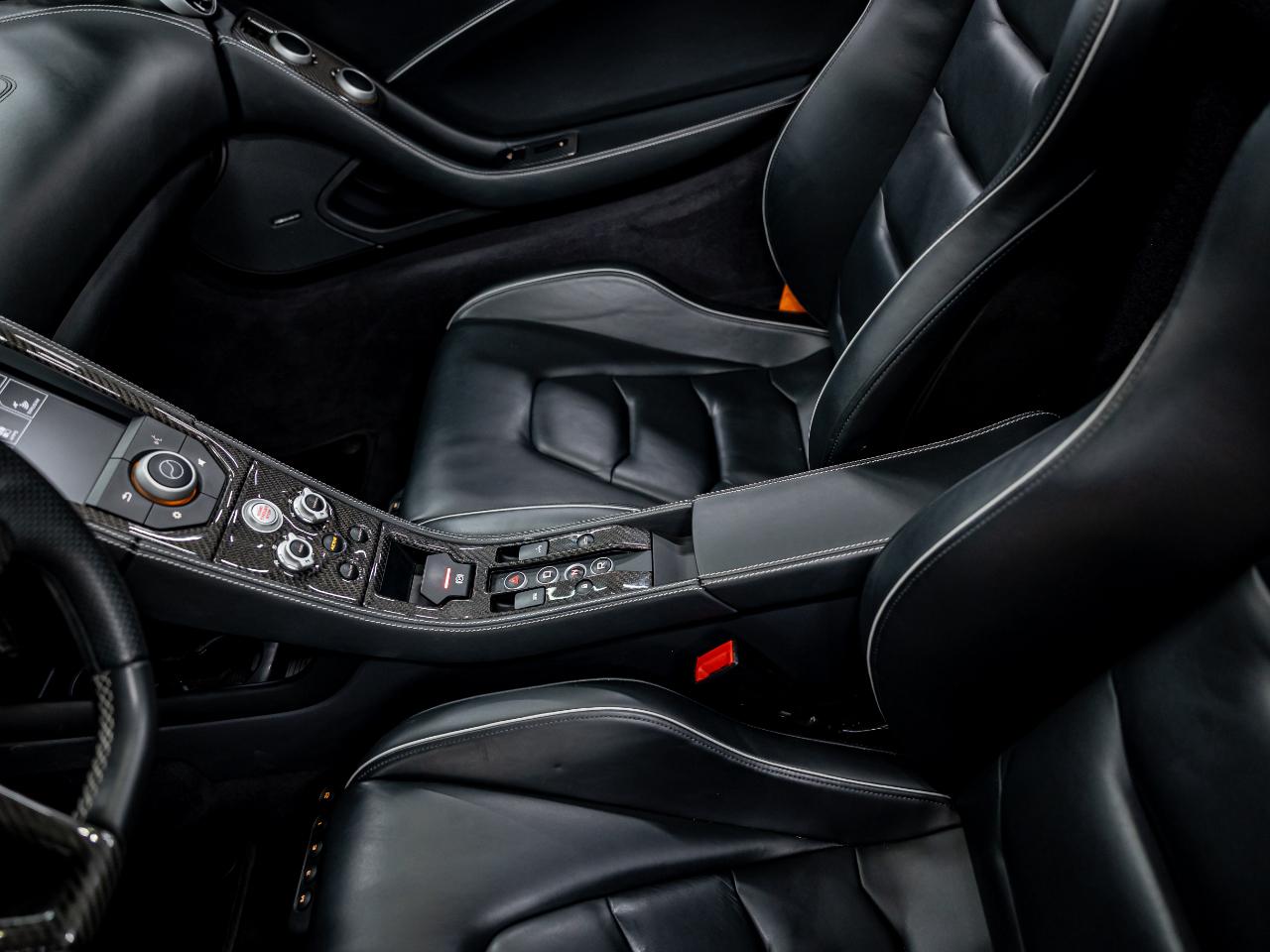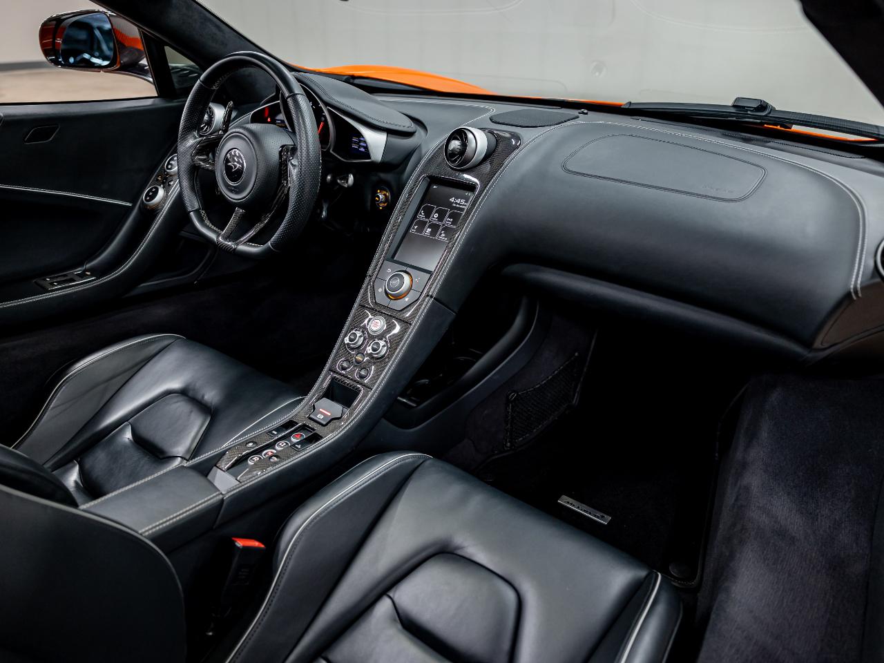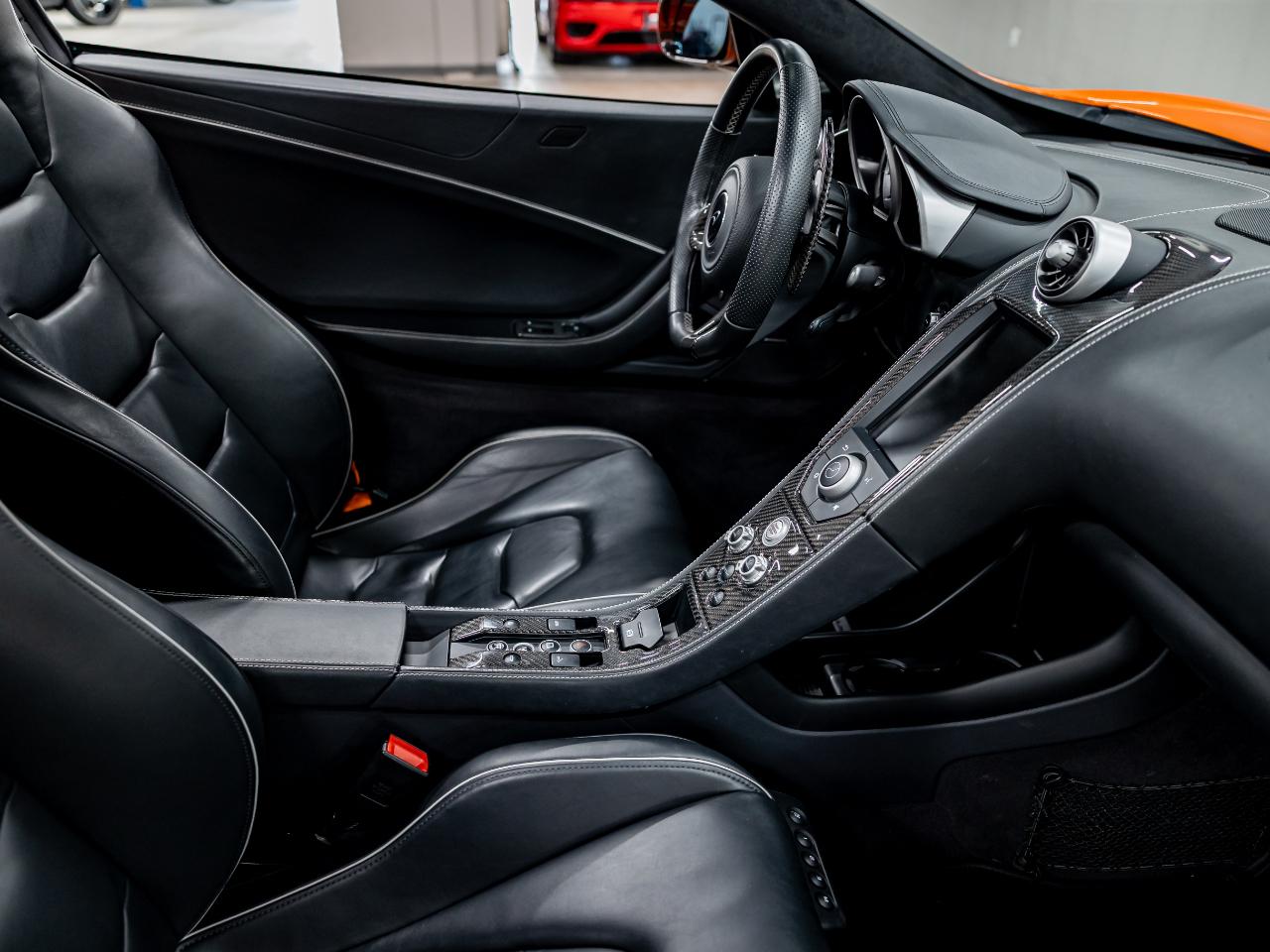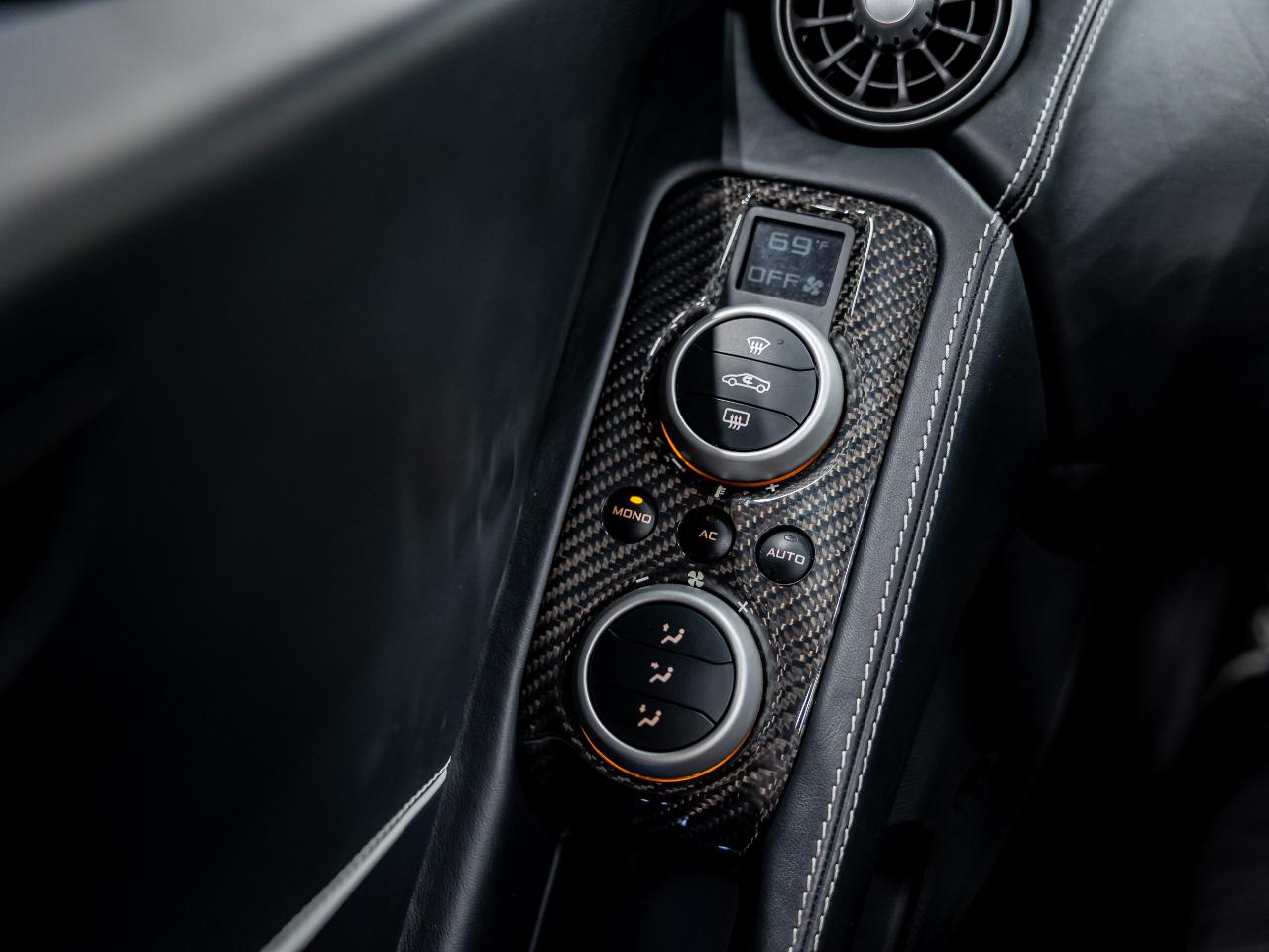 This 650S features the carbon fiber exterior upgrade package, which includes a carbon fiber front splitter, door blades, mirrors, side skirts, and rear bumper. It also comes equipped with carbon-ceramic brakes and orange-painted brake calipers, power-adjustable heated seats, dual-zone climate control, a power-retractable hardtop, a navigation system with a Meridian sound system, and front and rear parking sensors with a backup camera.