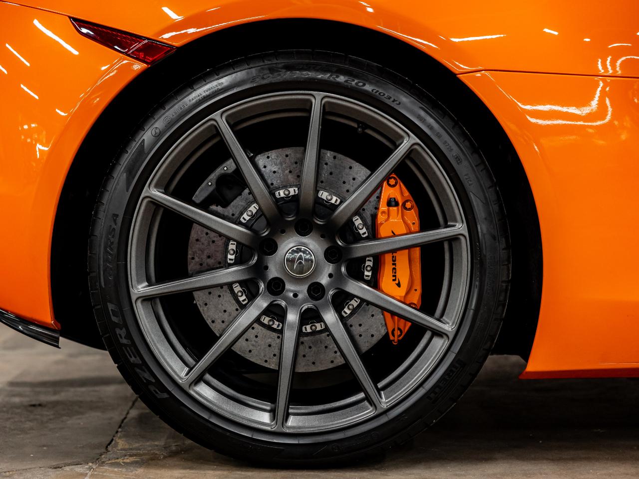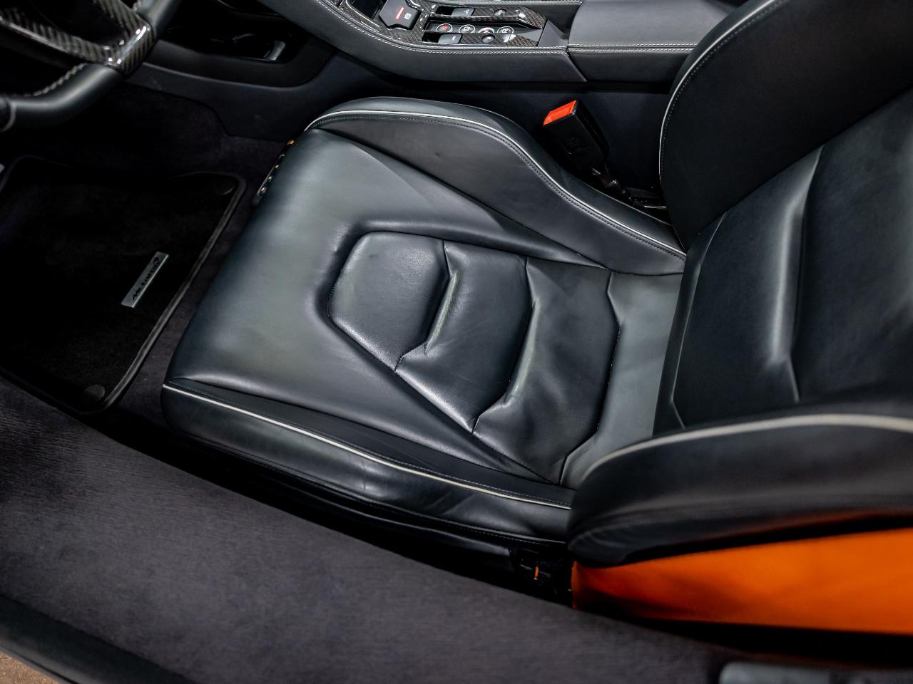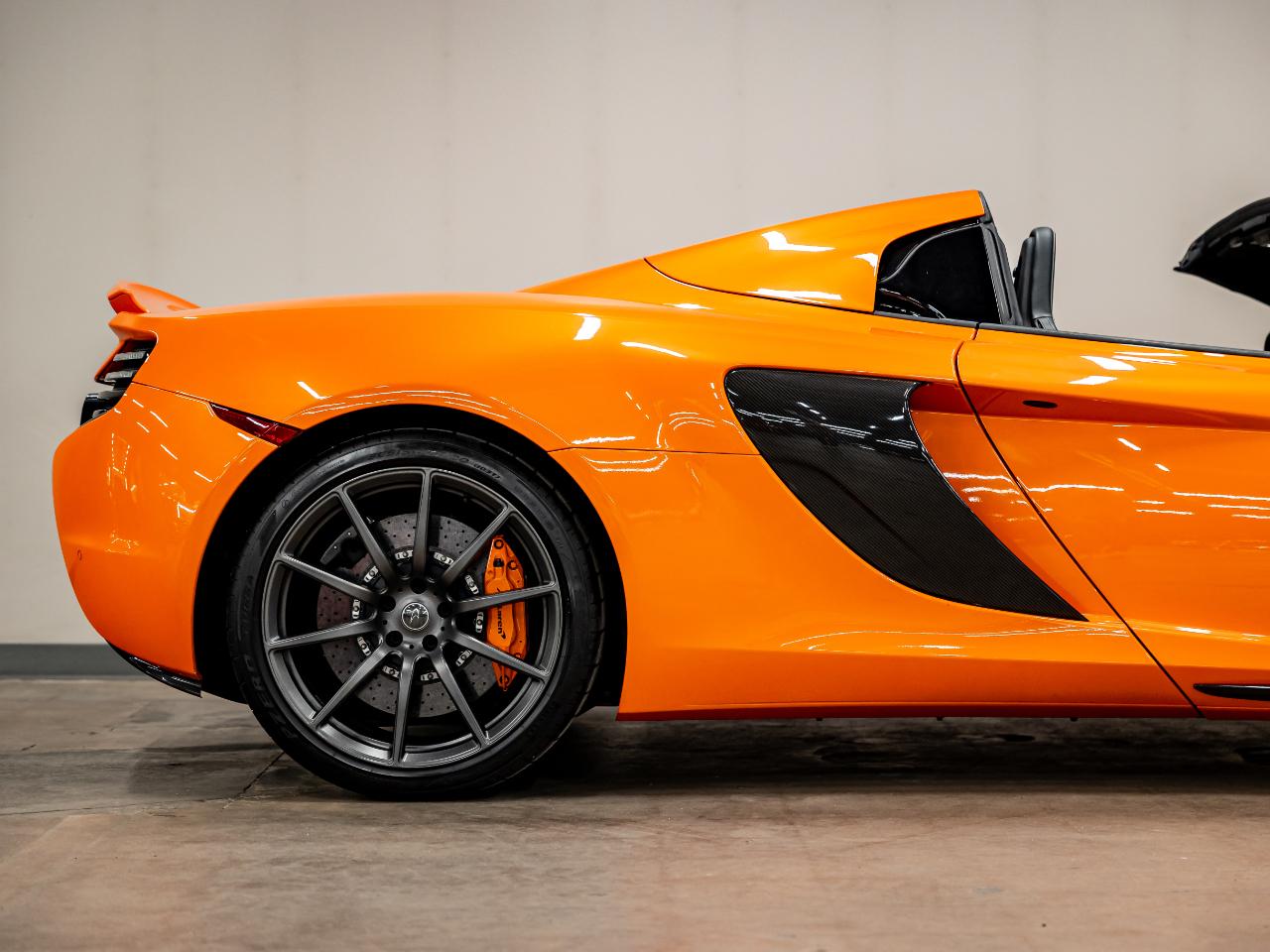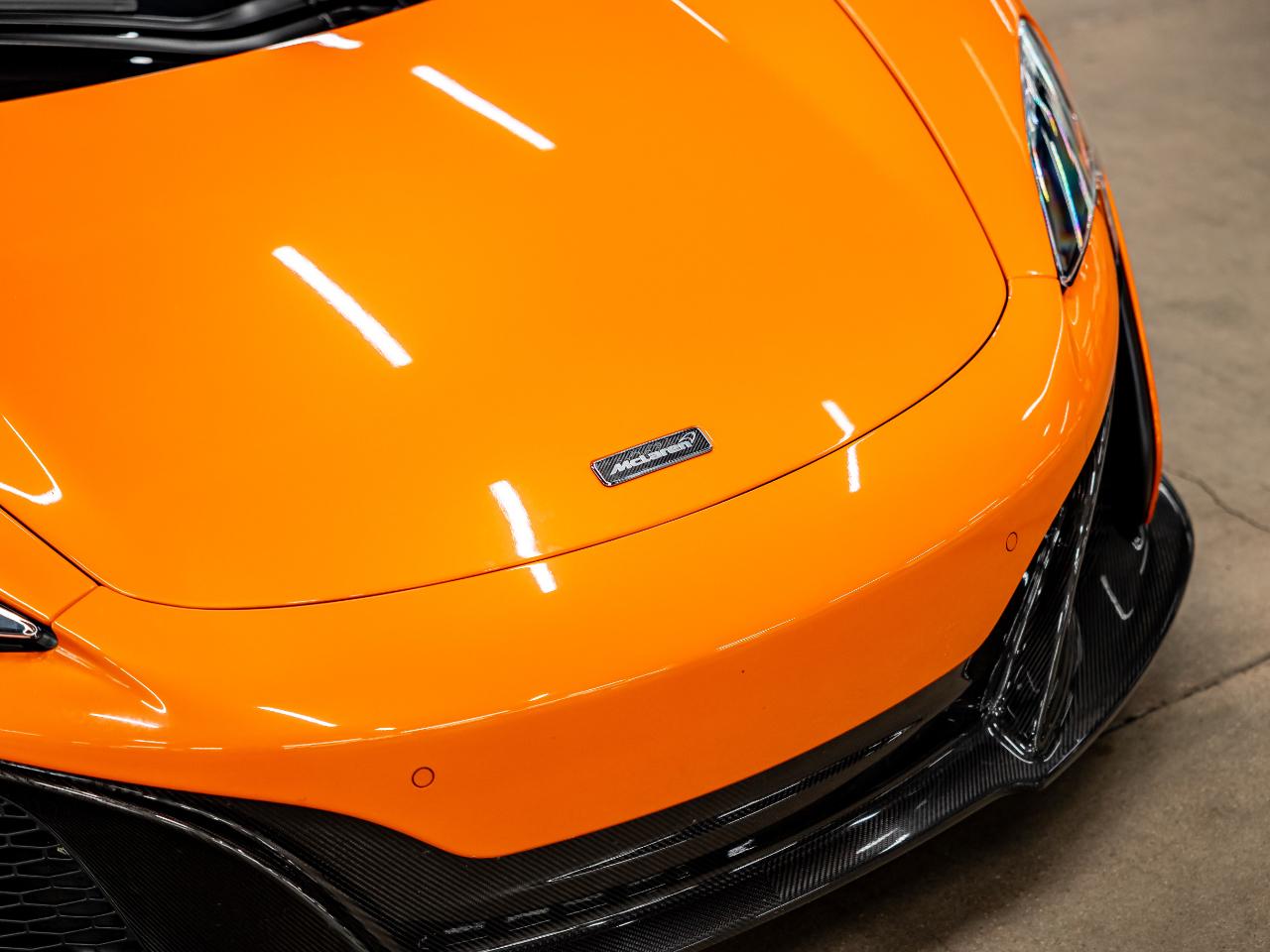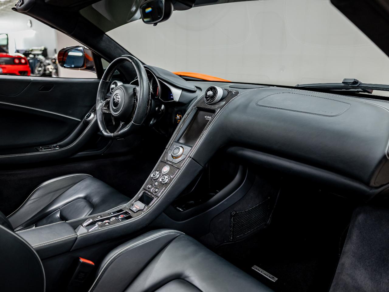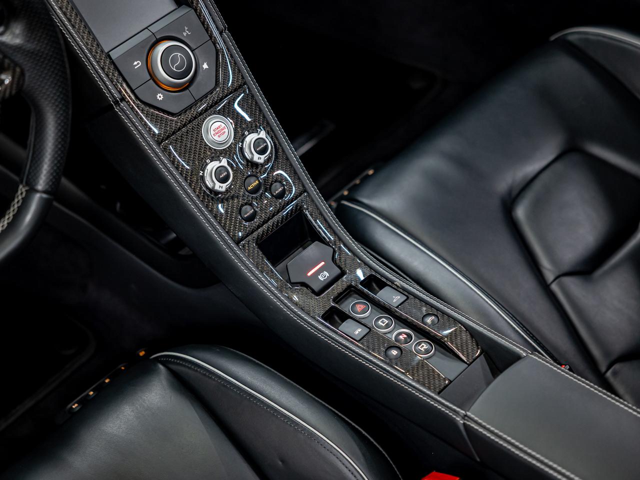 This 650S features the carbon fiber exterior upgrade package, which includes a carbon fiber front splitter, door blades, mirrors, side skirts, and rear bumper. It also comes equipped with carbon-ceramic brakes and orange-painted brake calipers, power-adjustable heated seats, dual-zone climate control, a power-retractable hardtop, a navigation system with a Meridian sound system, and front and rear parking sensors with a backup camera.