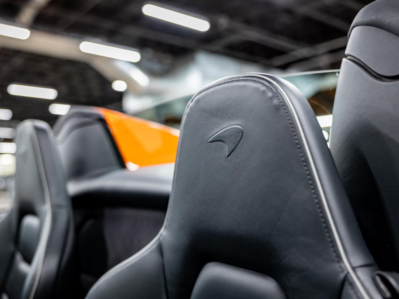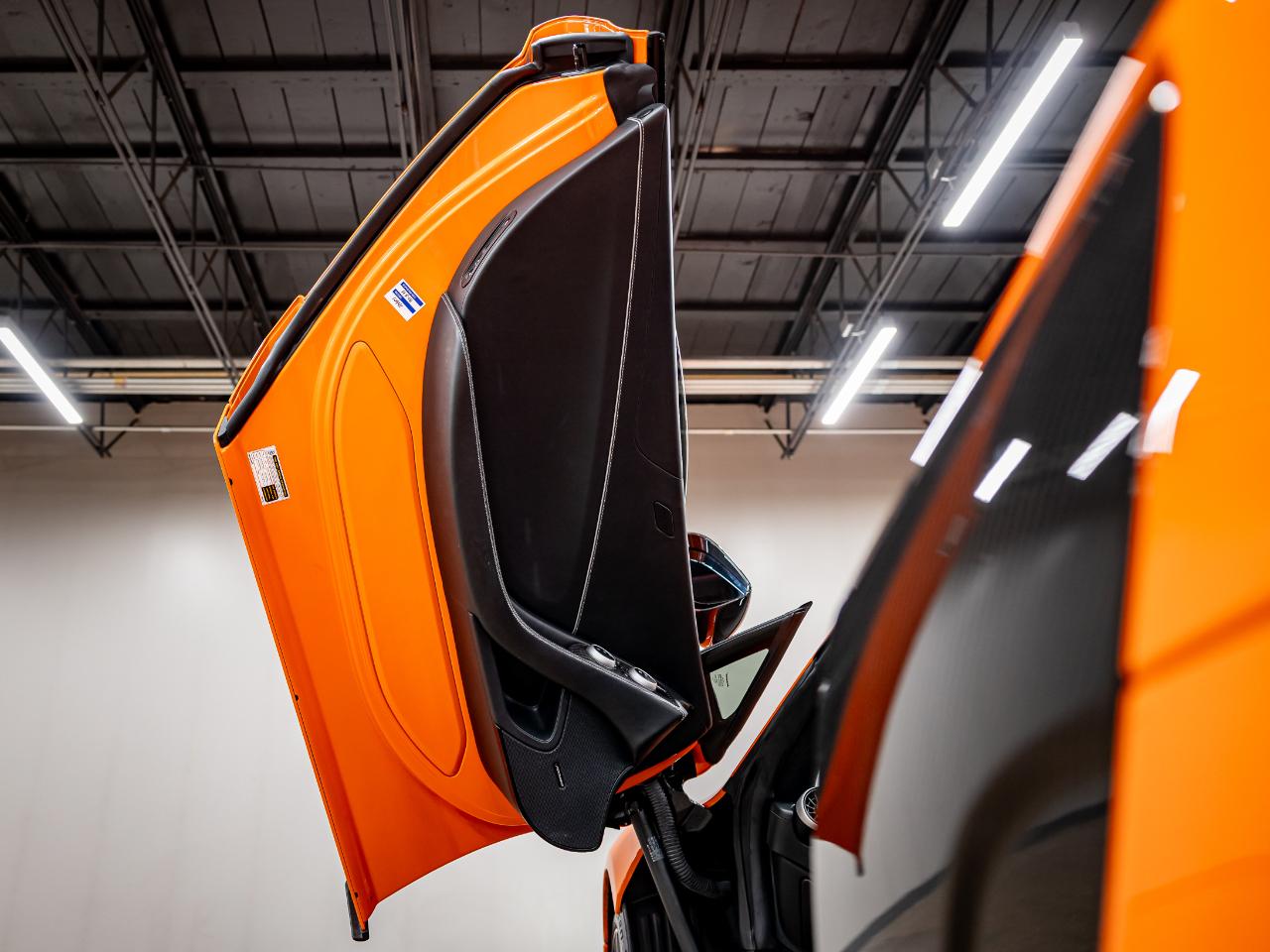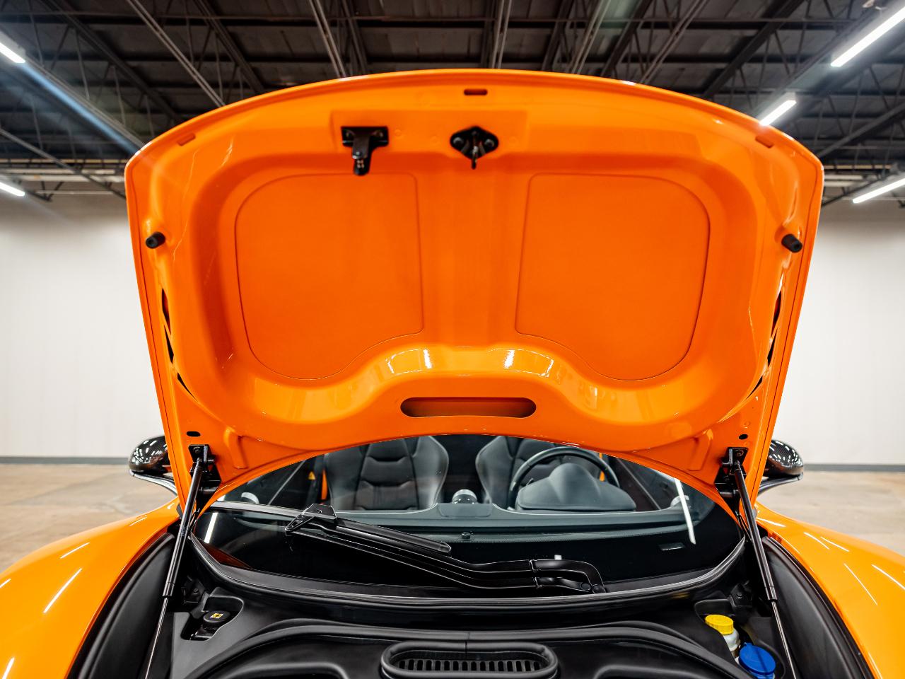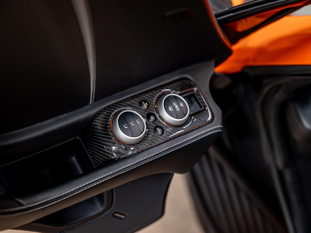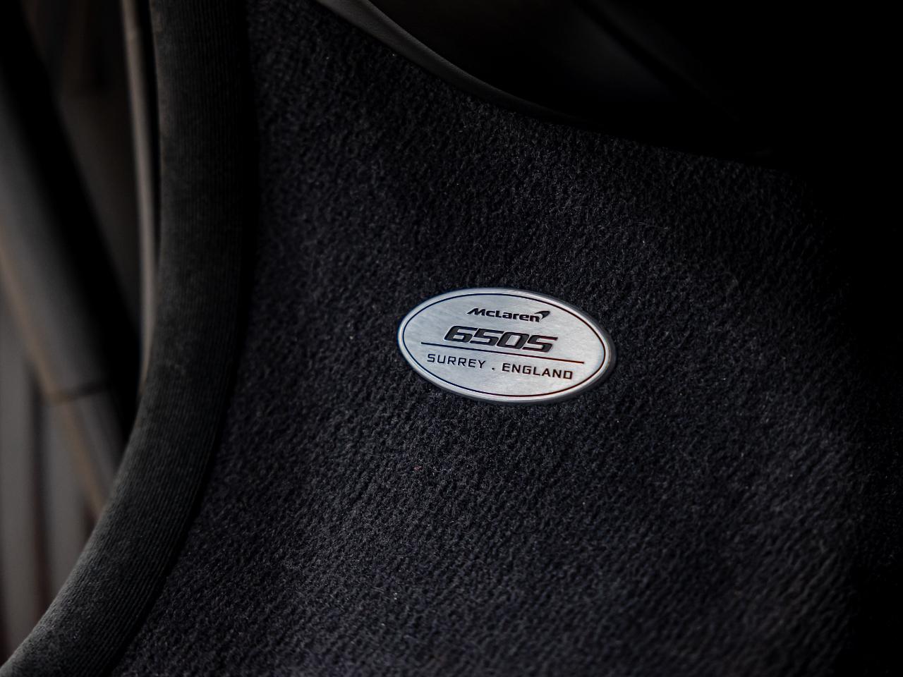 This 650S features the carbon fiber exterior upgrade package, which includes a carbon fiber front splitter, door blades, mirrors, side skirts, and rear bumper. It also comes equipped with carbon-ceramic brakes and orange-painted brake calipers, power-adjustable heated seats, dual-zone climate control, a power-retractable hardtop, a navigation system with a Meridian sound system, and front and rear parking sensors with a backup camera.
