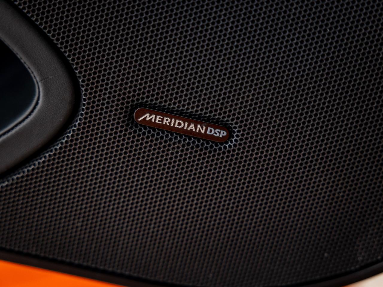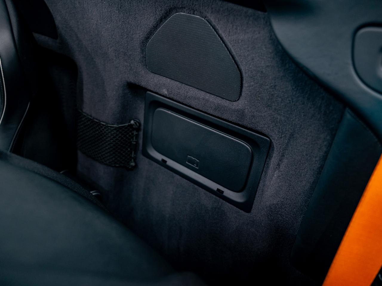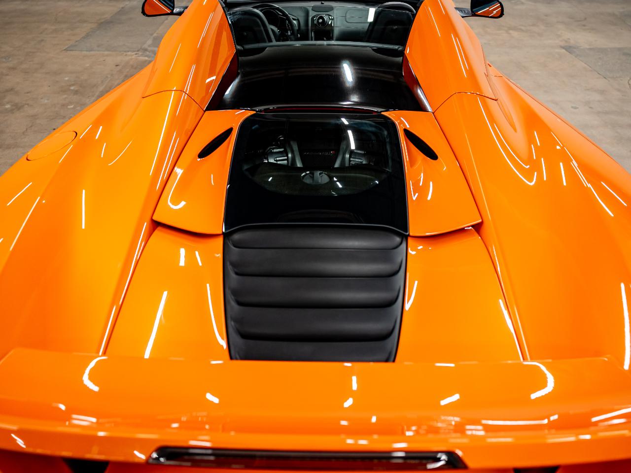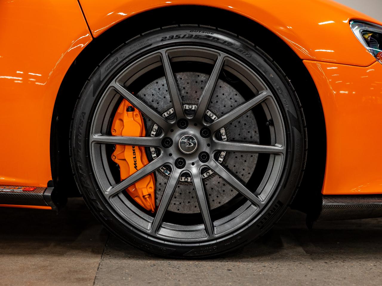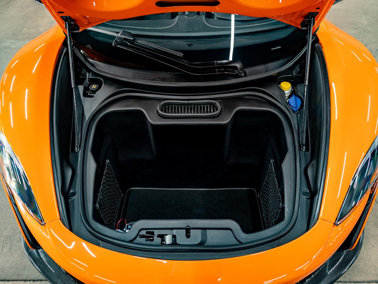 This 650S features the carbon fiber exterior upgrade package, which includes a carbon fiber front splitter, door blades, mirrors, side skirts, and rear bumper. It also comes equipped with carbon-ceramic brakes and orange-painted brake calipers, power-adjustable heated seats, dual-zone climate control, a power-retractable hardtop, a navigation system with a Meridian sound system, and front and rear parking sensors with a backup camera.