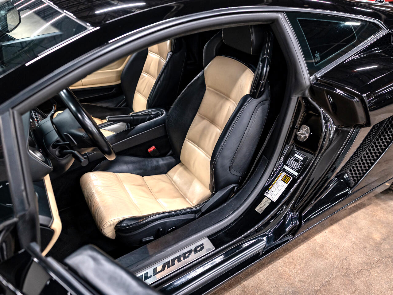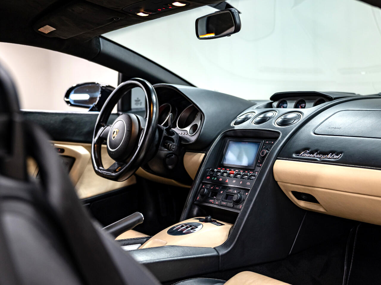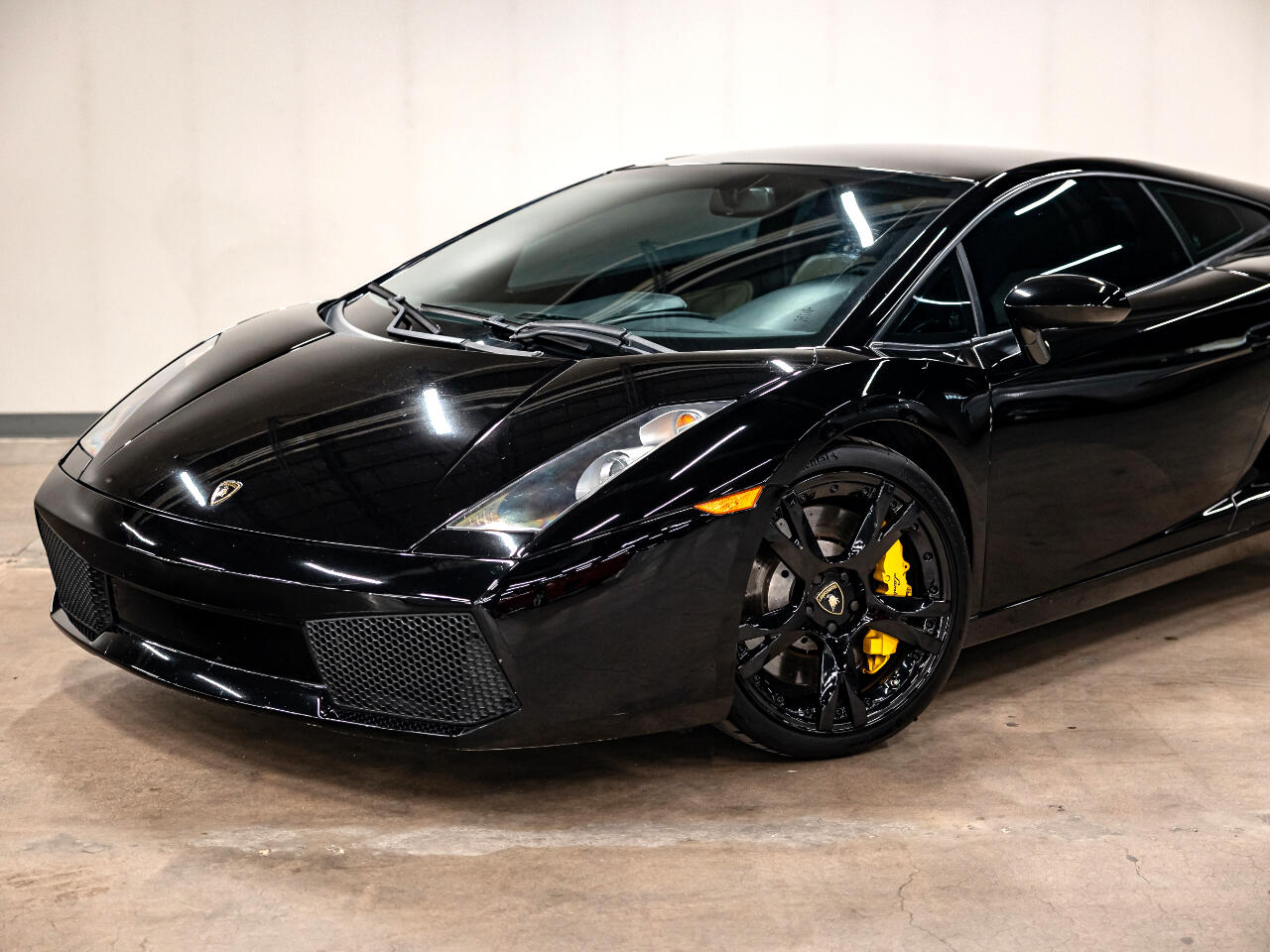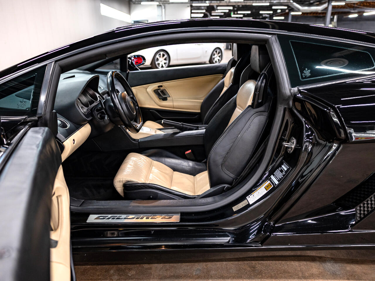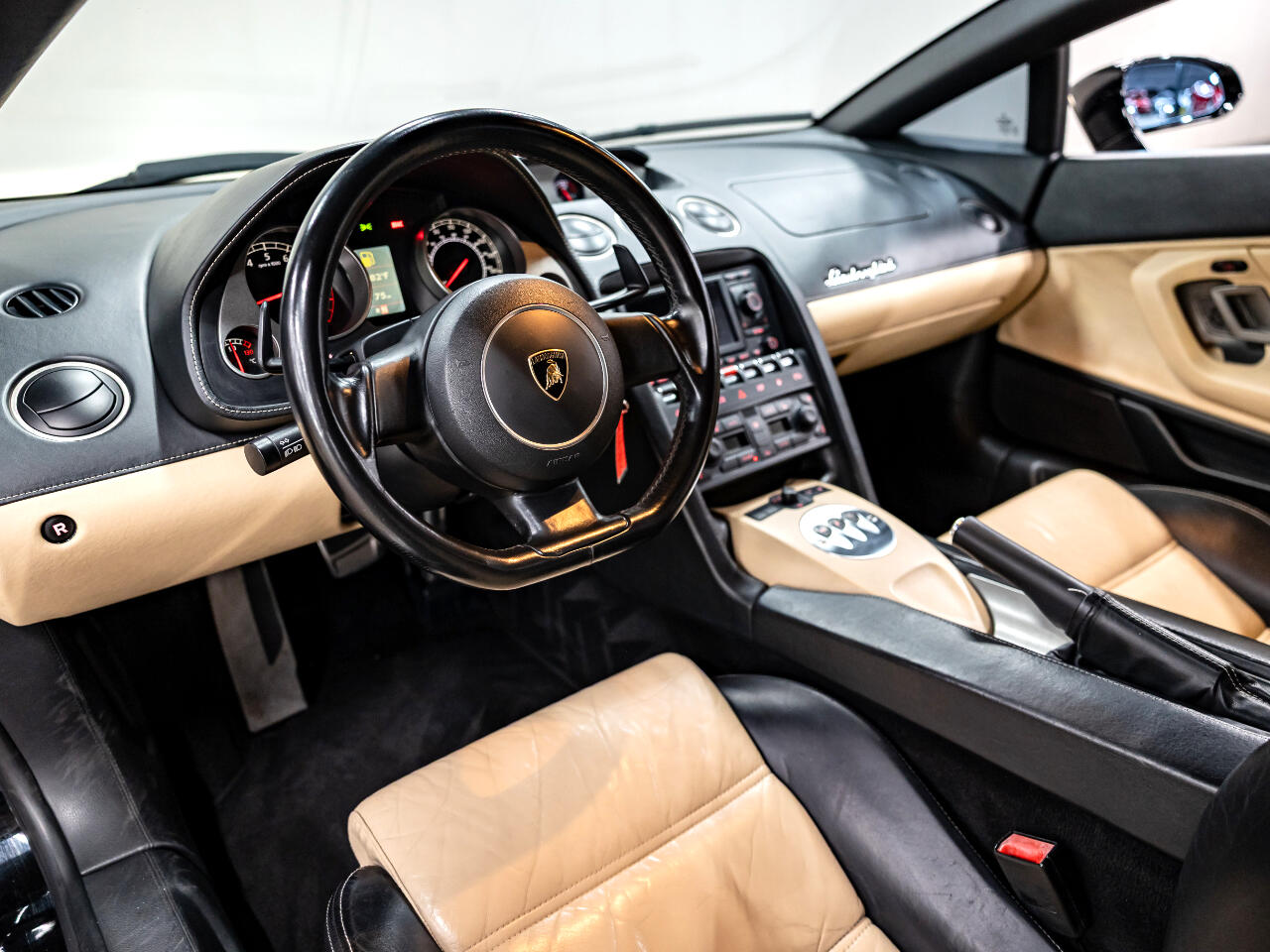 This 2006 Lamborghini Gallardo Coupe is finished in Nero Noctis over a black and beige bi-color leather interior. Power comes from a 5.0L V10 producing 493 hp and 376 lb-ft of torque, sent to all four wheels through a 6-speed “E-Gear” automated manual transmission.