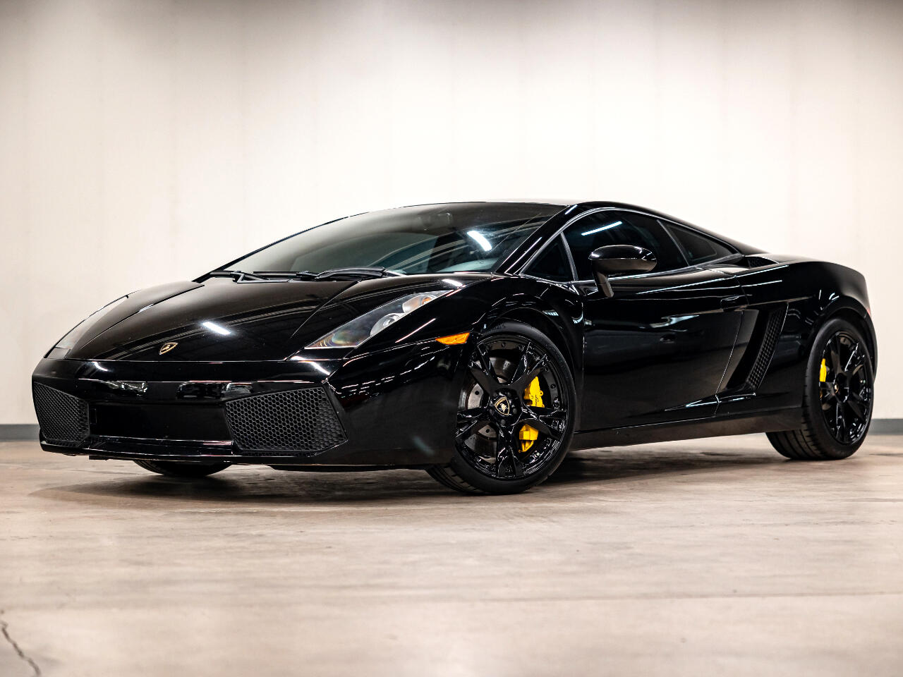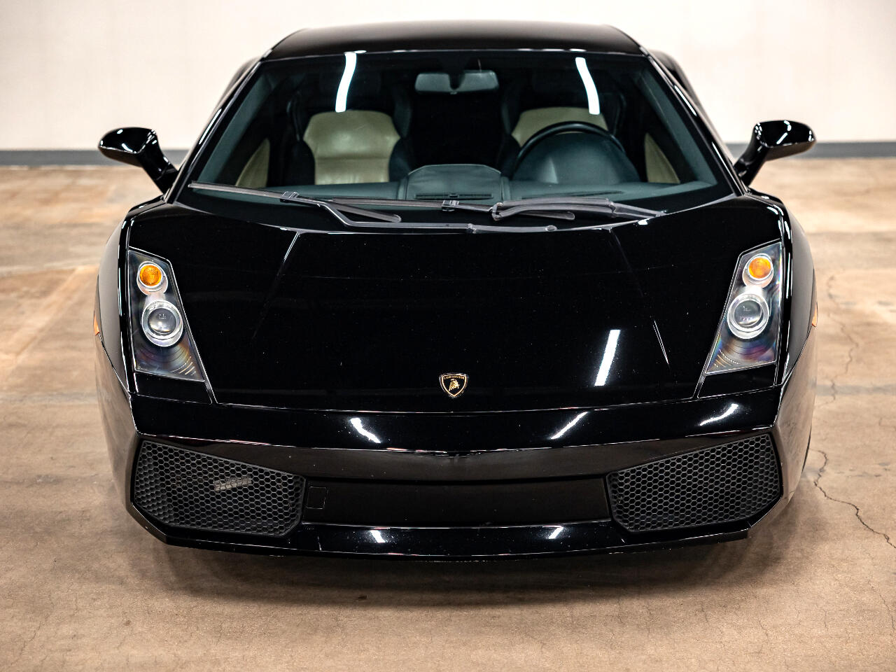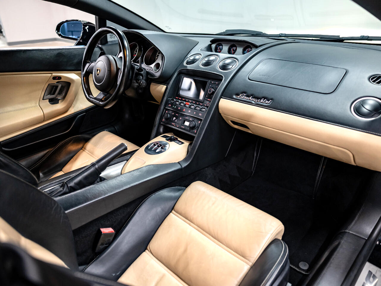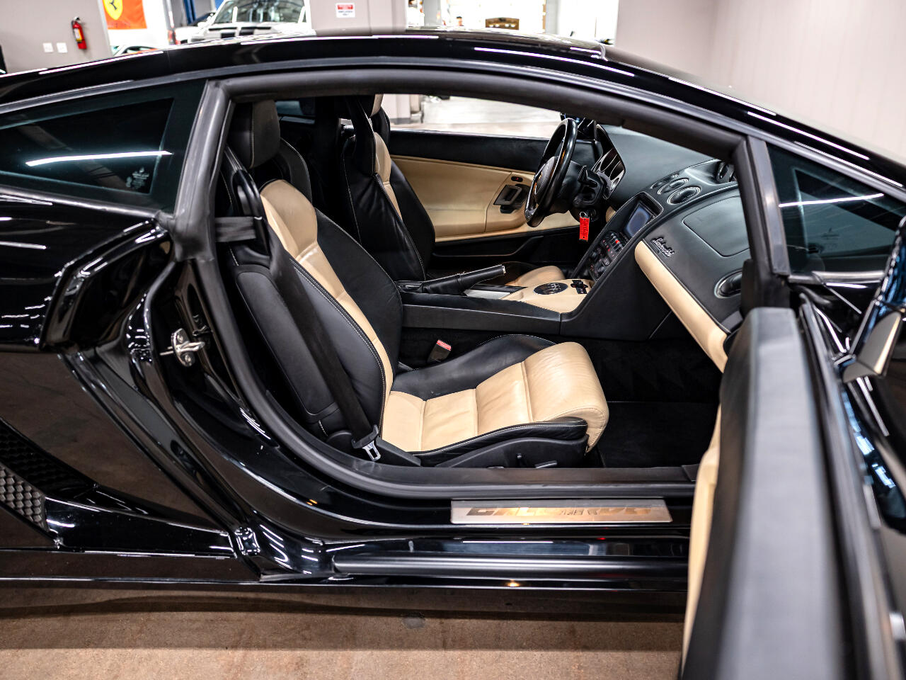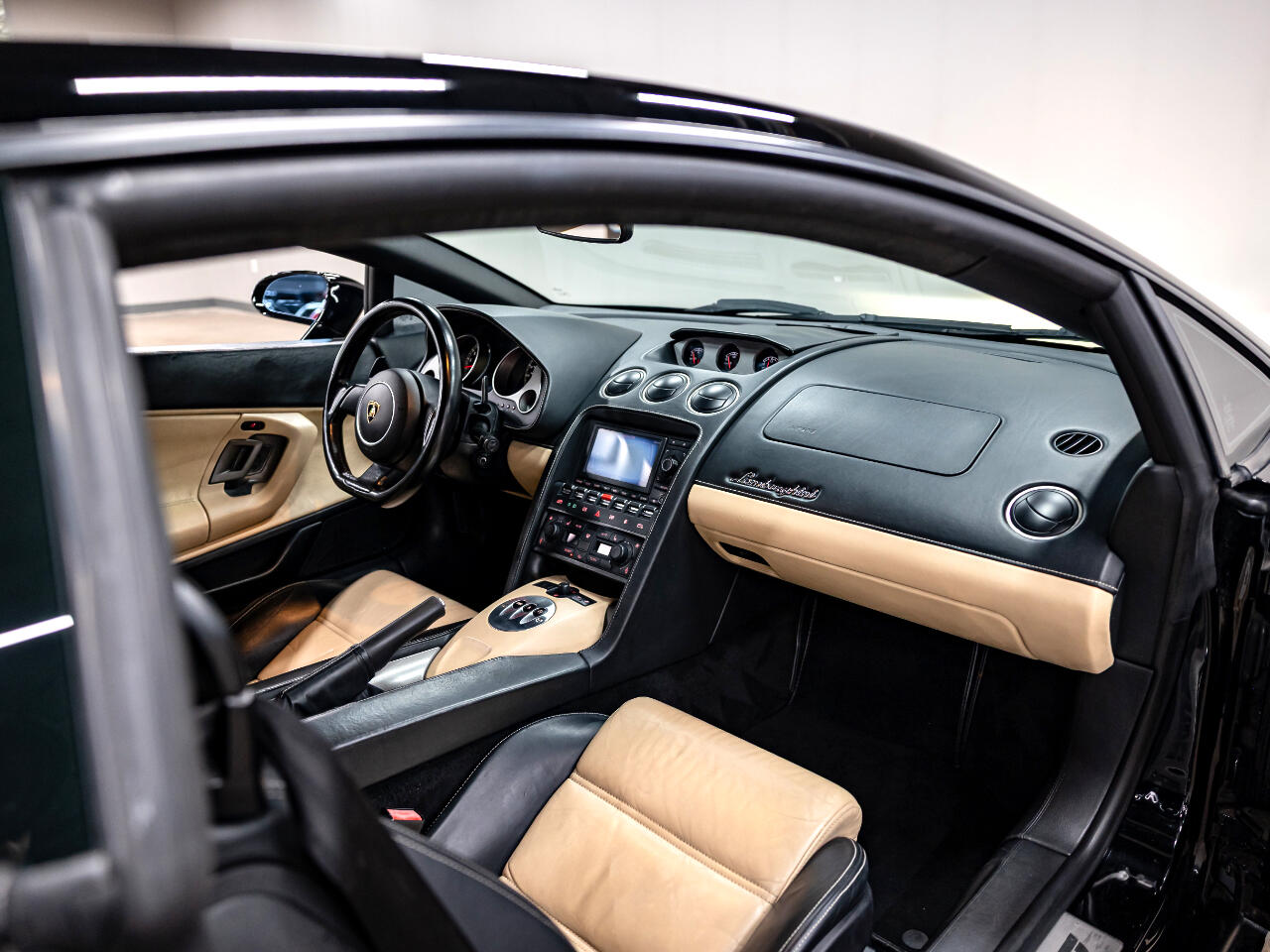 This 2006 Lamborghini Gallardo Coupe is finished in Nero Noctis over a black and beige bi-color leather interior. Power comes from a 5.0L V10 producing 493 hp and 376 lb-ft of torque, sent to all four wheels through a 6-speed “E-Gear” automated manual transmission.