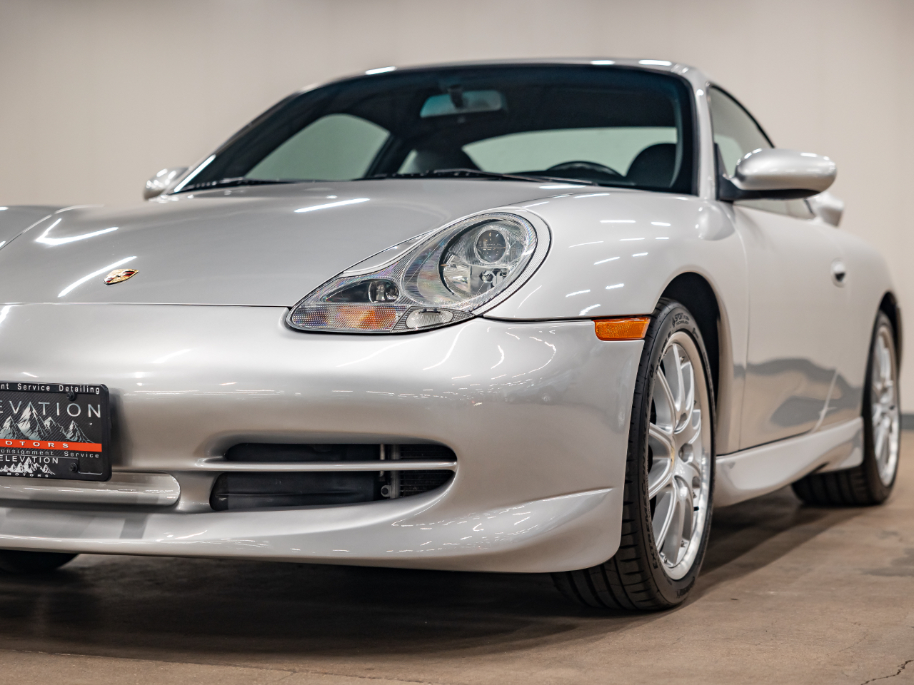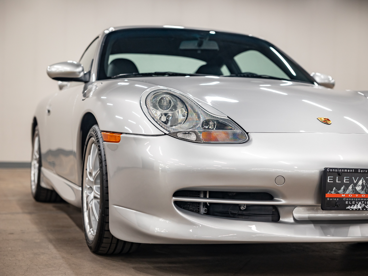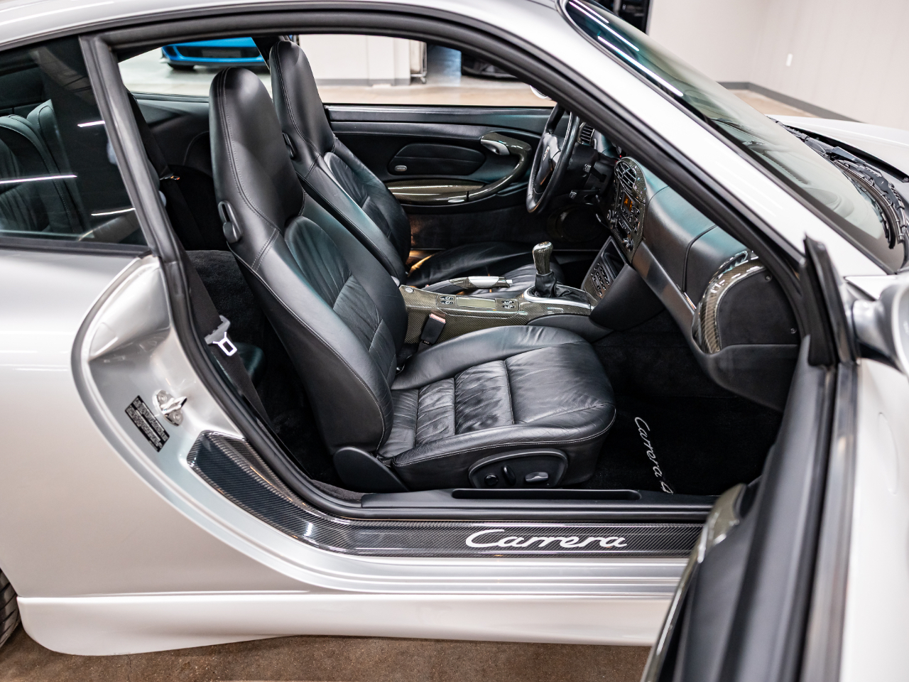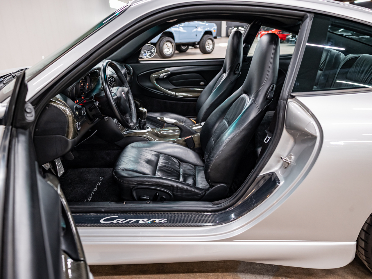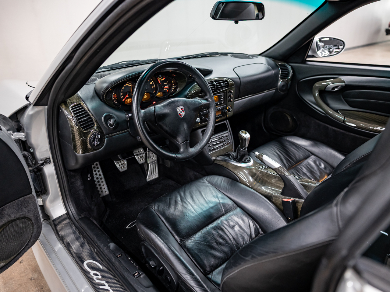 This 2001 Porsche 911 Carrera 4 Factory Aerokit is finished in Arctic Silver Metallic over a black full leather interior with the Full Carbon Interior Package. Power comes from a 3.4L flat-6 producing 300 hp and 258 lb-ft of torque, sent to all four wheels through a 6-speed manual transmission.