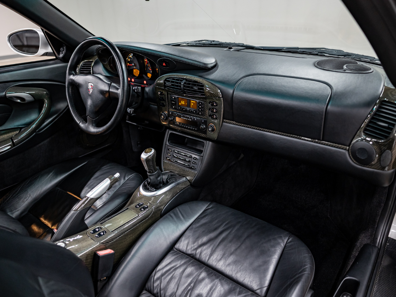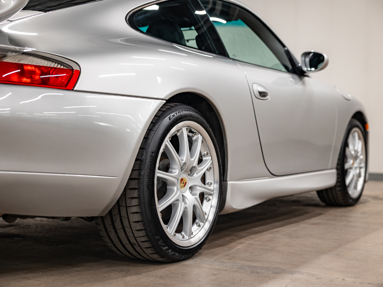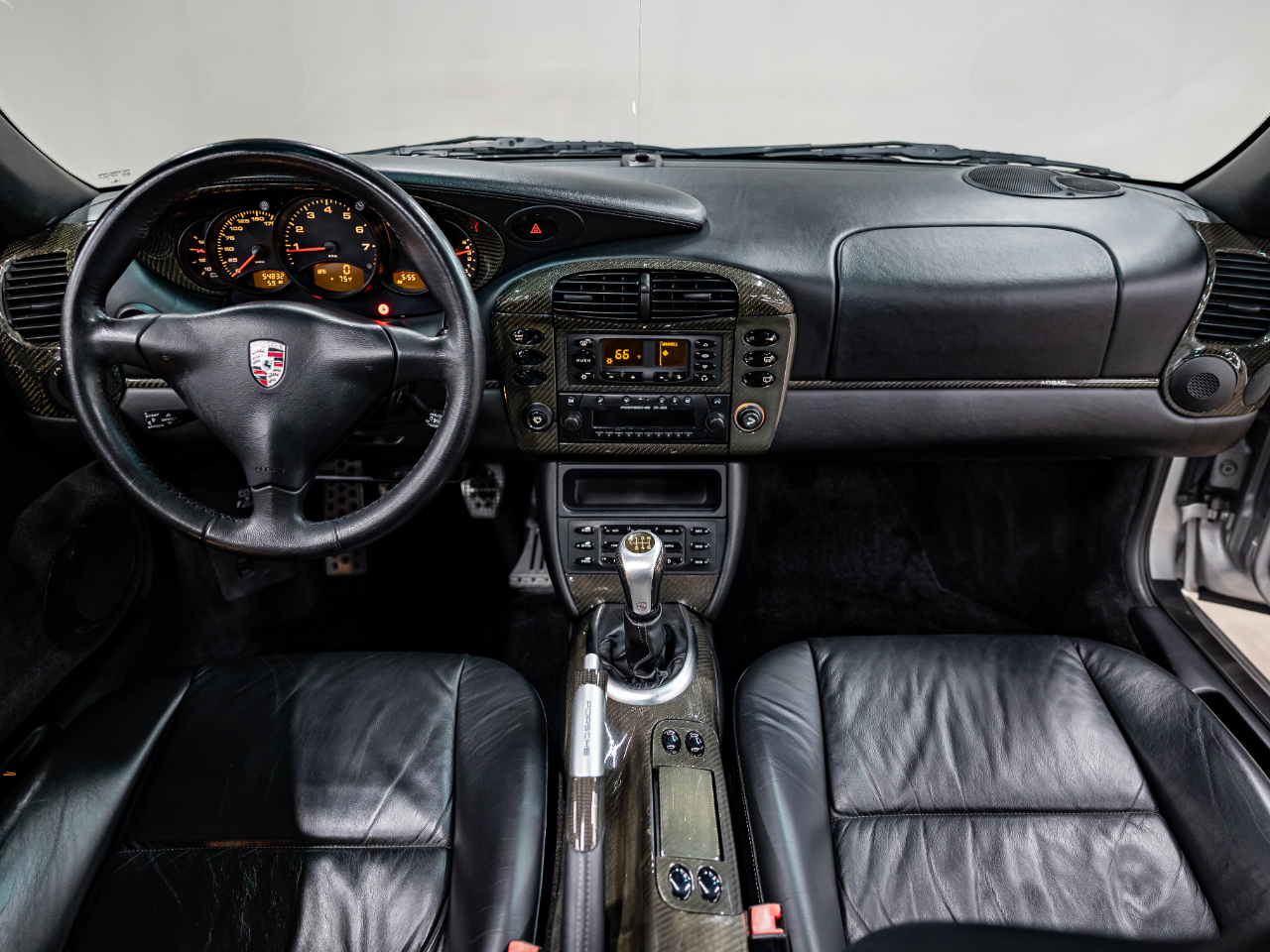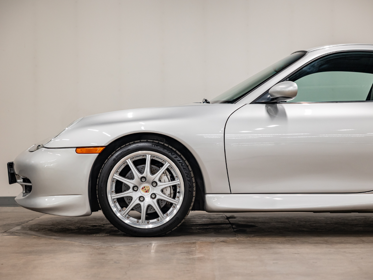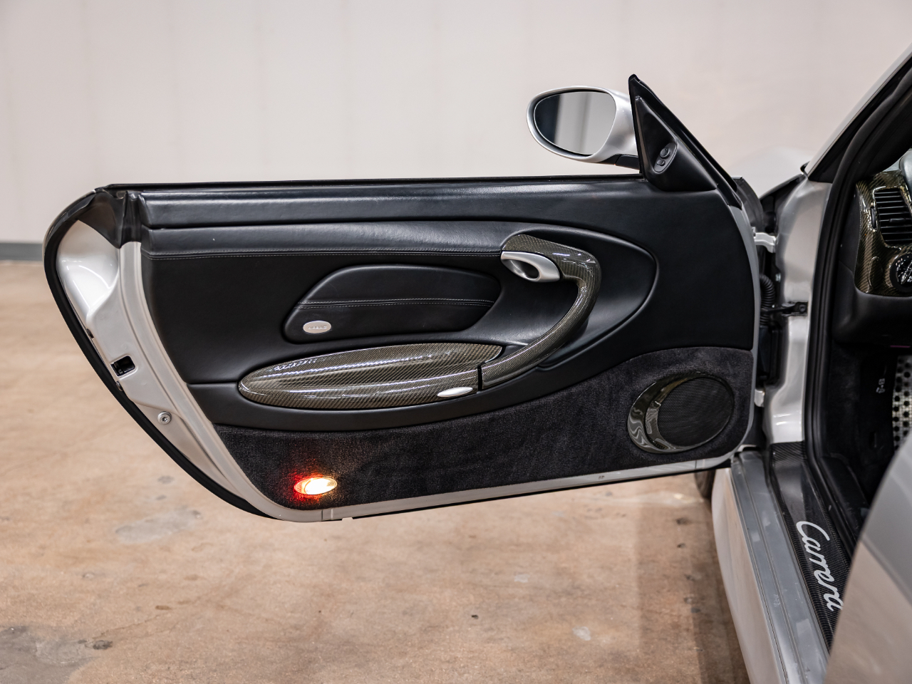 This 2001 Porsche 911 Carrera 4 Factory Aerokit is finished in Arctic Silver Metallic over a black full leather interior with the Full Carbon Interior Package. Power comes from a 3.4L flat-6 producing 300 hp and 258 lb-ft of torque, sent to all four wheels through a 6-speed manual transmission.