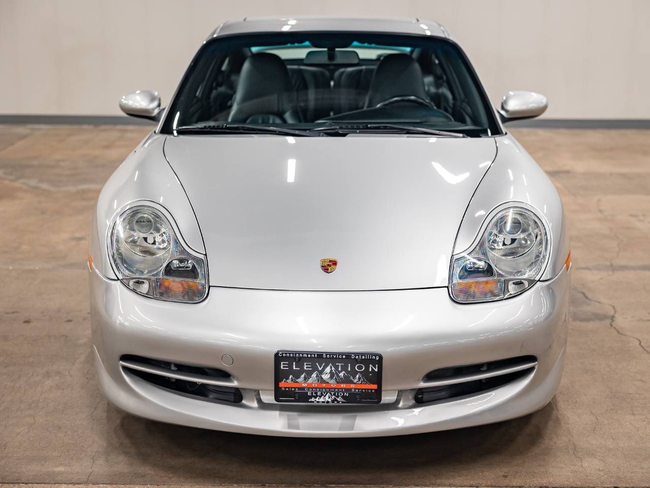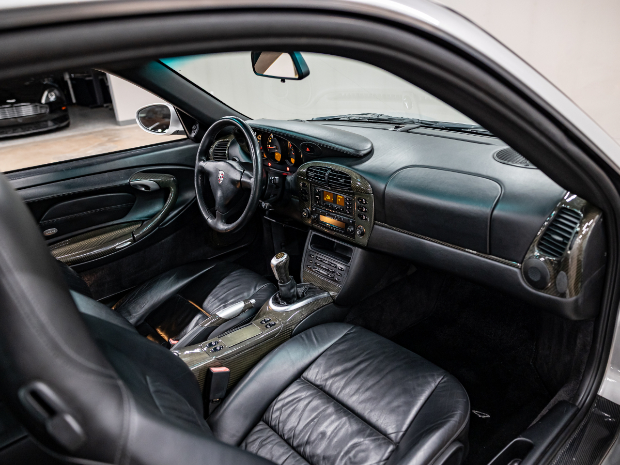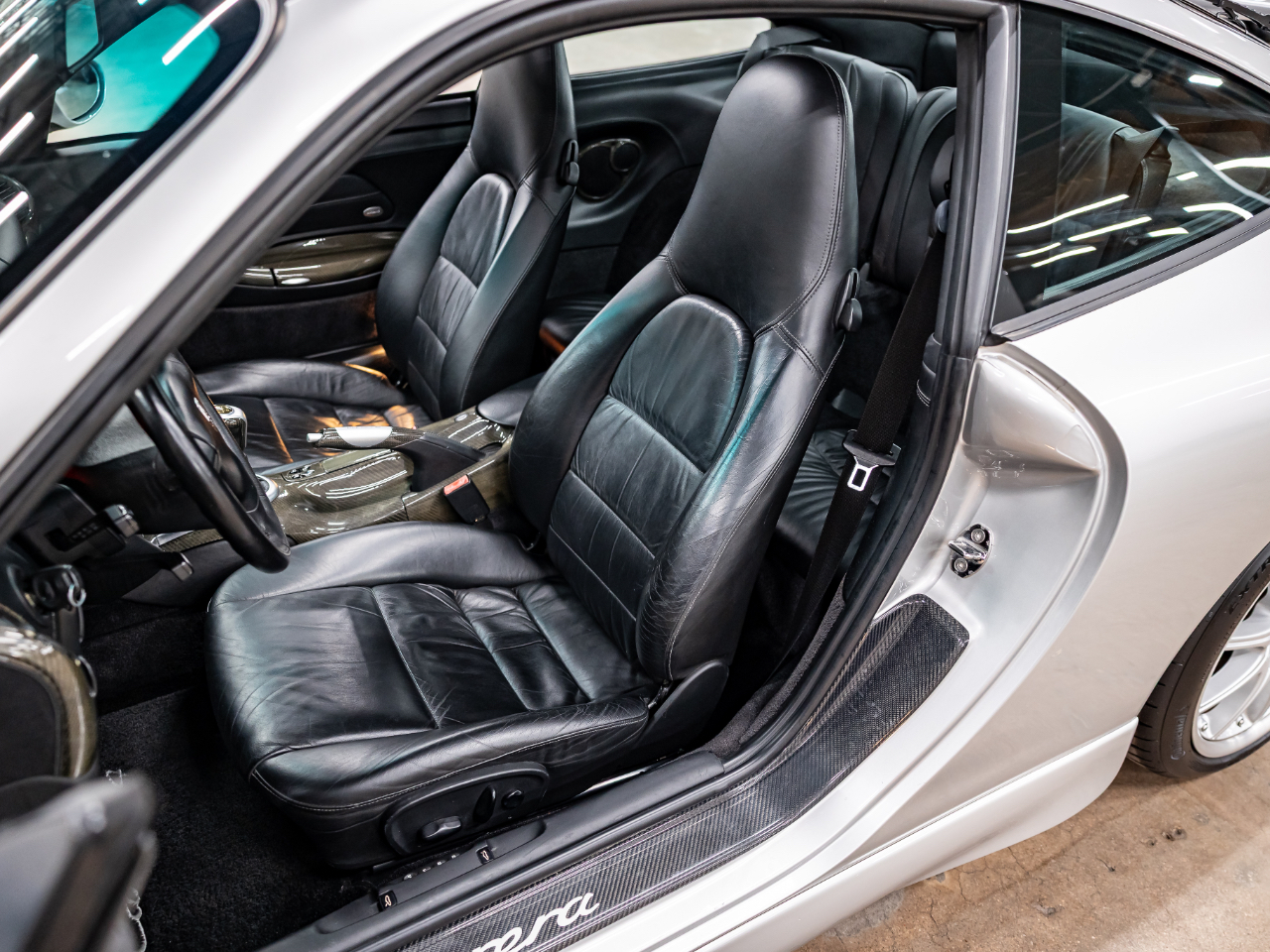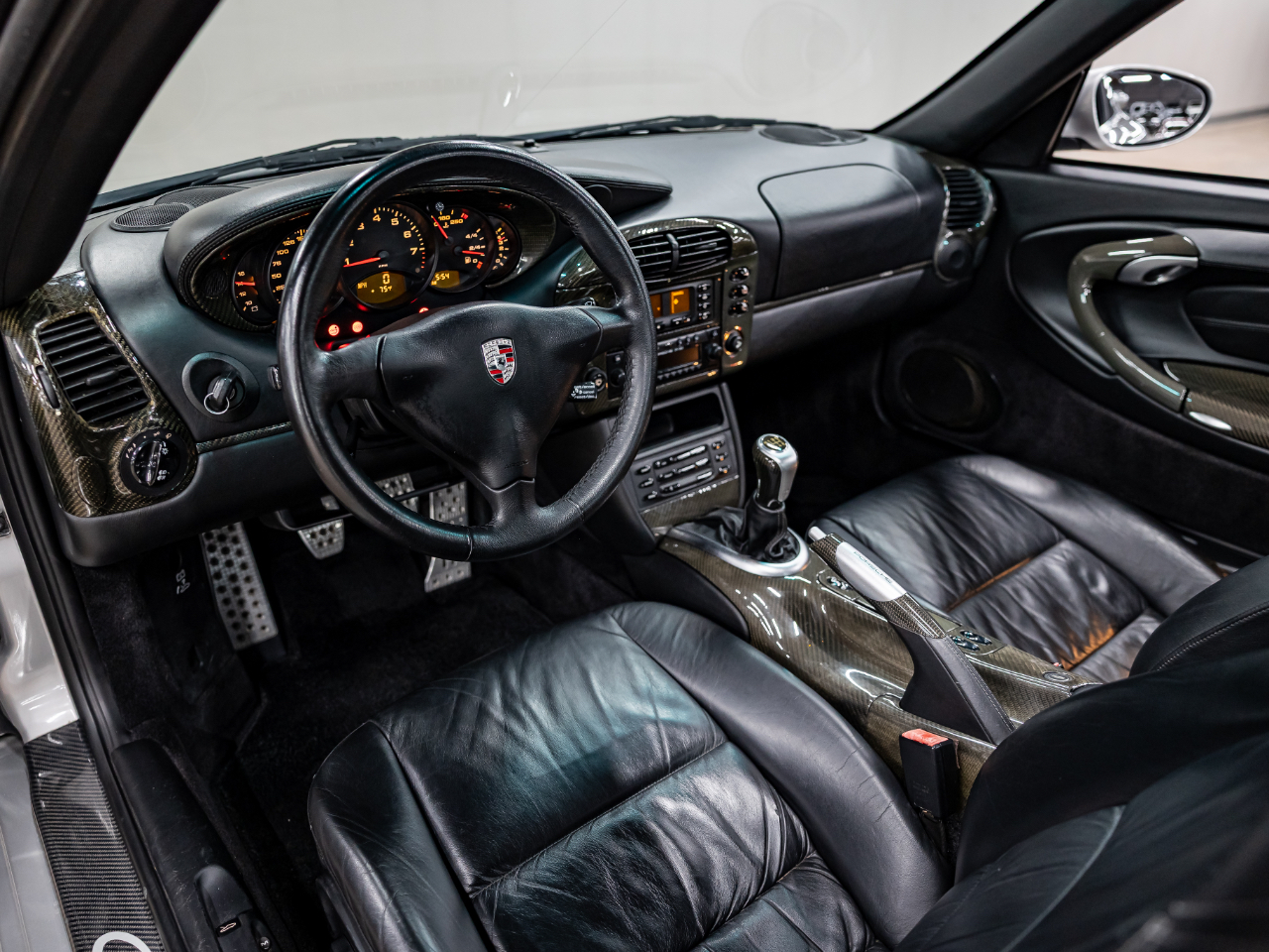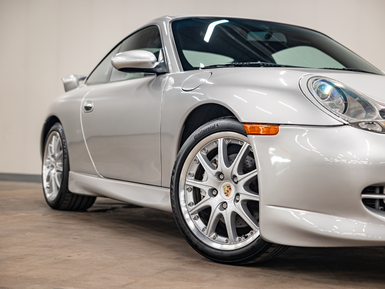 This 2001 Porsche 911 Carrera 4 Factory Aerokit is finished in Arctic Silver Metallic over a black full leather interior with the Full Carbon Interior Package. Power comes from a 3.4L flat-6 producing 300 hp and 258 lb-ft of torque, sent to all four wheels through a 6-speed manual transmission.