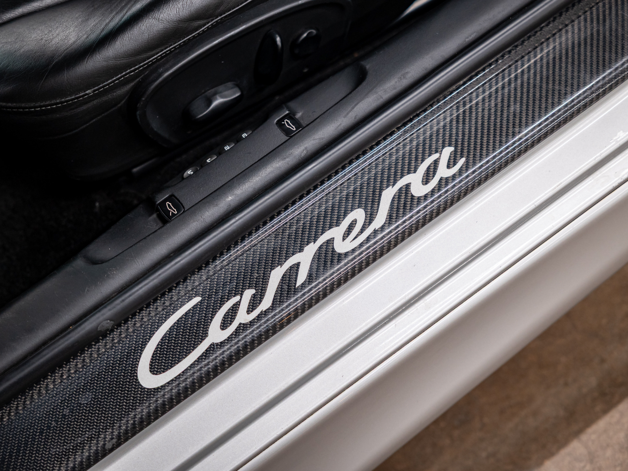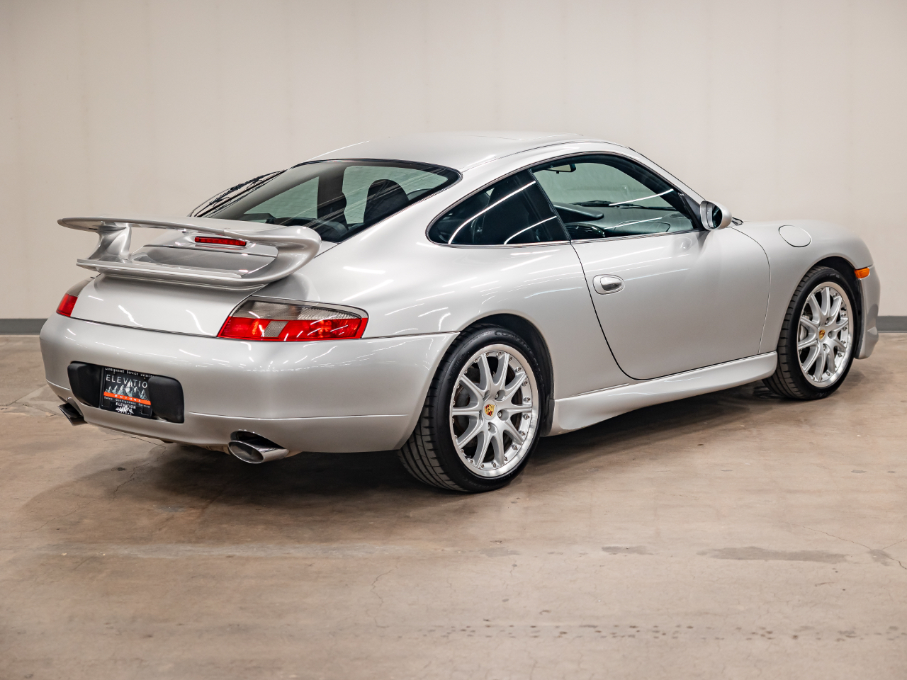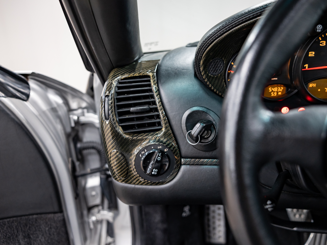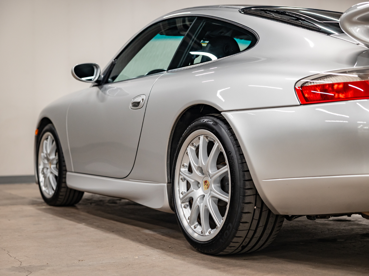 This 2001 Porsche 911 Carrera 4 Factory Aerokit is finished in Arctic Silver Metallic over a black full leather interior with the Full Carbon Interior Package. Power comes from a 3.4L flat-6 producing 300 hp and 258 lb-ft of torque, sent to all four wheels through a 6-speed manual transmission.