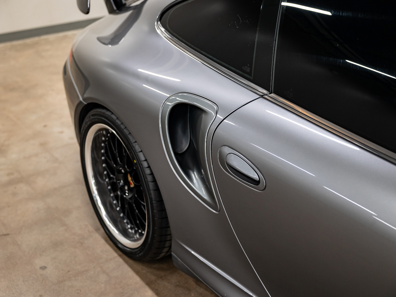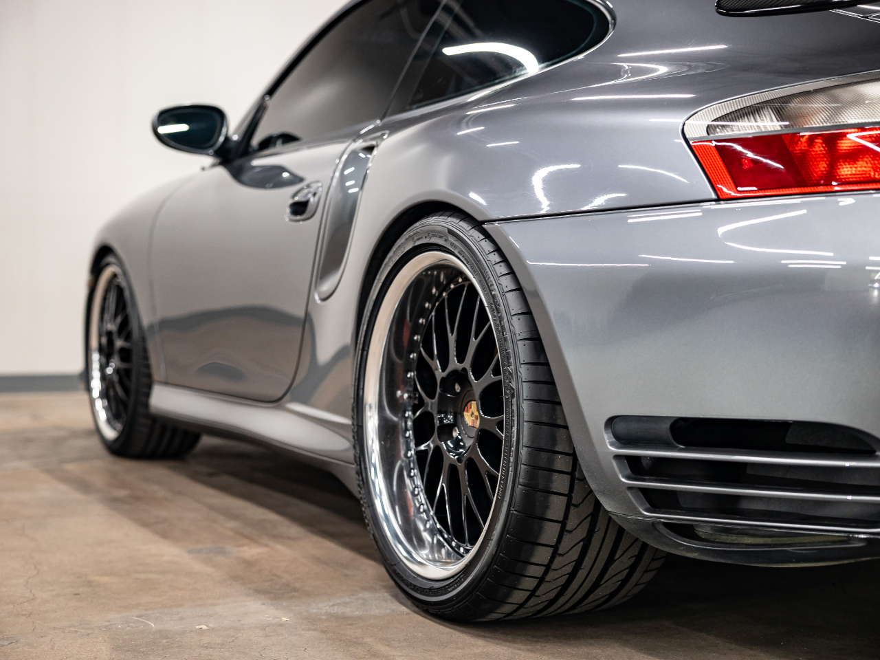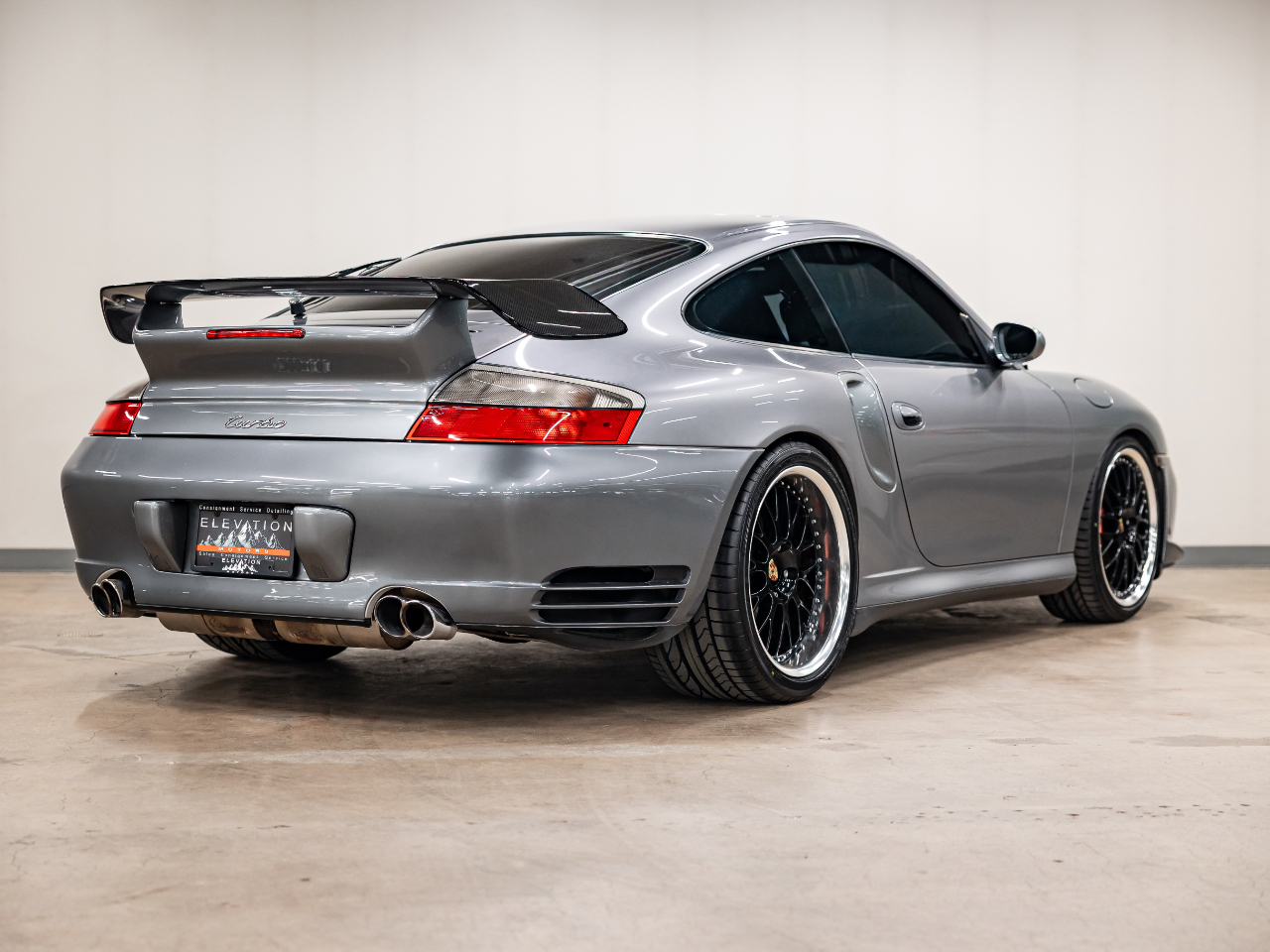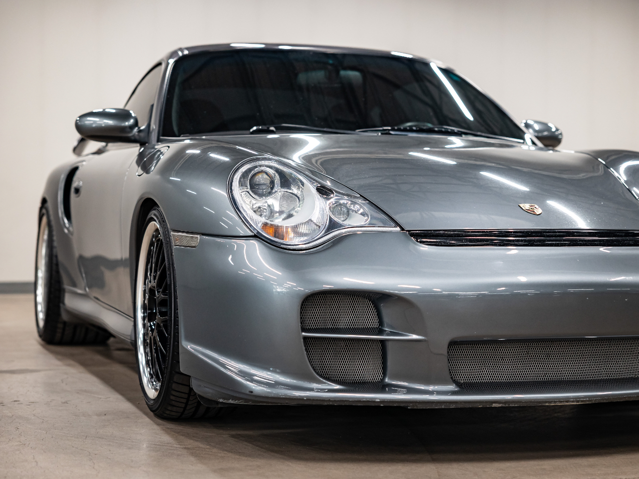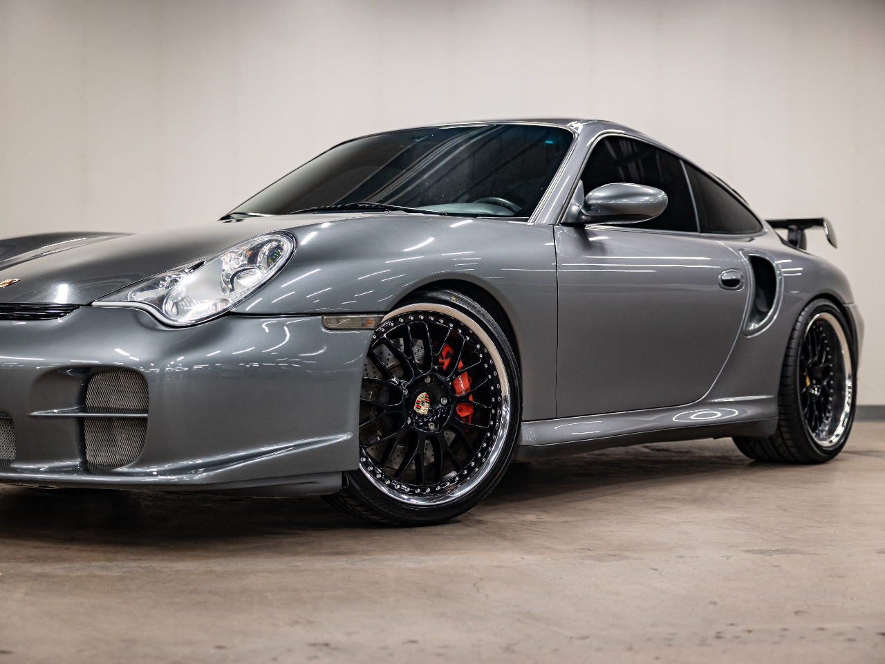 This 2002 Porsche 911 Turbo is finished in Seal Gray Metallic over Black Leather and is powered by a built twin-turbocharged 3.6-liter flat-six paired with a 6-speed manual transmission and all-wheel drive. The engine was professionally rebuilt in 2019 at a cost of approximately $20,000 and has fewer than 30,000 miles since the build, featuring Carrillo connecting rods, a 102.7mm piston and cylinder set, ID1300 fuel injectors, rebuilt cylinder heads, and welded coolant lines—creating a significantly strengthened foundation for the upgraded turbo system. Factory output was rated at 415 horsepower and 413 lb-ft of torque, though real-world figures are expected to be notably higher with these enhancements.