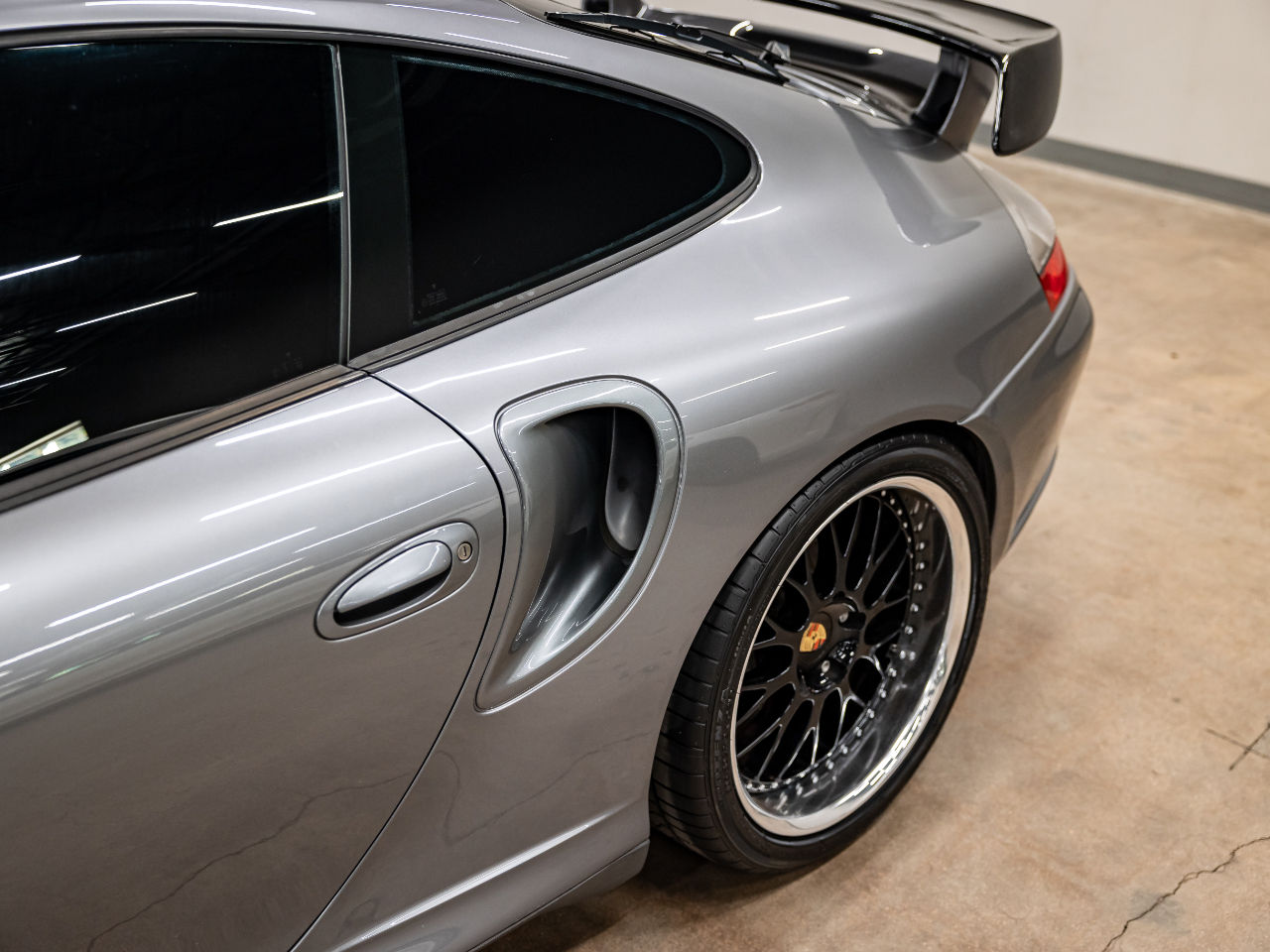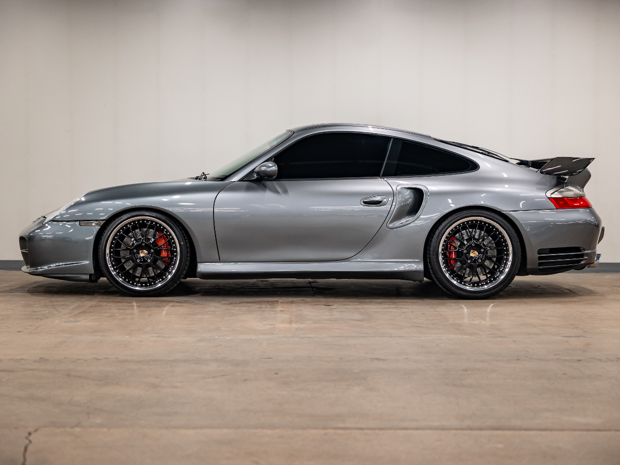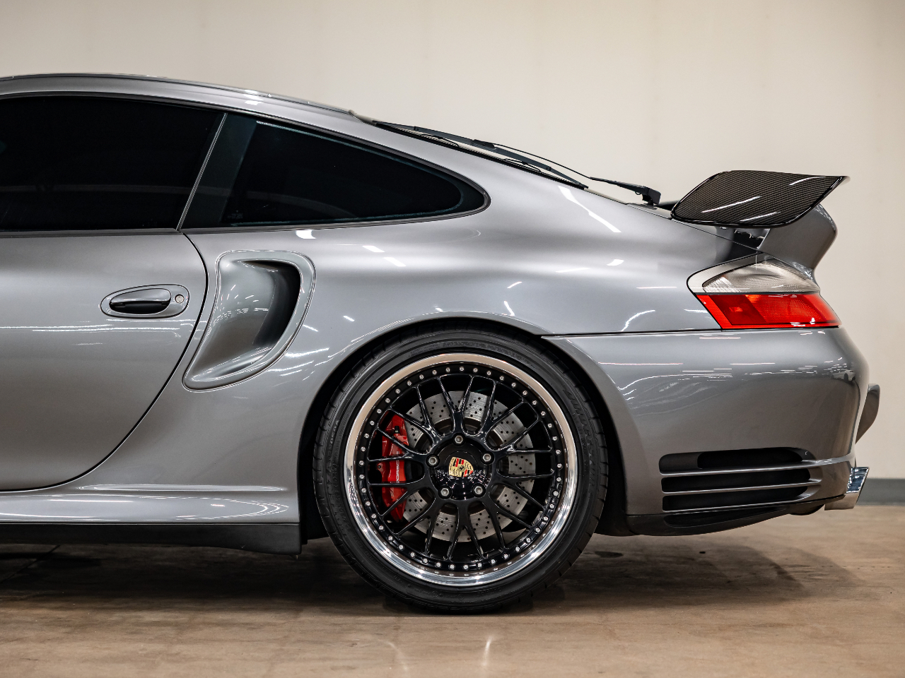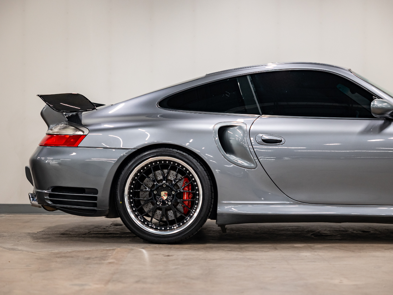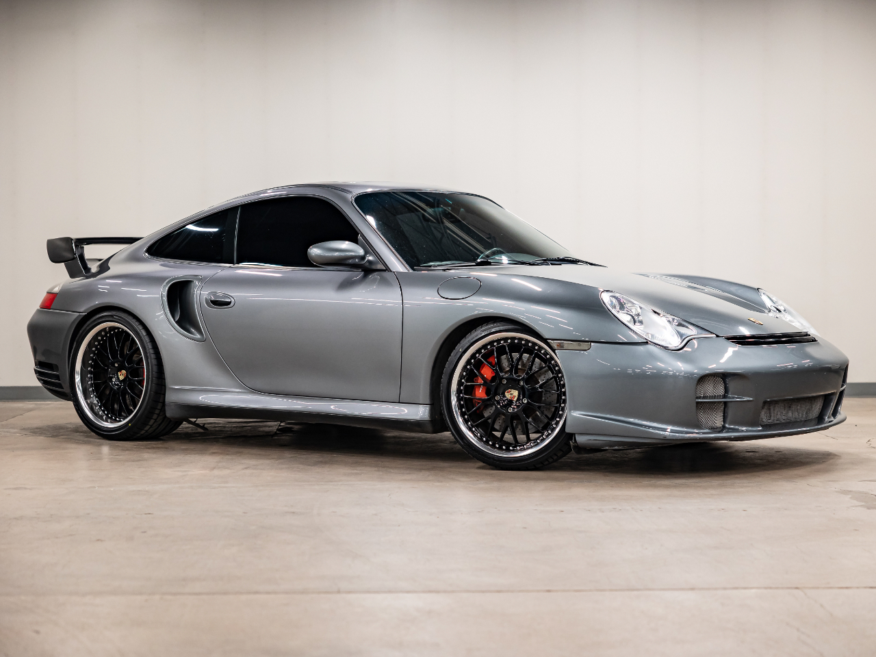 This 2002 Porsche 911 Turbo is finished in Seal Gray Metallic over Black Leather and is powered by a built twin-turbocharged 3.6-liter flat-six paired with a 6-speed manual transmission and all-wheel drive. The engine was professionally rebuilt in 2019 at a cost of approximately $20,000 and has fewer than 30,000 miles since the build, featuring Carrillo connecting rods, a 102.7mm piston and cylinder set, ID1300 fuel injectors, rebuilt cylinder heads, and welded coolant lines—creating a significantly strengthened foundation for the upgraded turbo system. Factory output was rated at 415 horsepower and 413 lb-ft of torque, though real-world figures are expected to be notably higher with these enhancements.