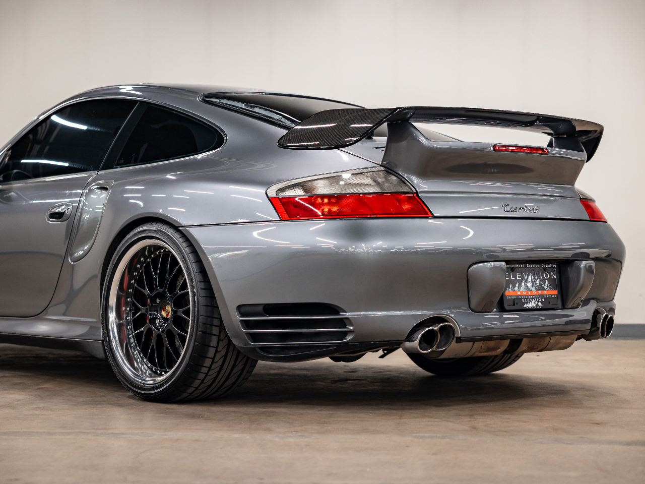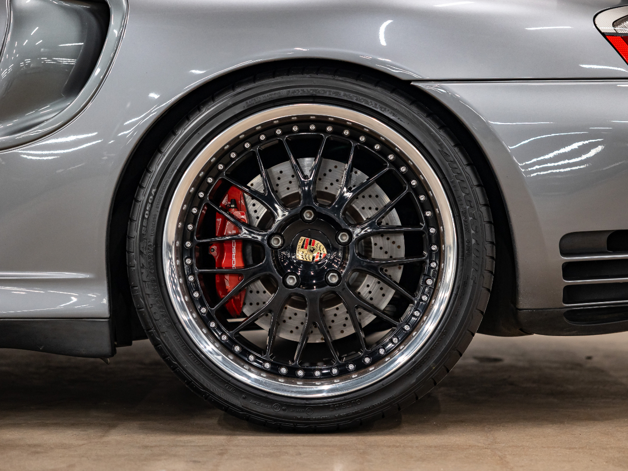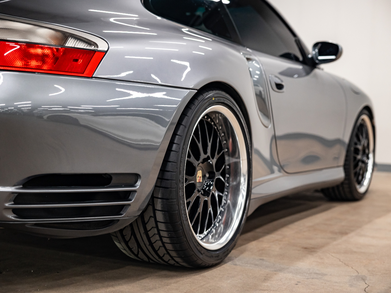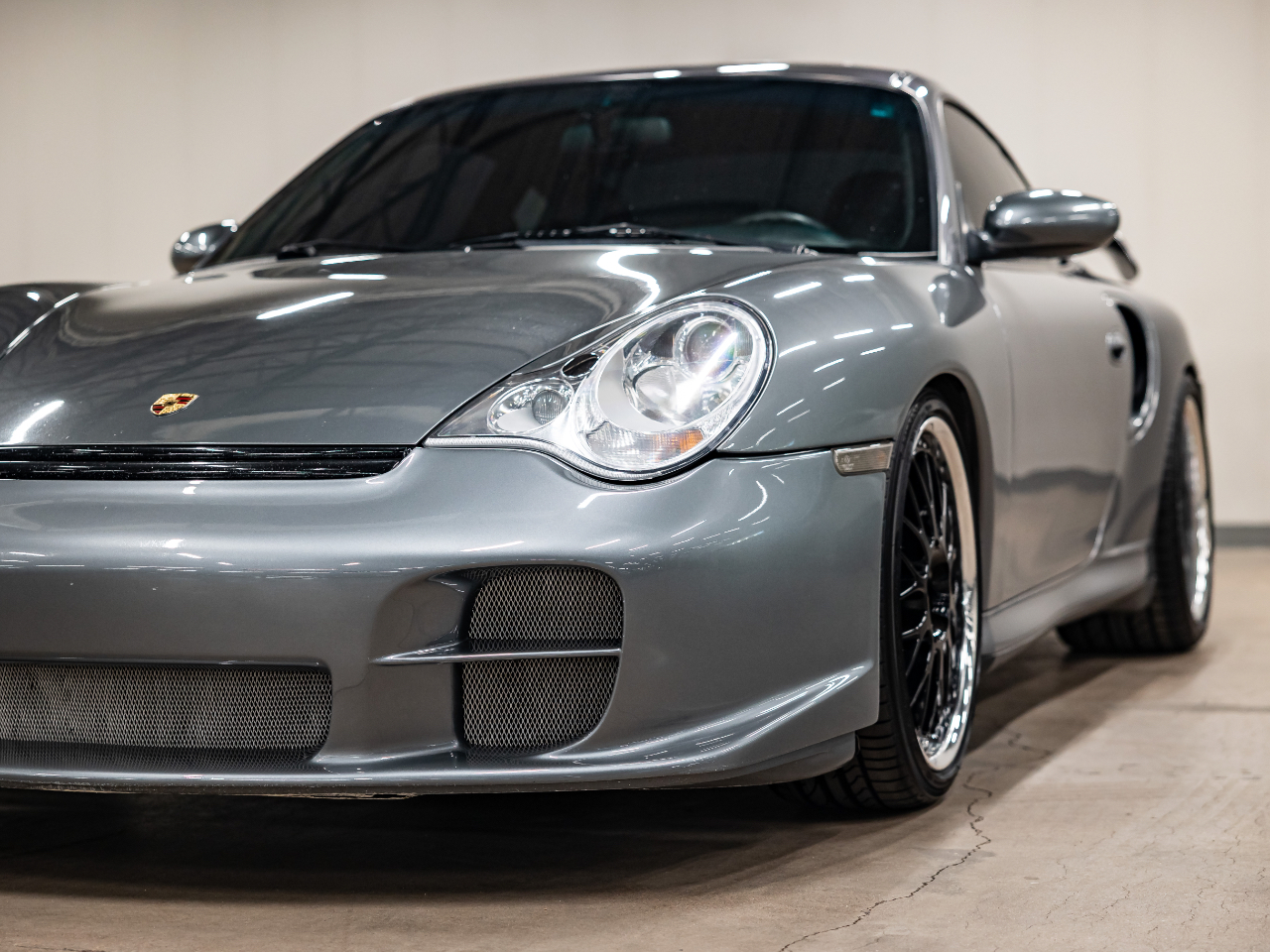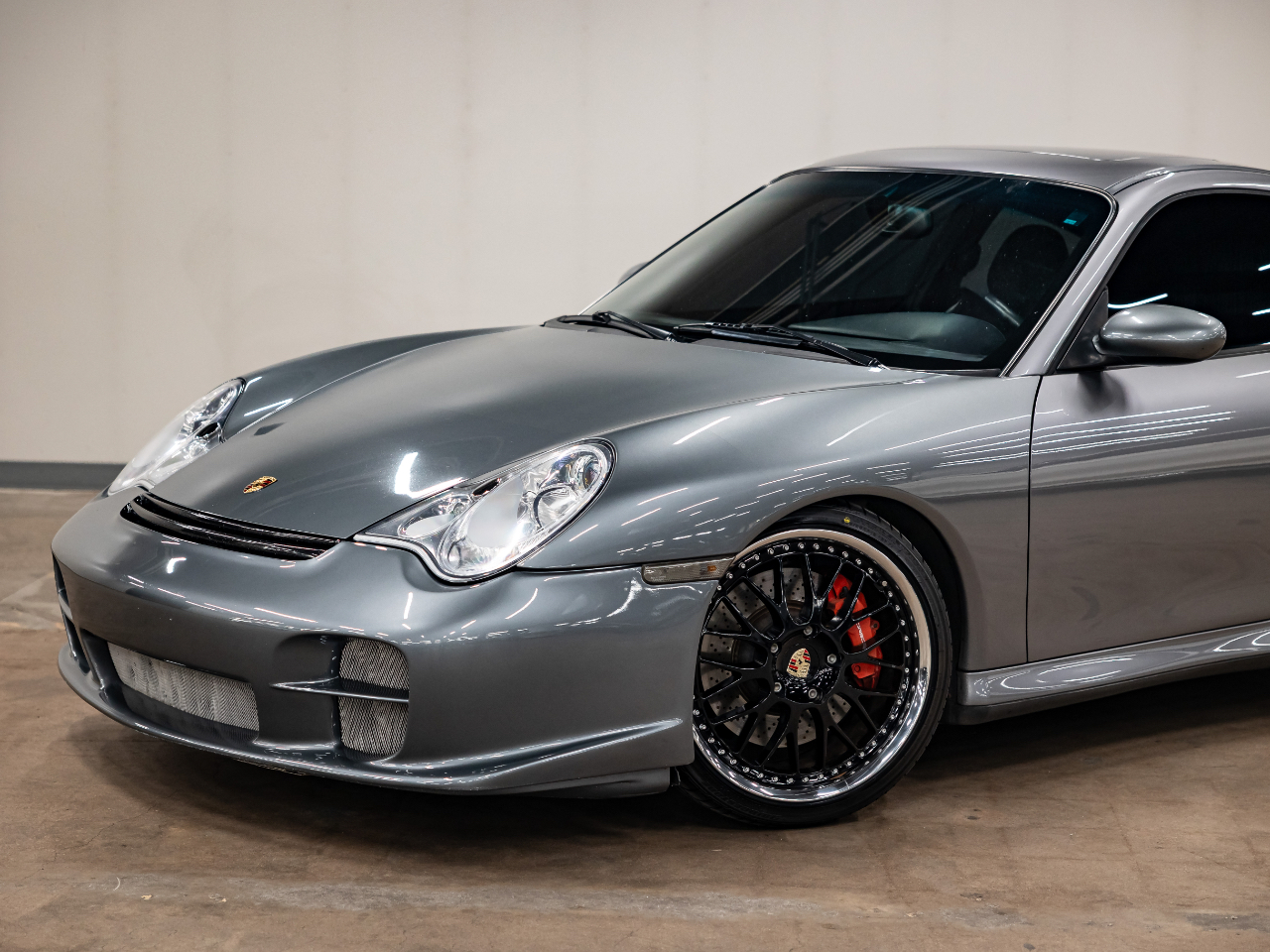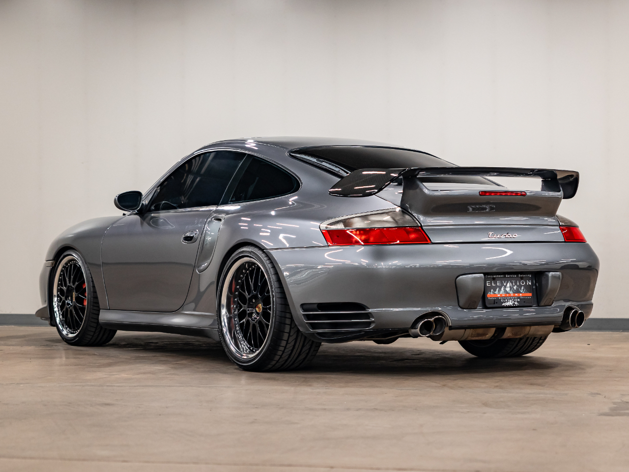 This 2002 Porsche 911 Turbo is finished in Seal Gray Metallic over Black Leather and is powered by a built twin-turbocharged 3.6-liter flat-six paired with a 6-speed manual transmission and all-wheel drive. The engine was professionally rebuilt in 2019 at a cost of approximately $20,000 and has fewer than 30,000 miles since the build, featuring Carrillo connecting rods, a 102.7mm piston and cylinder set, ID1300 fuel injectors, rebuilt cylinder heads, and welded coolant lines—creating a significantly strengthened foundation for the upgraded turbo system. Factory output was rated at 415 horsepower and 413 lb-ft of torque, though real-world figures are expected to be notably higher with these enhancements.