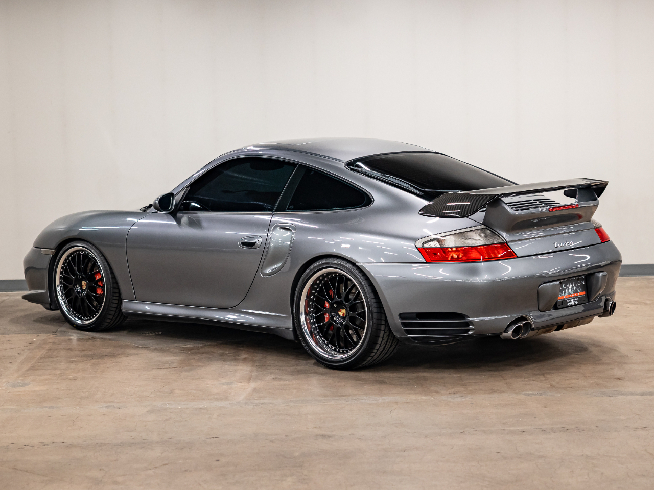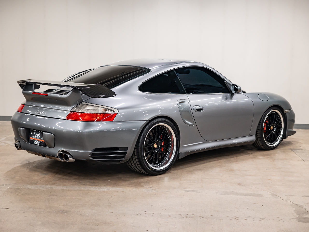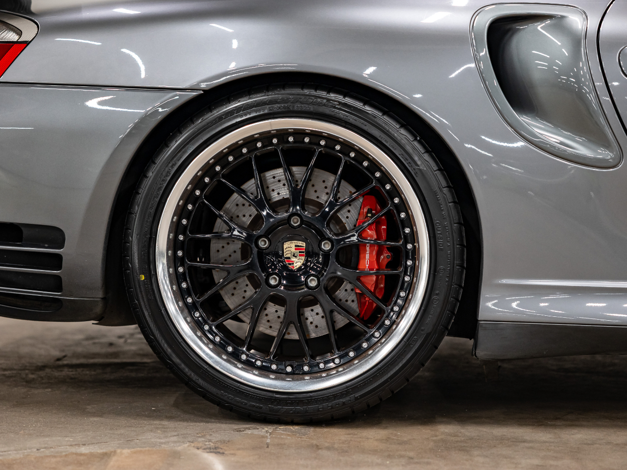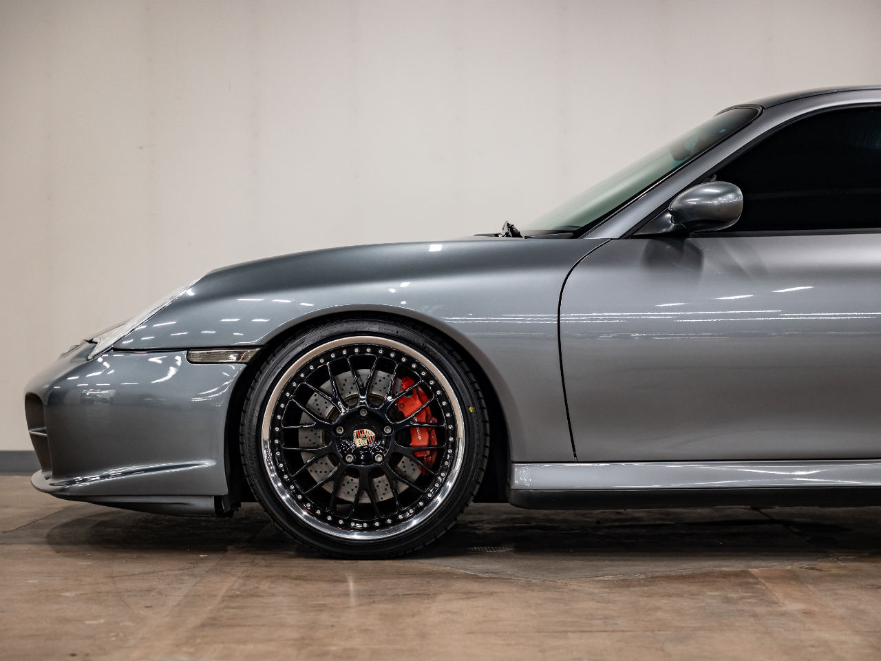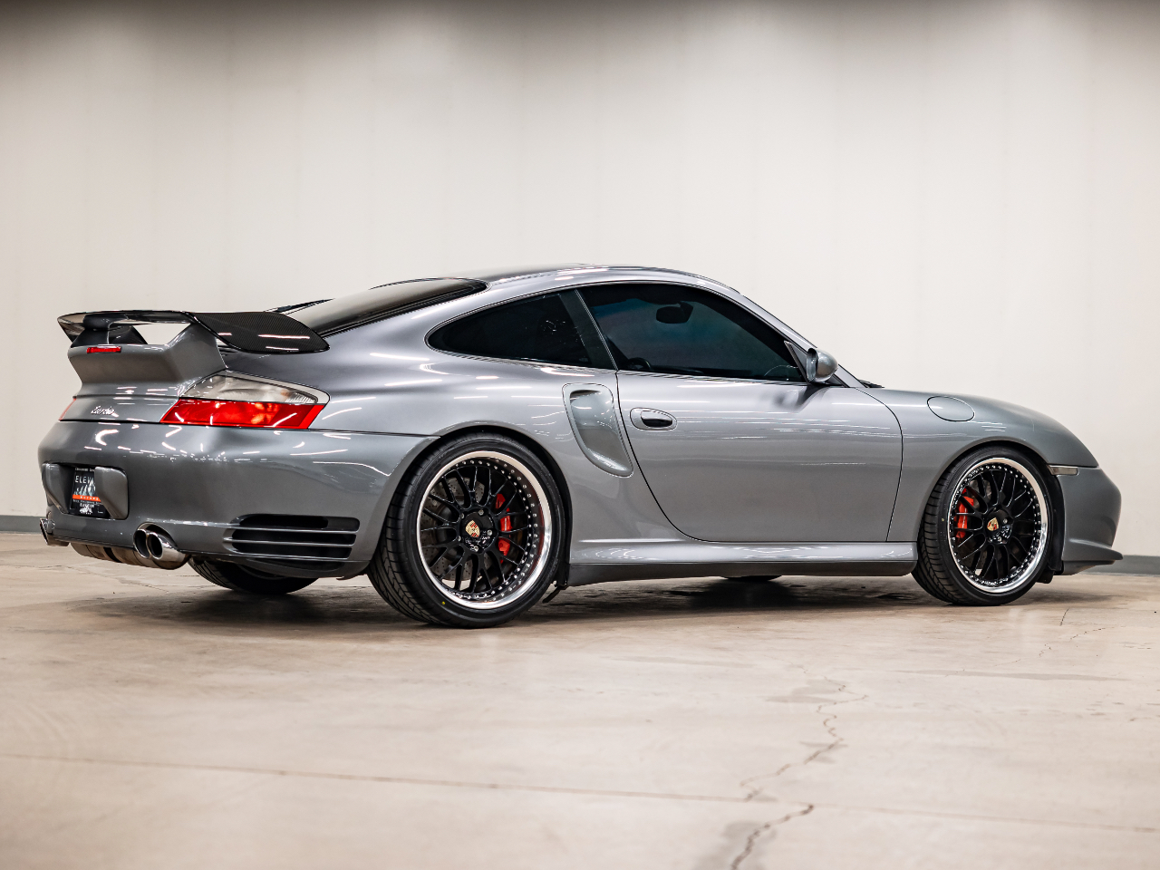 This 2002 Porsche 911 Turbo is finished in Seal Gray Metallic over Black Leather and is powered by a built twin-turbocharged 3.6-liter flat-six paired with a 6-speed manual transmission and all-wheel drive. The engine was professionally rebuilt in 2019 at a cost of approximately $20,000 and has fewer than 30,000 miles since the build, featuring Carrillo connecting rods, a 102.7mm piston and cylinder set, ID1300 fuel injectors, rebuilt cylinder heads, and welded coolant lines—creating a significantly strengthened foundation for the upgraded turbo system. Factory output was rated at 415 horsepower and 413 lb-ft of torque, though real-world figures are expected to be notably higher with these enhancements.