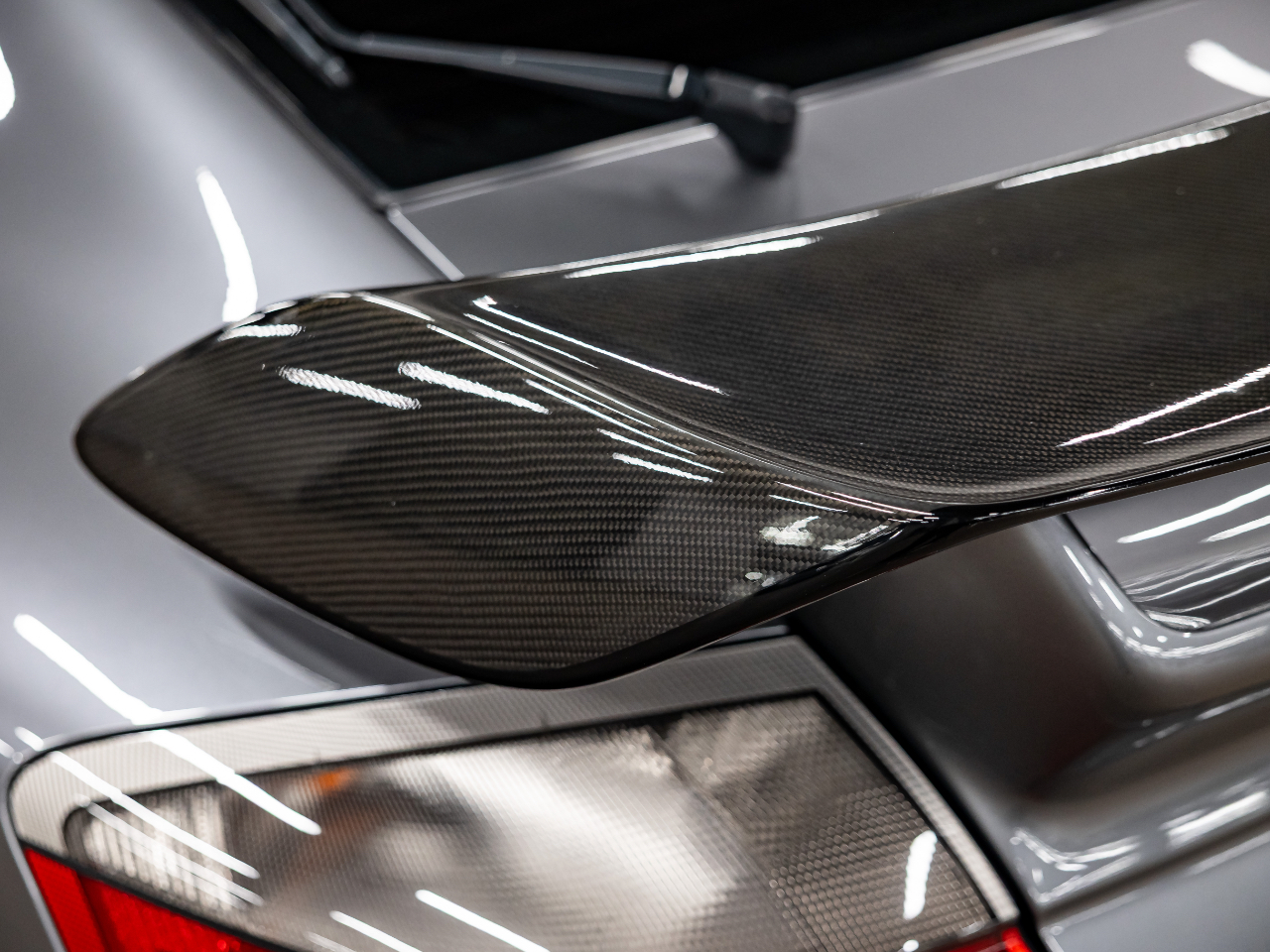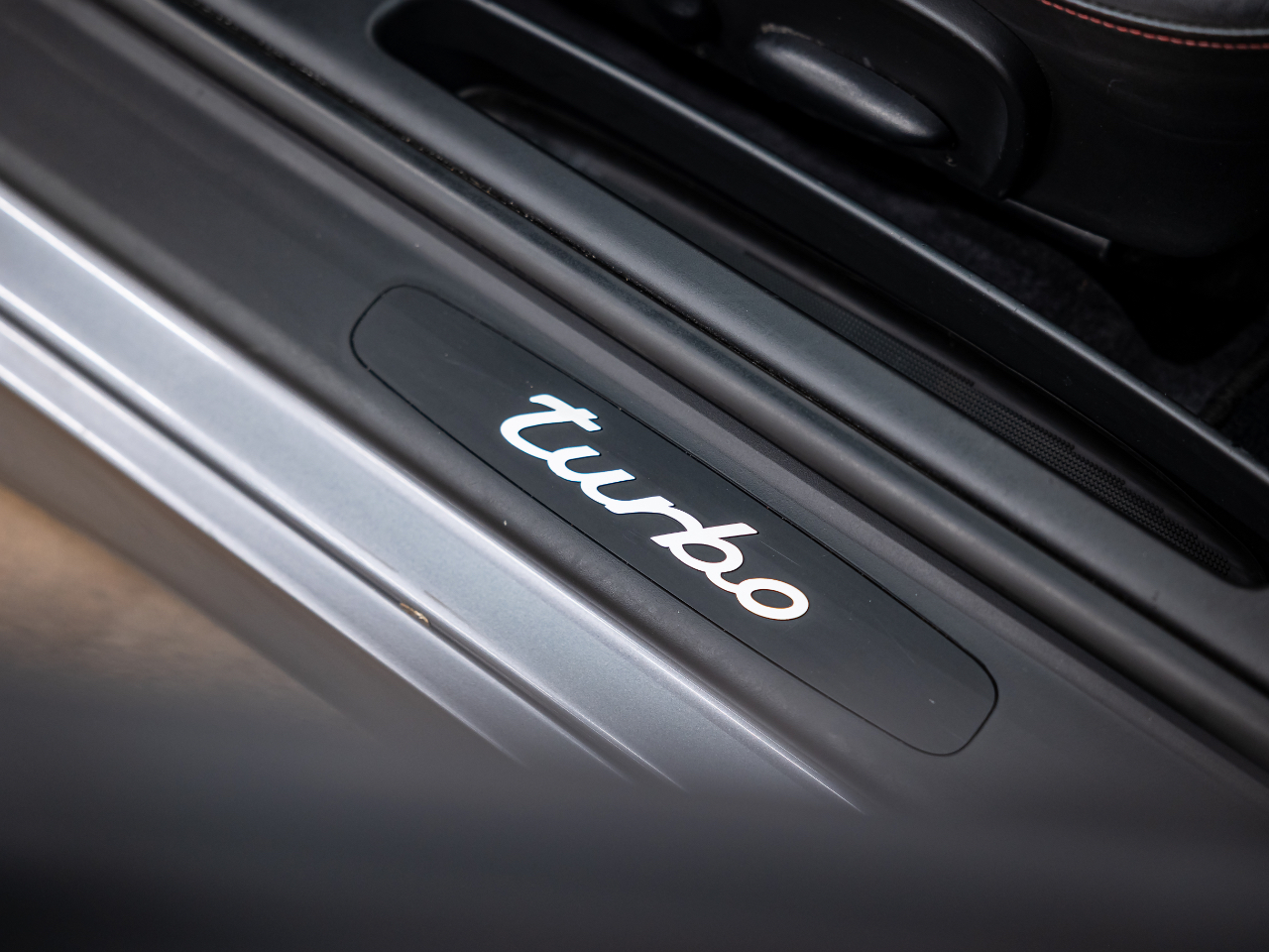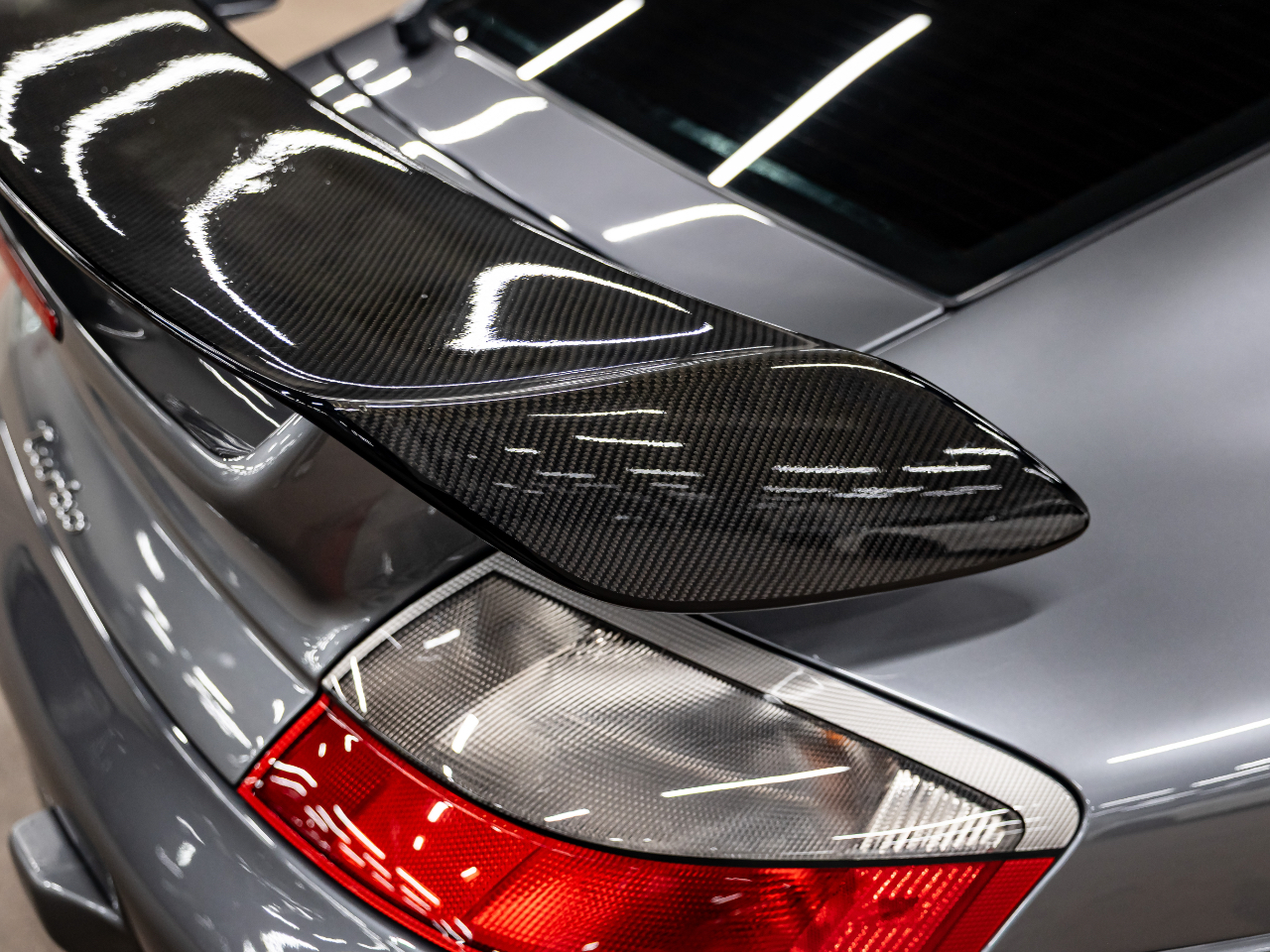 This Turbo features GT2-style bodywork with a carbon-fiber rear wing, a GT2-style front bumper, and 19-inch two-piece black alloy wheels wrapped in new Bridgestone Potenza tires. The interior is equipped with Sport Seats, carbon-fiber trim, heated front seats, and an Alpine head unit.