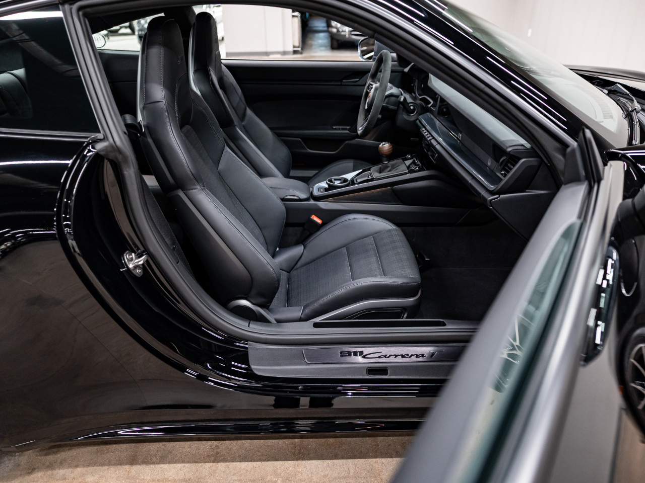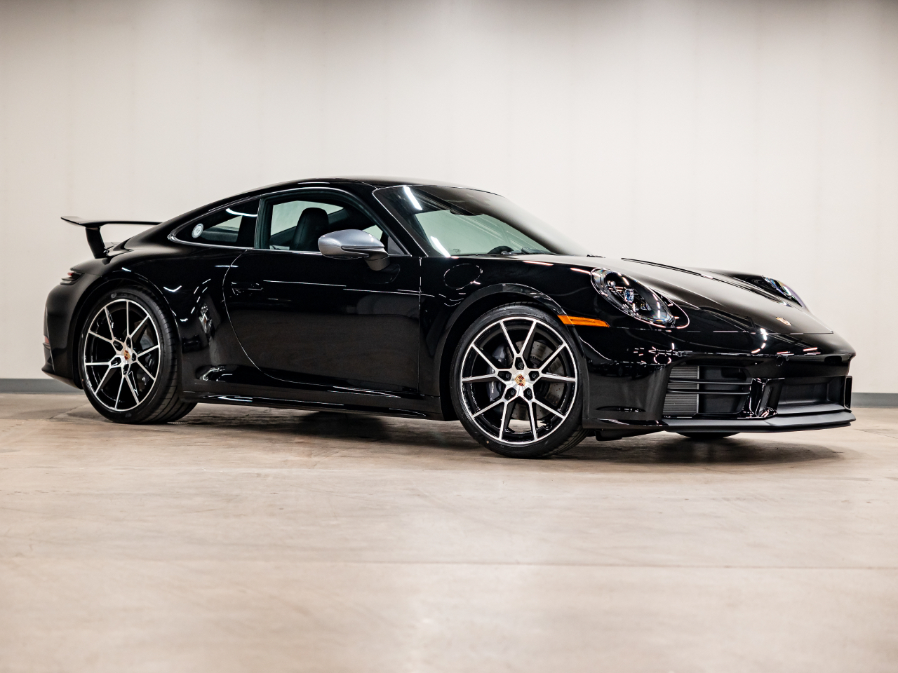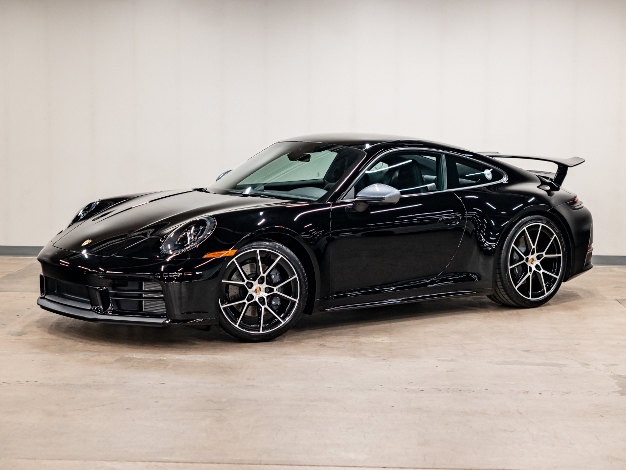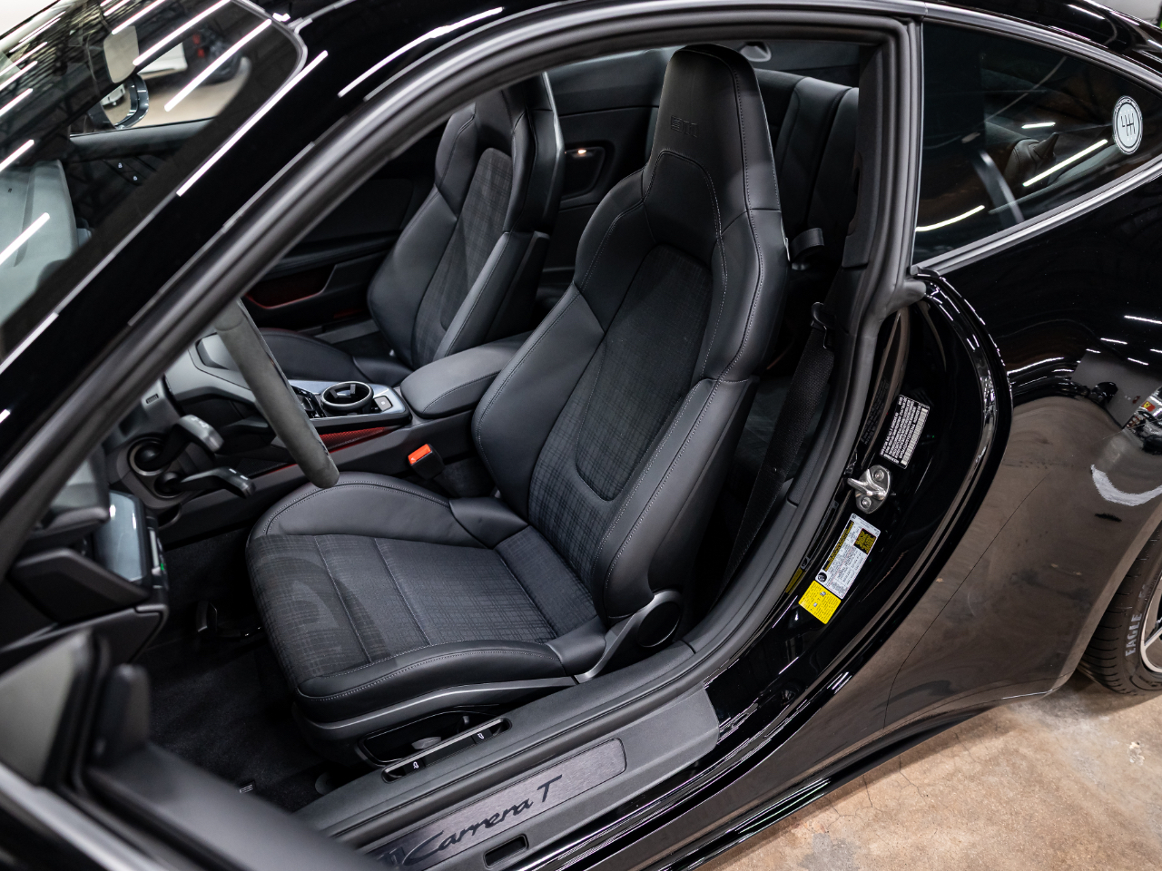 This 2026 Porsche 911 Carrera T with the Factory Aerokit is finished in Black over a Black interior featuring Plaid Sport Tex upholstery. Power comes from a 3.0L twin-turbocharged flat-six producing 388 horsepower and 331 lb-ft of torque, sent to the rear wheels through a 6-speed manual transmission.