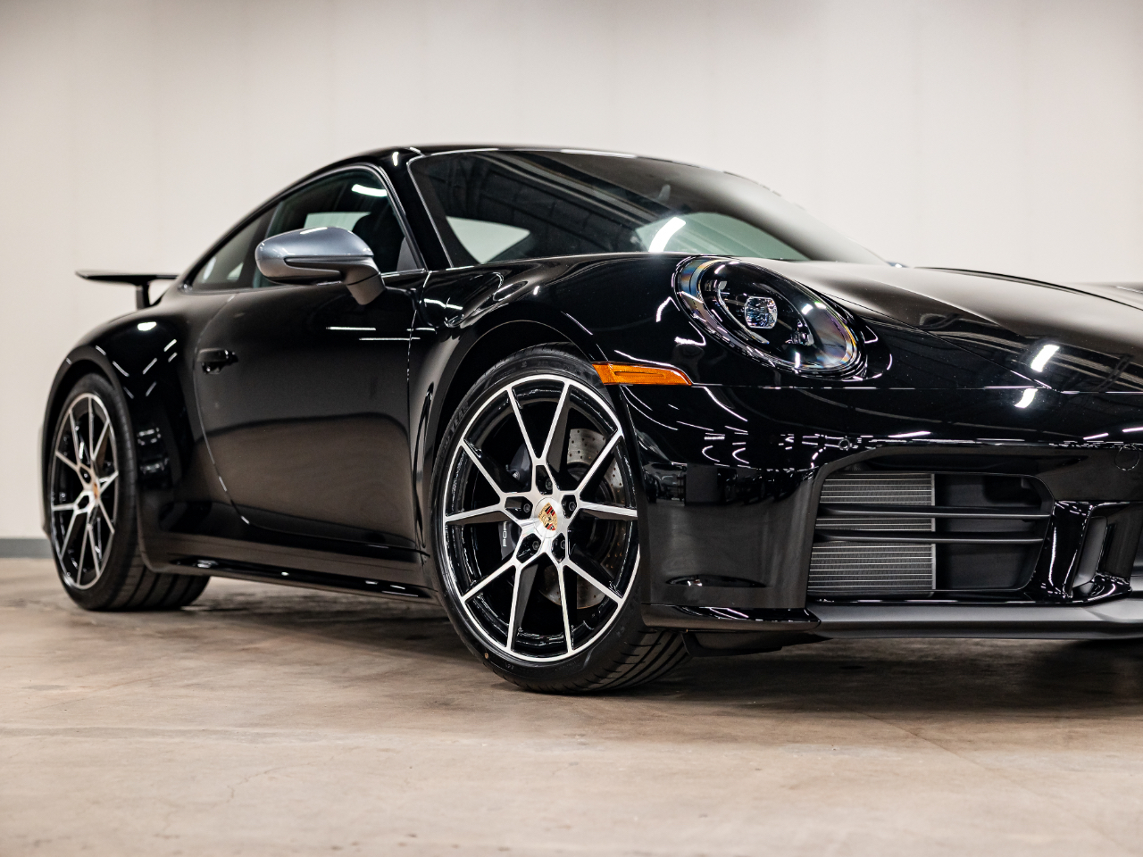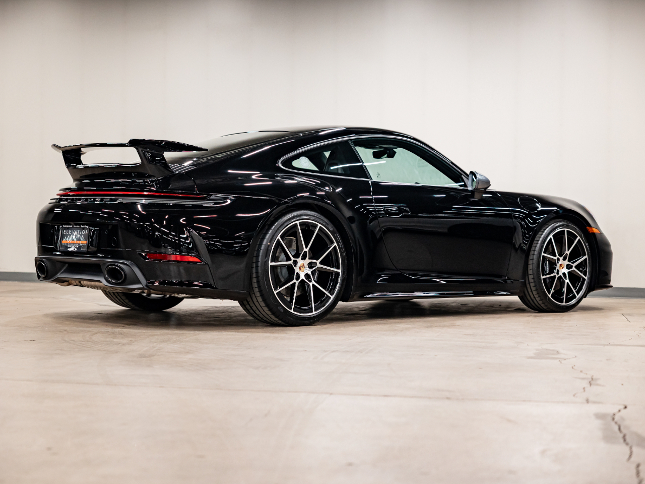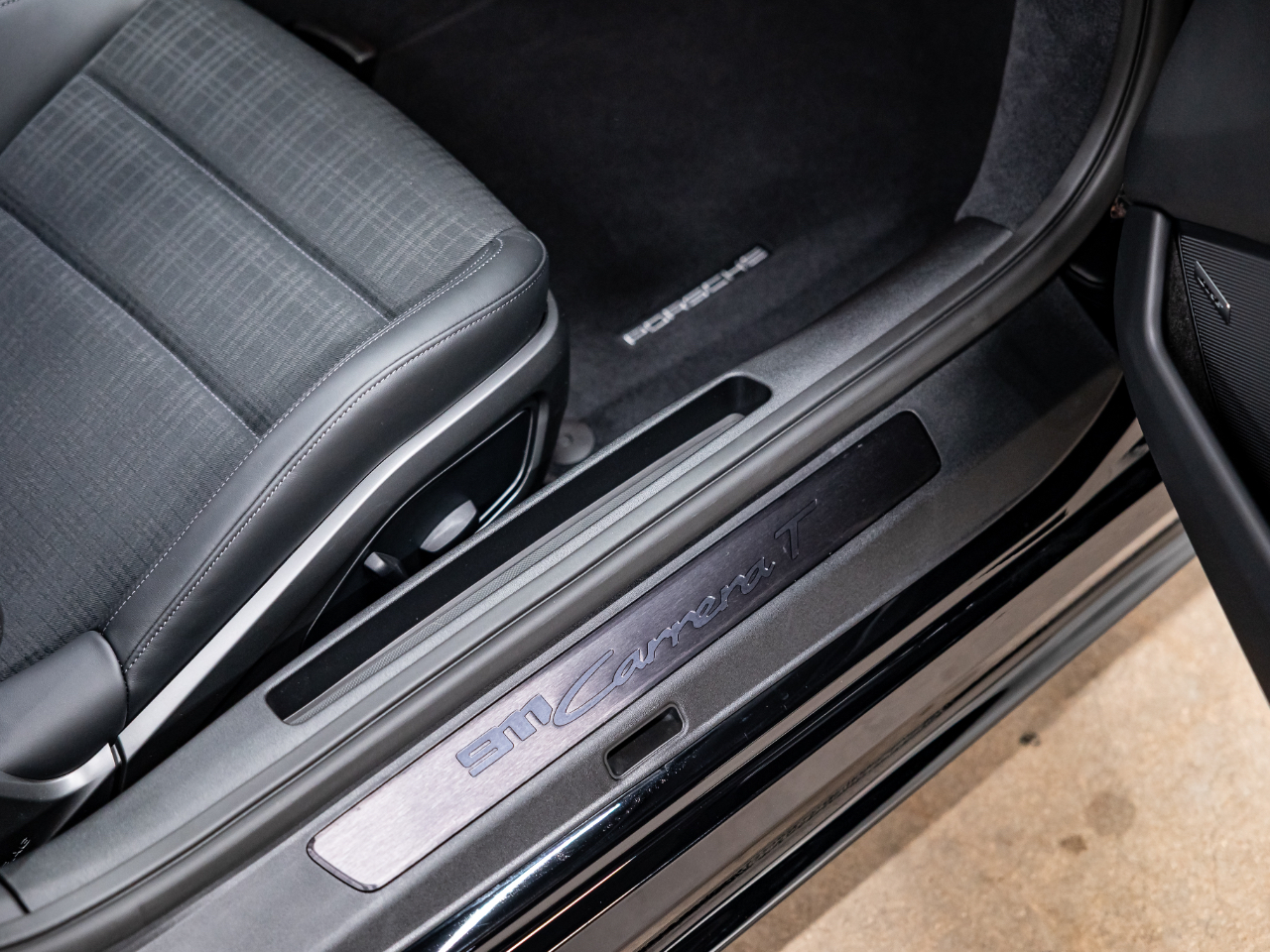 This 2026 Porsche 911 Carrera T with the Factory Aerokit is finished in Black over a Black interior featuring Plaid Sport Tex upholstery. Power comes from a 3.0L twin-turbocharged flat-six producing 388 horsepower and 331 lb-ft of torque, sent to the rear wheels through a 6-speed manual transmission.