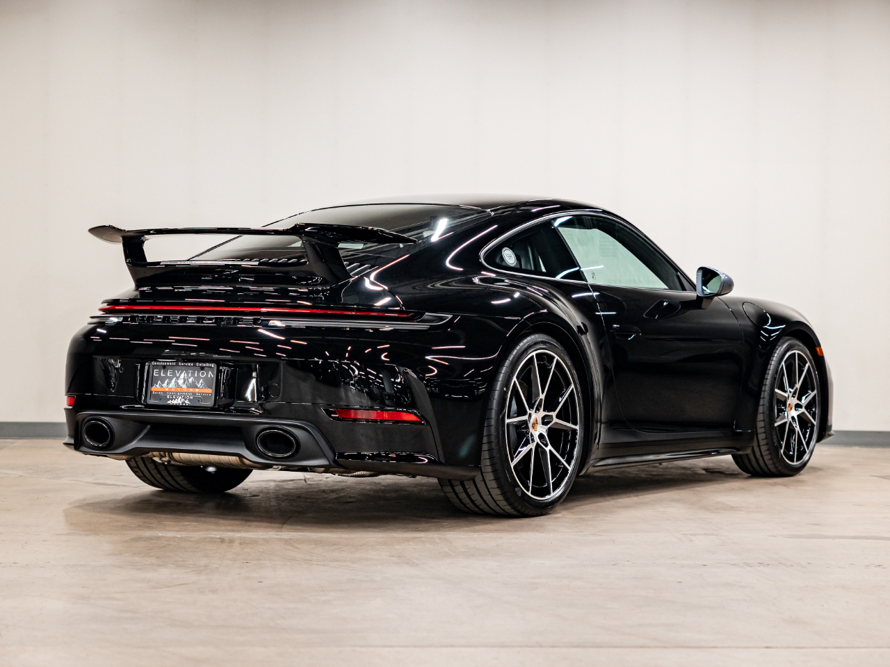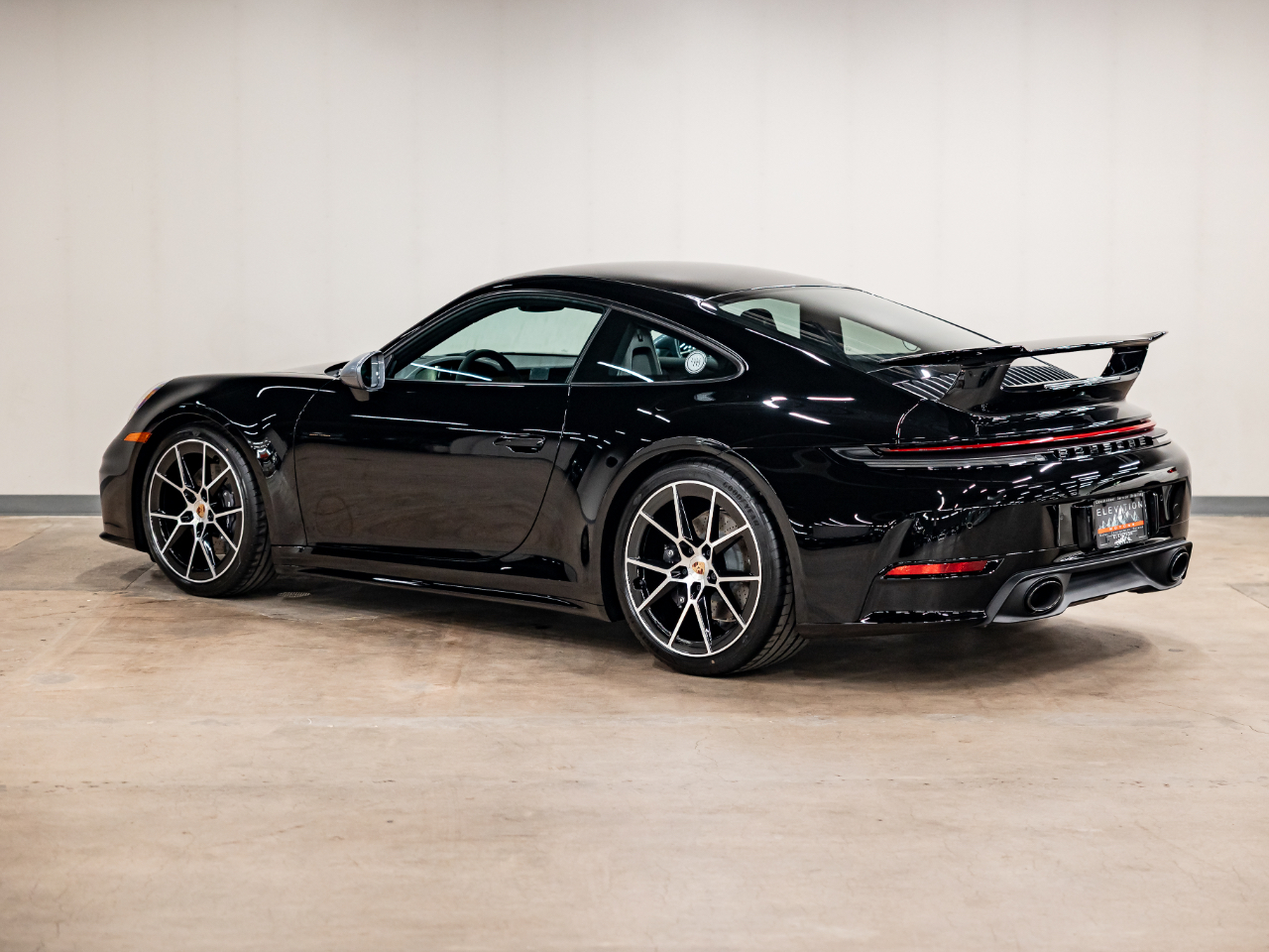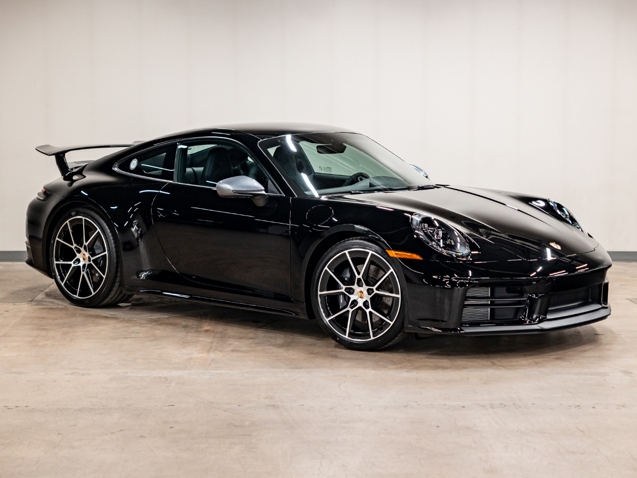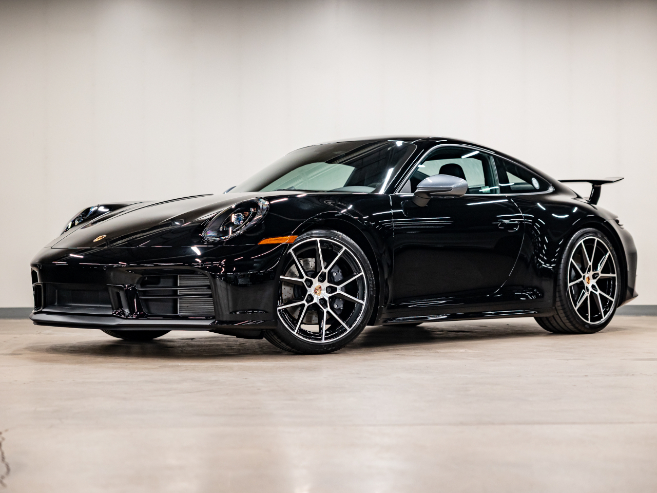 This 2026 Porsche 911 Carrera T with the Factory Aerokit is finished in Black over a Black interior featuring Plaid Sport Tex upholstery. Power comes from a 3.0L twin-turbocharged flat-six producing 388 horsepower and 331 lb-ft of torque, sent to the rear wheels through a 6-speed manual transmission.