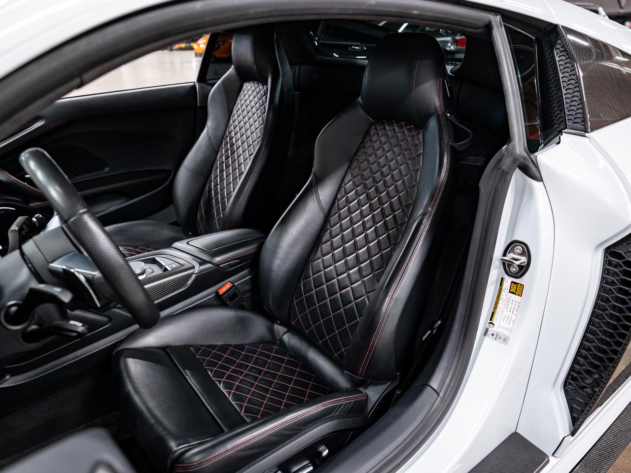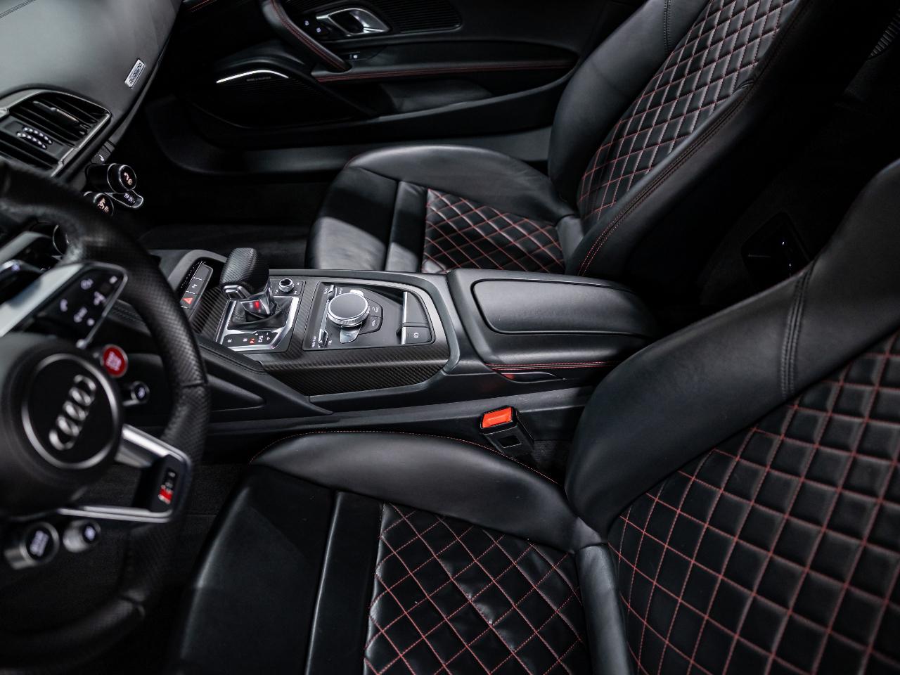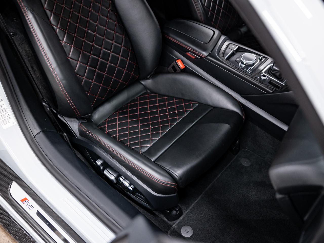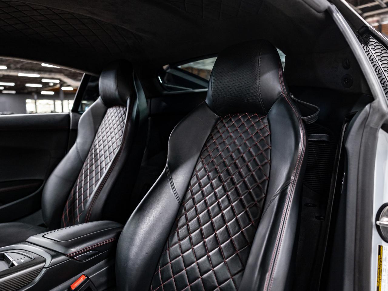 This R8 is equipped with the Diamond Stitch Leather Package with Sport Seats, Audi MMI Navigation Plus, and a Bang & Olufsen premium sound system. Additional features include dynamic steering, contrast stitching throughout the interior, USB connectivity, and an Audi first aid kit.