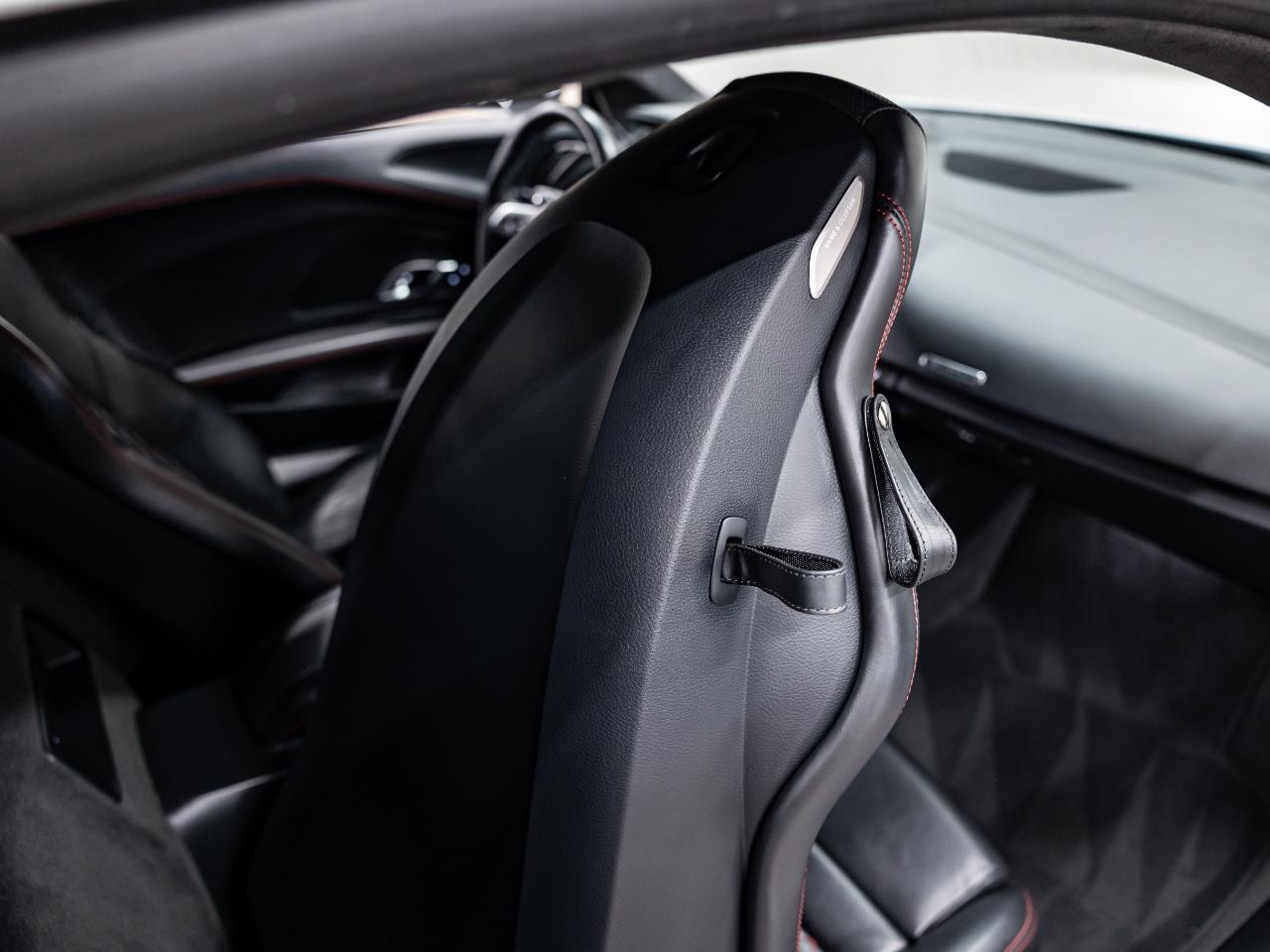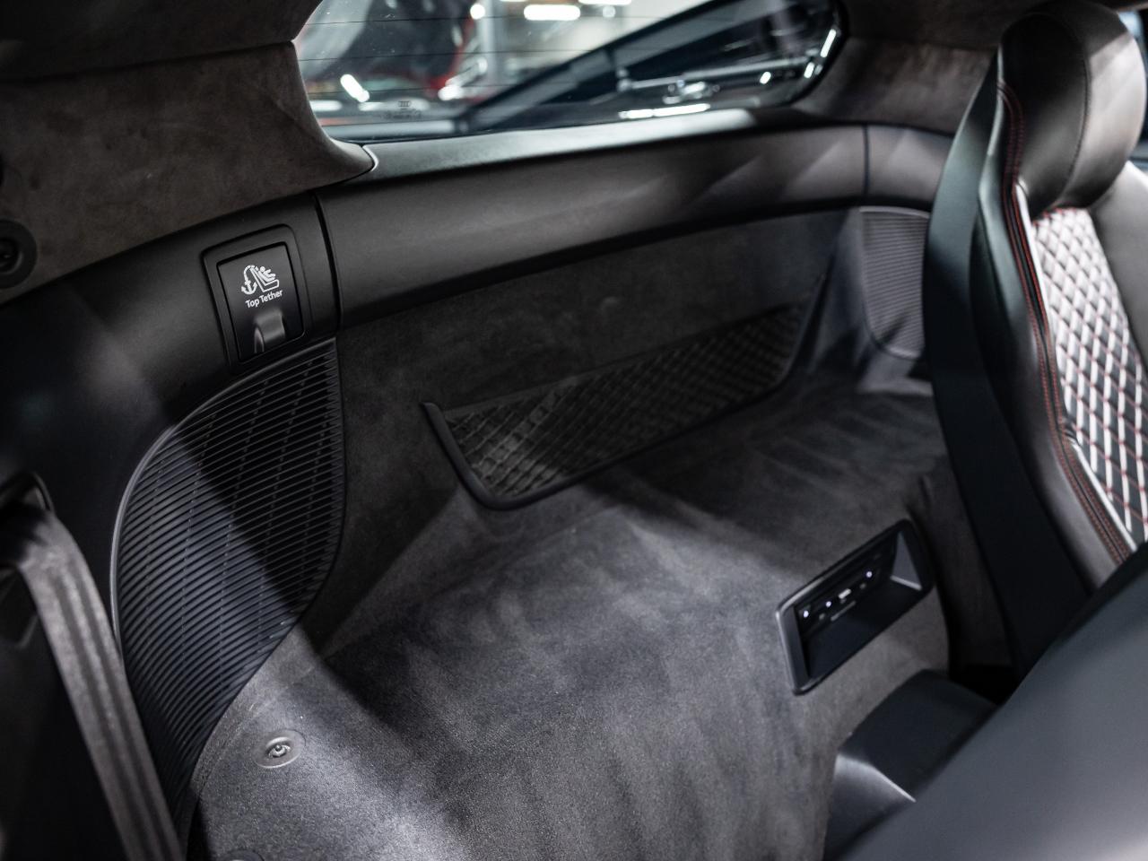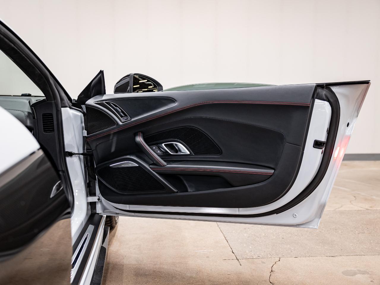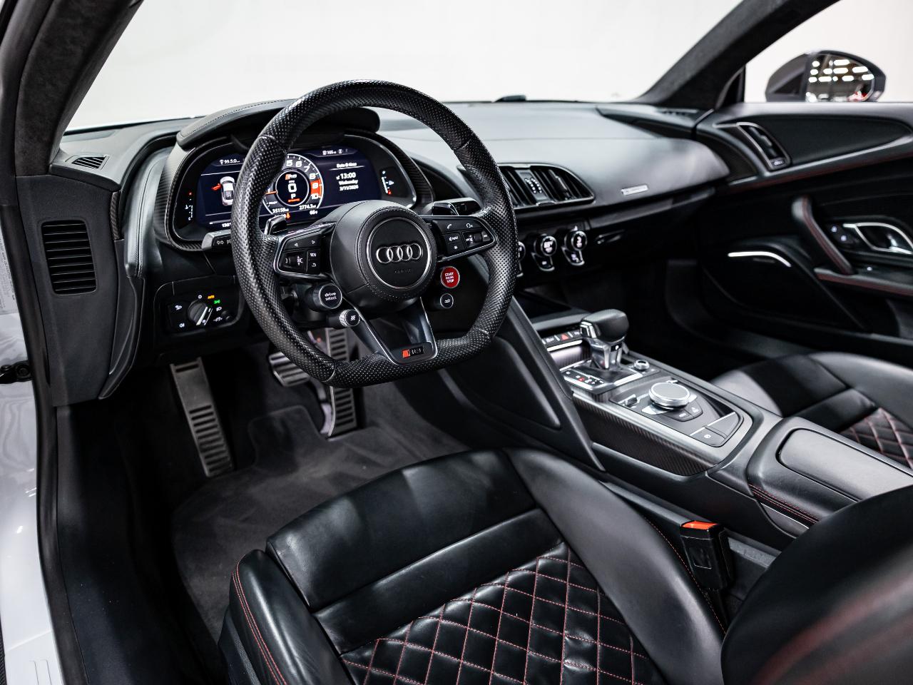 This R8 is equipped with the Diamond Stitch Leather Package with Sport Seats, Audi MMI Navigation Plus, and a Bang & Olufsen premium sound system. Additional features include dynamic steering, contrast stitching throughout the interior, USB connectivity, and an Audi first aid kit.