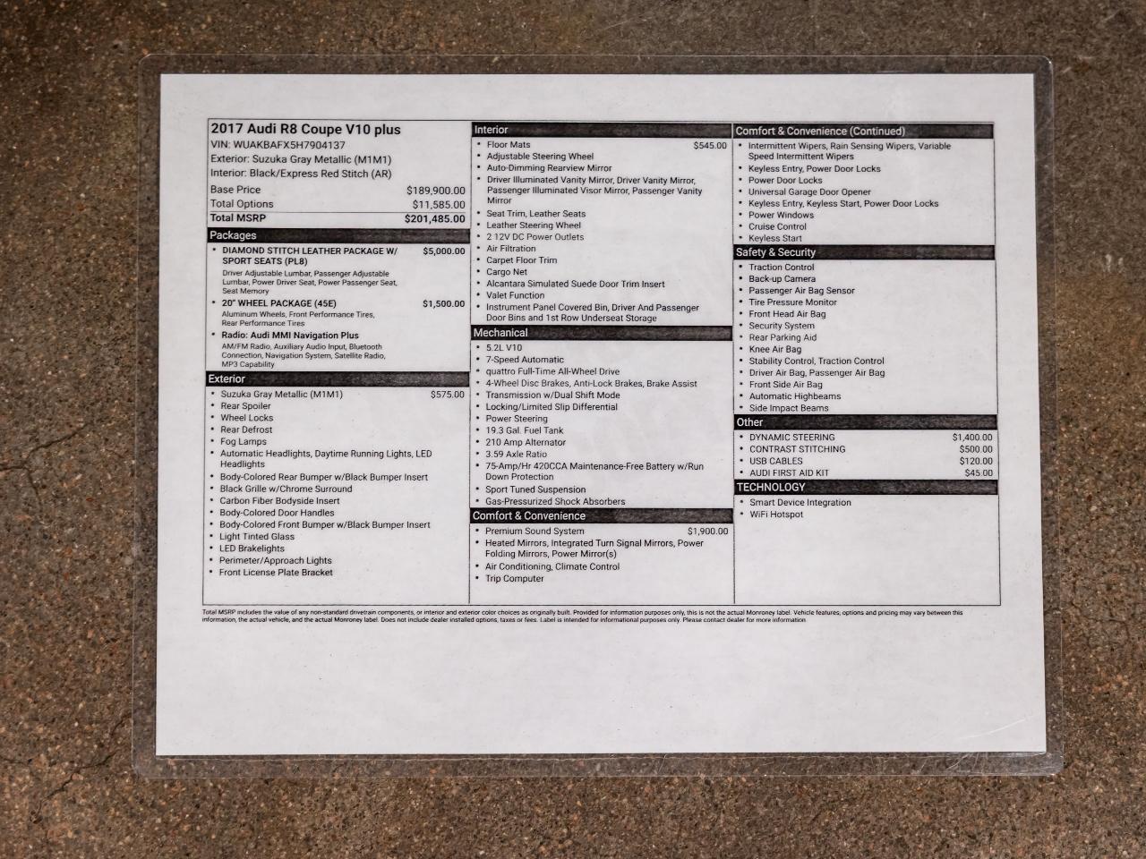 This 2017 Audi R8 V10 Plus is finished in Suzuka Gray Metallic over a Black leather interior with Express Red contrast stitching and diamond-stitched sport seats. Power comes from a 5.2-liter naturally aspirated V10 producing 610 horsepower and 413 lb-ft of torque, sent to all four wheels through a 7-speed S tronic dual-clutch transmission and Audi’s quattro all-wheel-drive system.