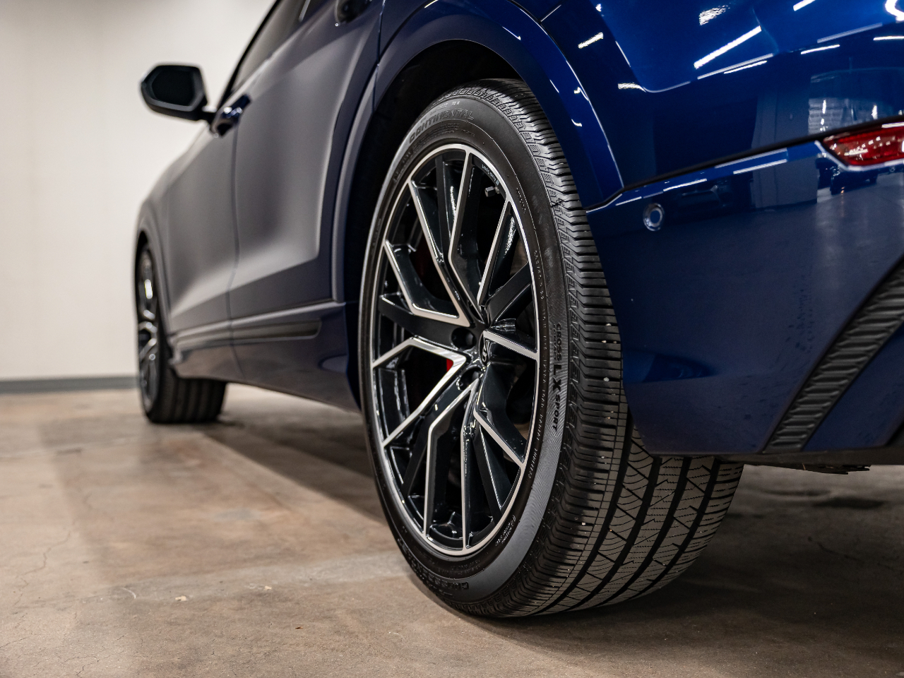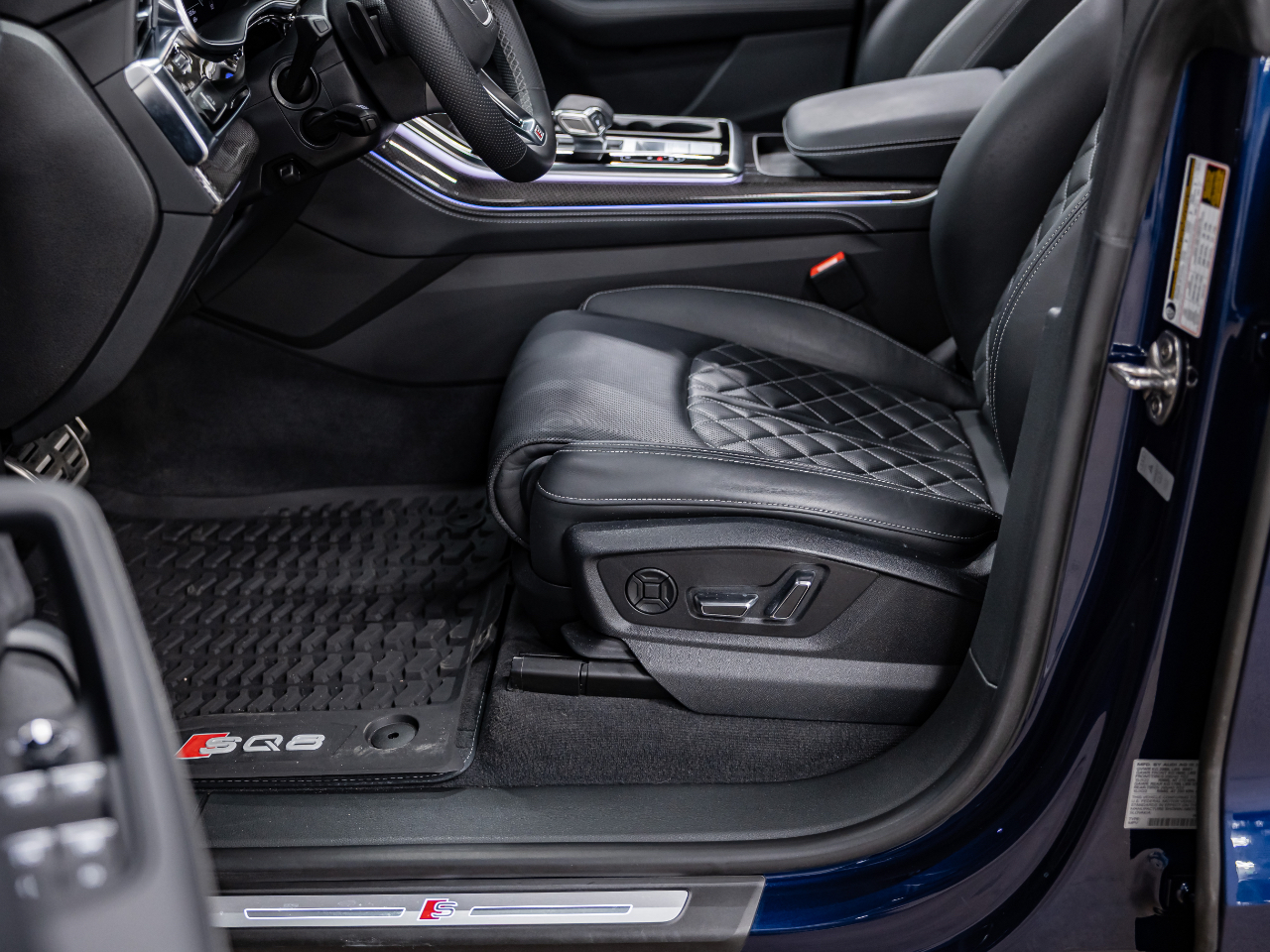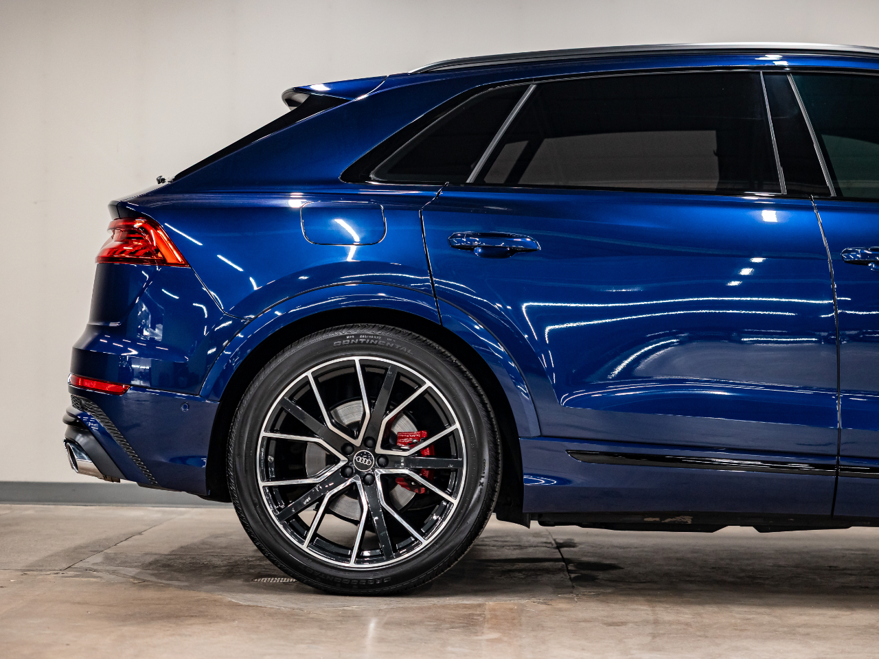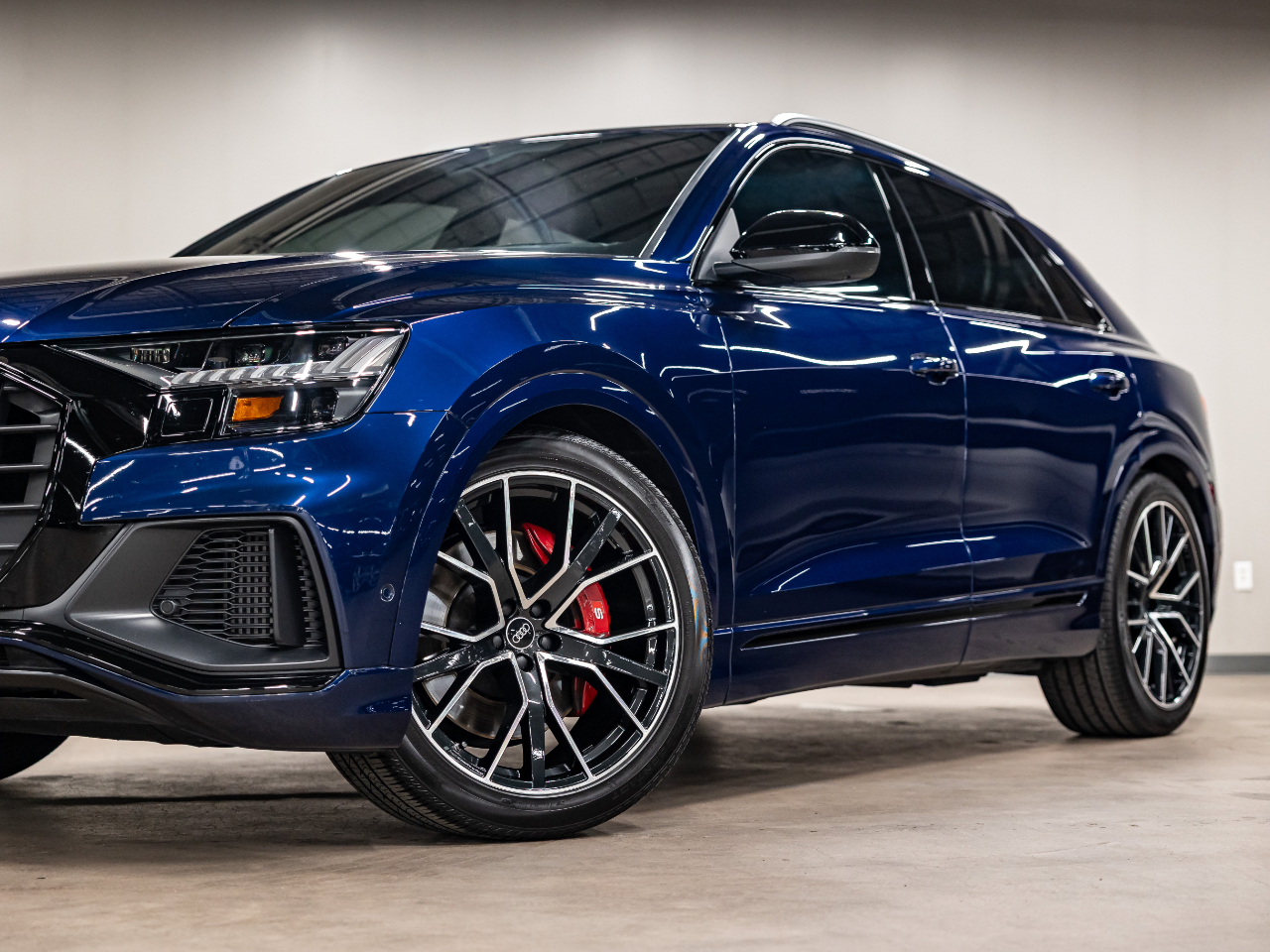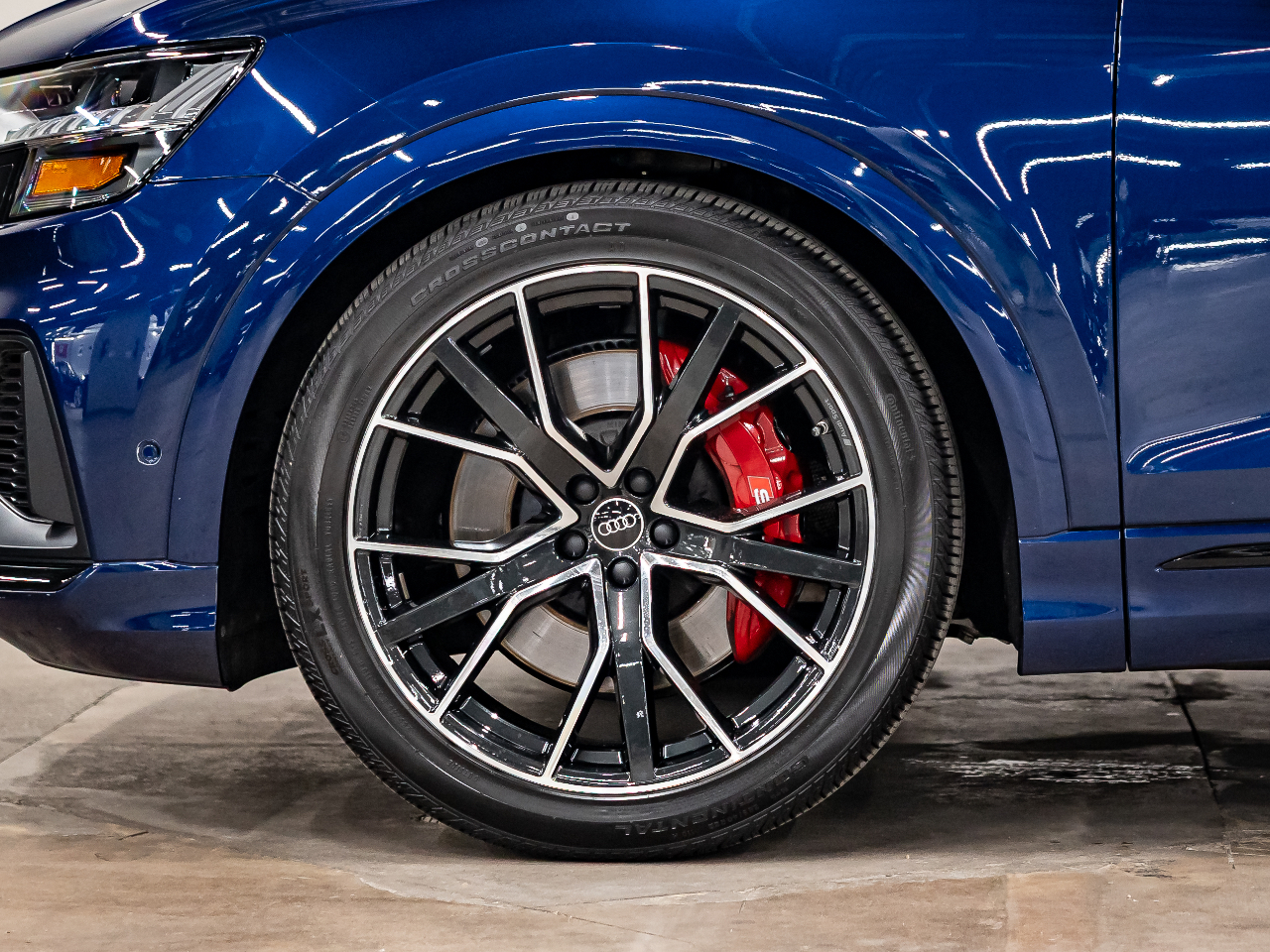 This SQ8 comes well-equipped with the Prestige Package, adding the Executive Package, head-up display, intersection assist, traffic sign recognition, power soft-closing doors, and remote park assist. Additional features include the Sport Package with active roll stabilization, red brake calipers, sport rear differential, night vision assist, Black Optics Package, towing package, Audi Guard protection kit, and black Audi rings and model badging. It rides on 22-inch 5-V-spoke-star design wheels with a bi-color finish, wrapped in Continental CrossContact tires.