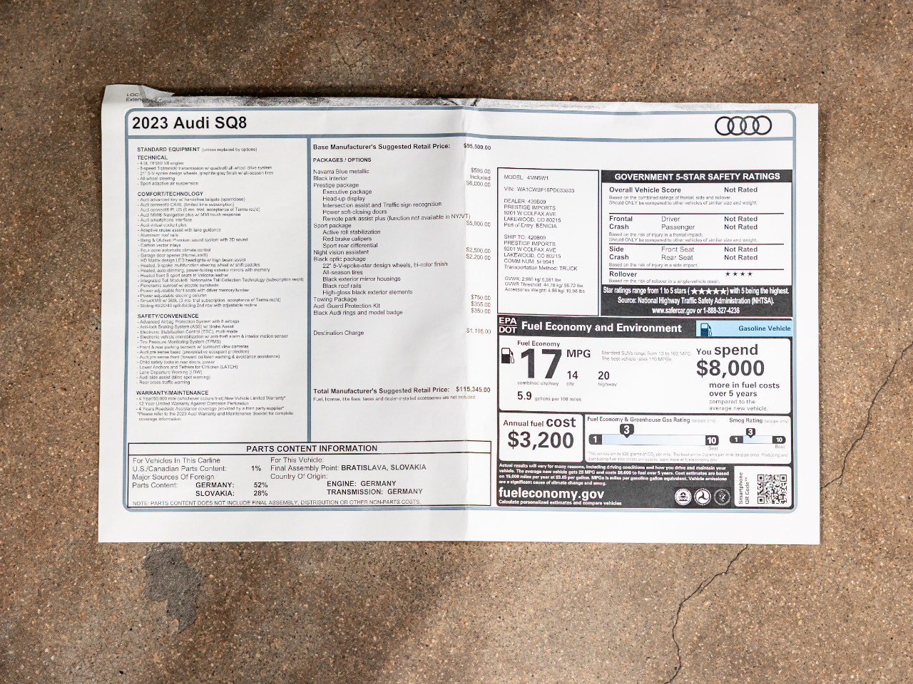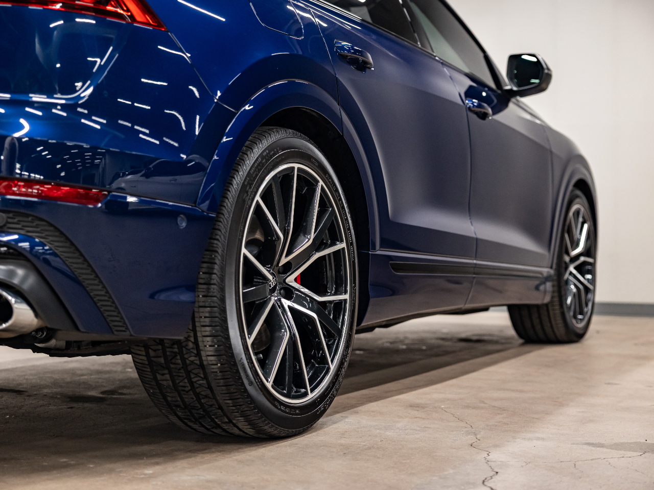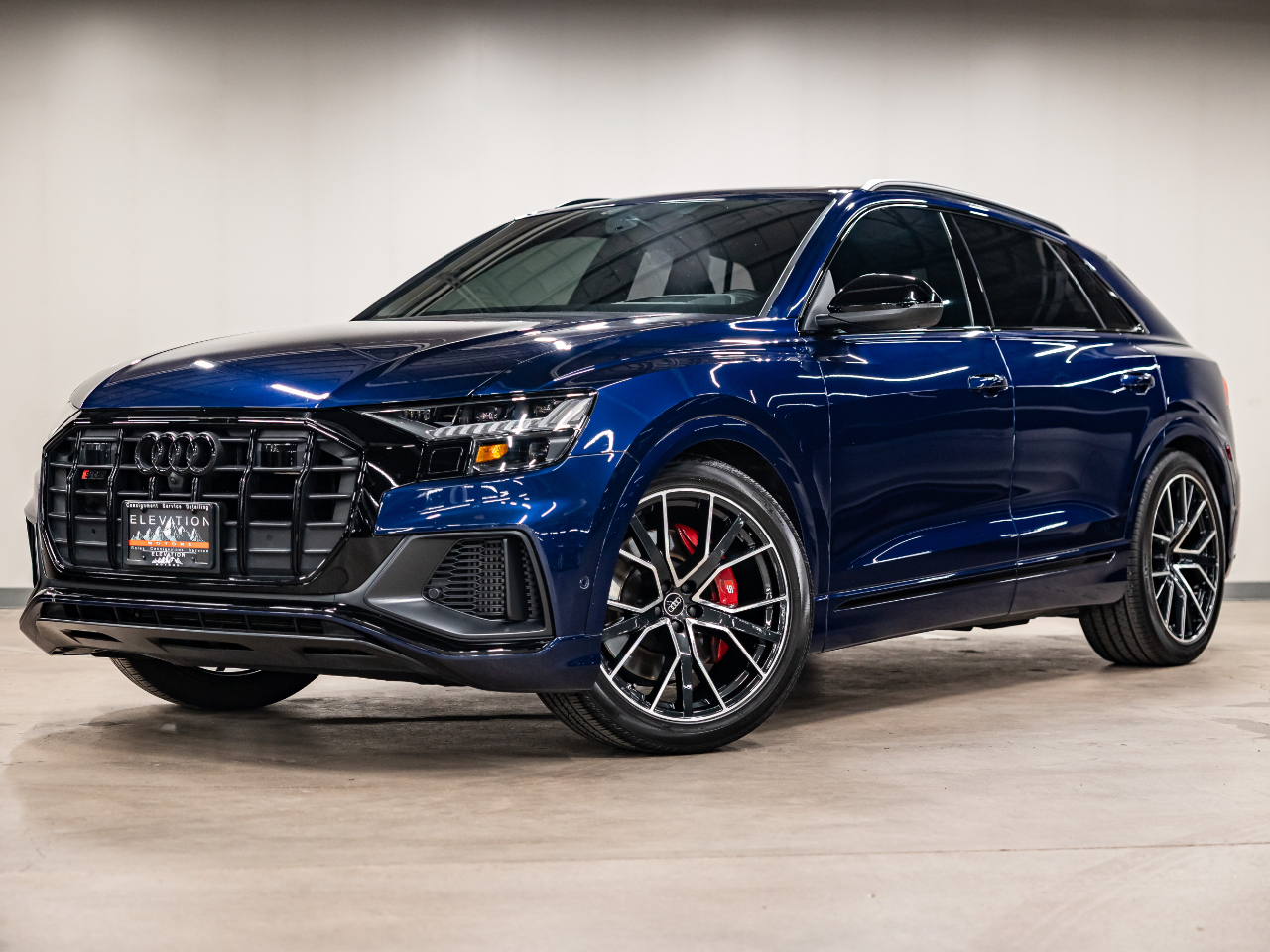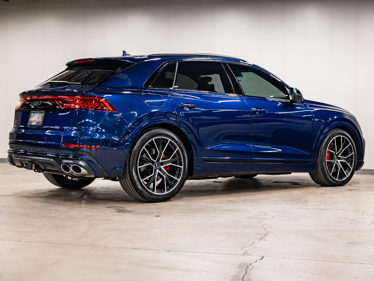 This SQ8 comes well-equipped with the Prestige Package, adding the Executive Package, head-up display, intersection assist, traffic sign recognition, power soft-closing doors, and remote park assist. Additional features include the Sport Package with active roll stabilization, red brake calipers, sport rear differential, night vision assist, Black Optics Package, towing package, Audi Guard protection kit, and black Audi rings and model badging. It rides on 22-inch 5-V-spoke-star design wheels with a bi-color finish, wrapped in Continental CrossContact tires.