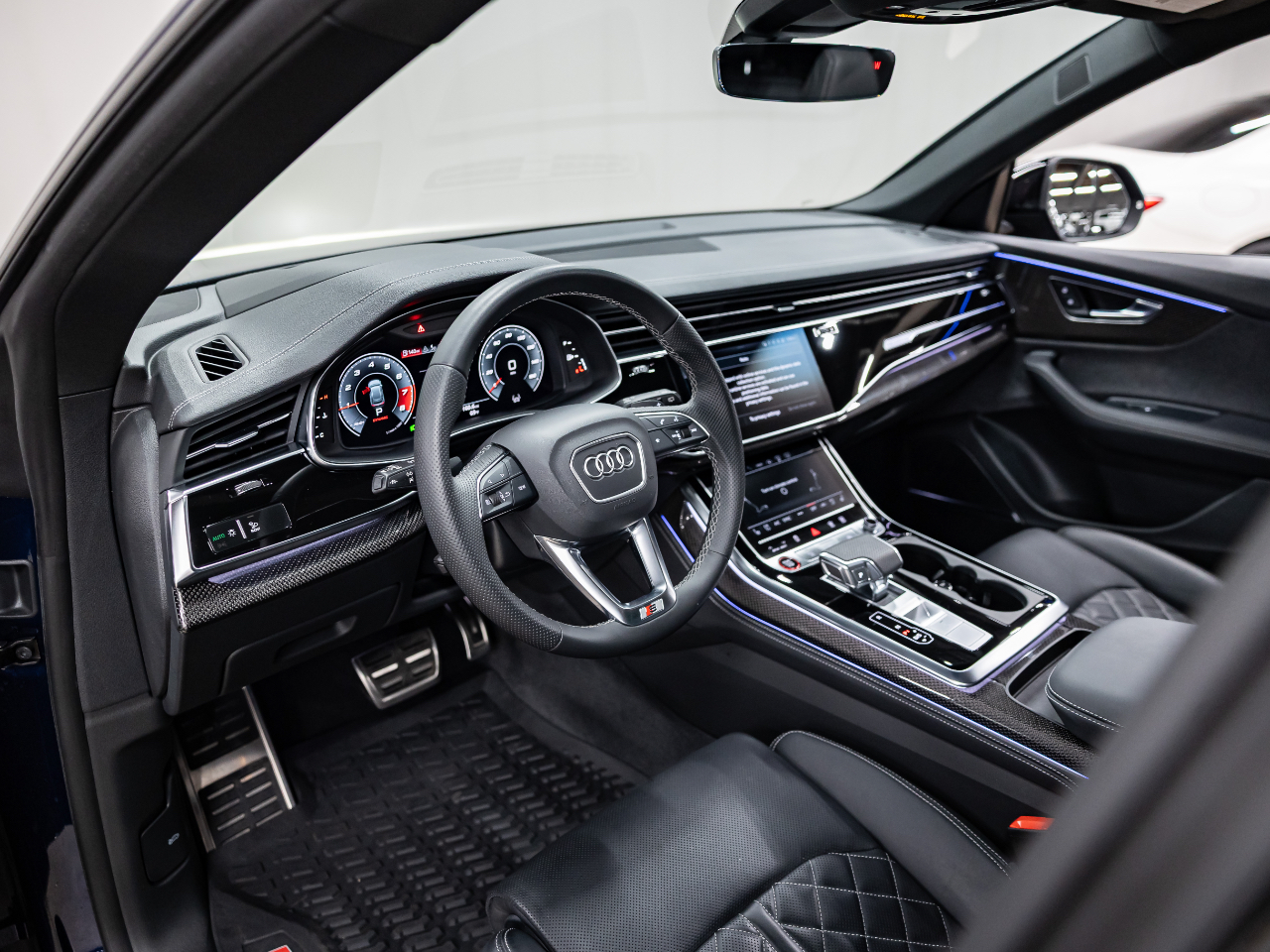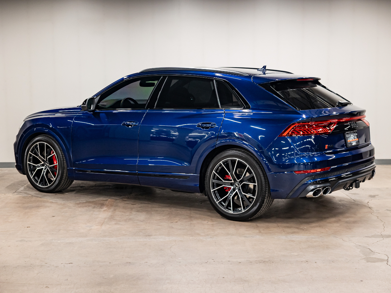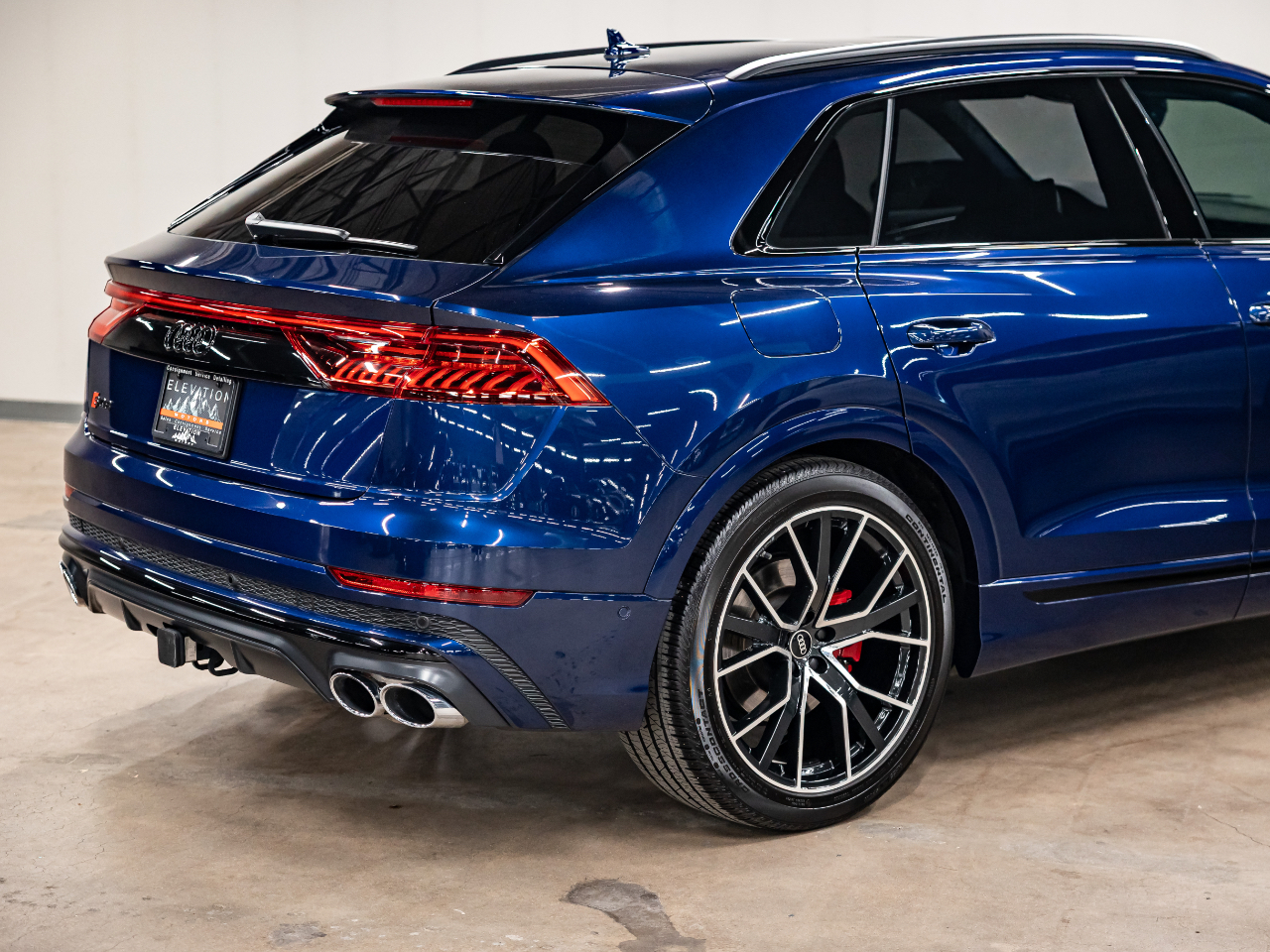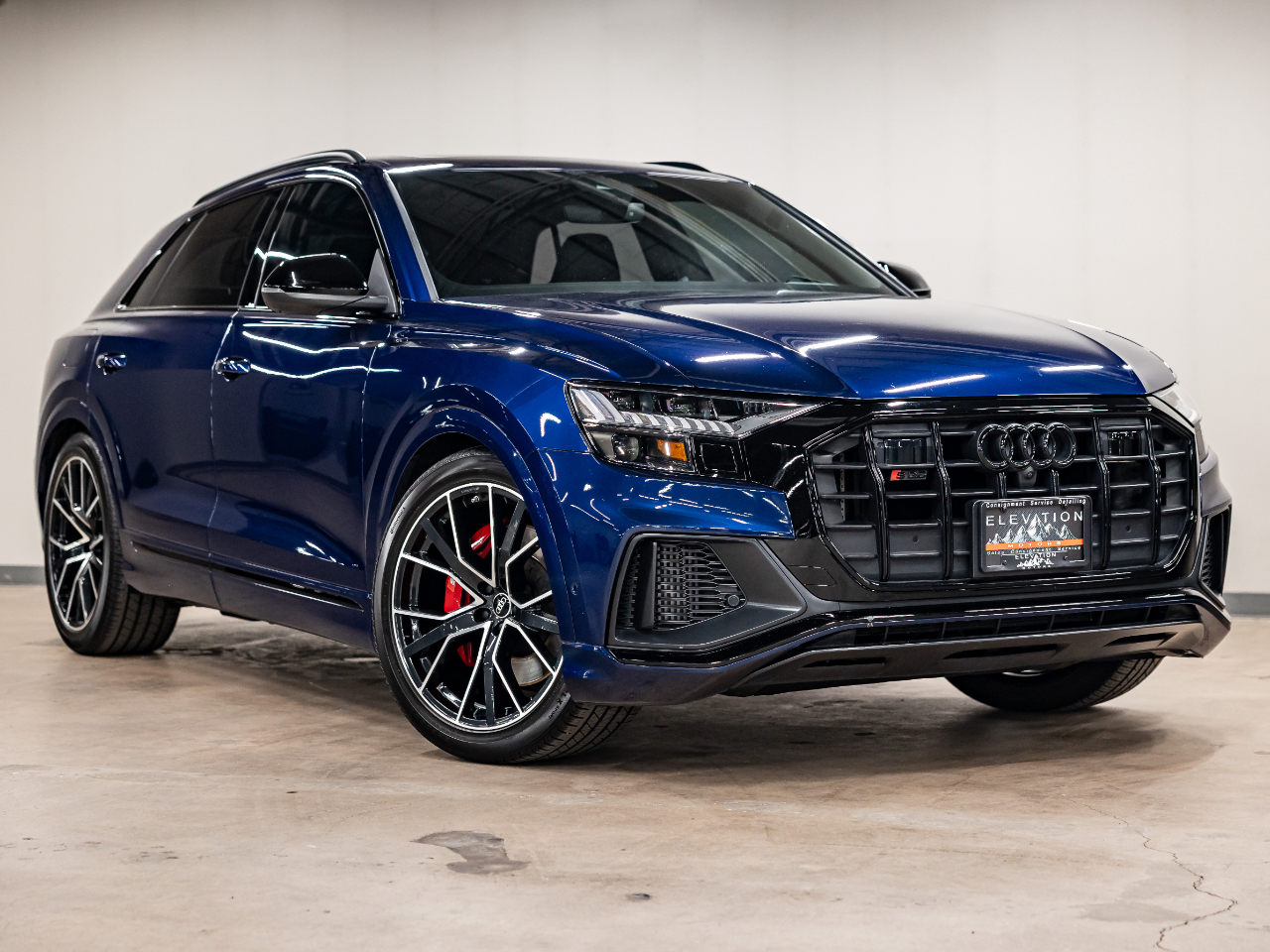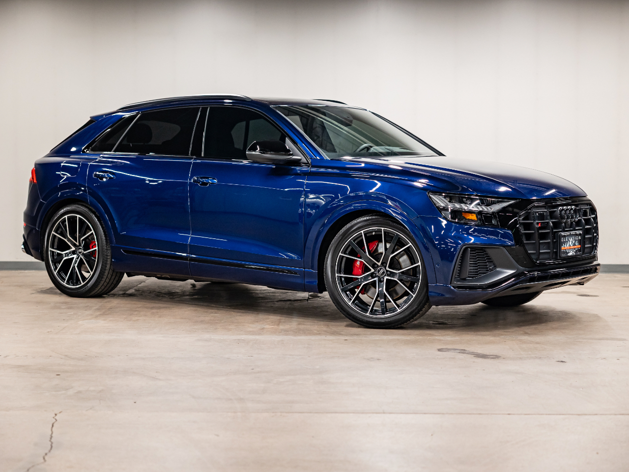 This SQ8 comes well-equipped with the Prestige Package, adding the Executive Package, head-up display, intersection assist, traffic sign recognition, power soft-closing doors, and remote park assist. Additional features include the Sport Package with active roll stabilization, red brake calipers, sport rear differential, night vision assist, Black Optics Package, towing package, Audi Guard protection kit, and black Audi rings and model badging. It rides on 22-inch 5-V-spoke-star design wheels with a bi-color finish, wrapped in Continental CrossContact tires.