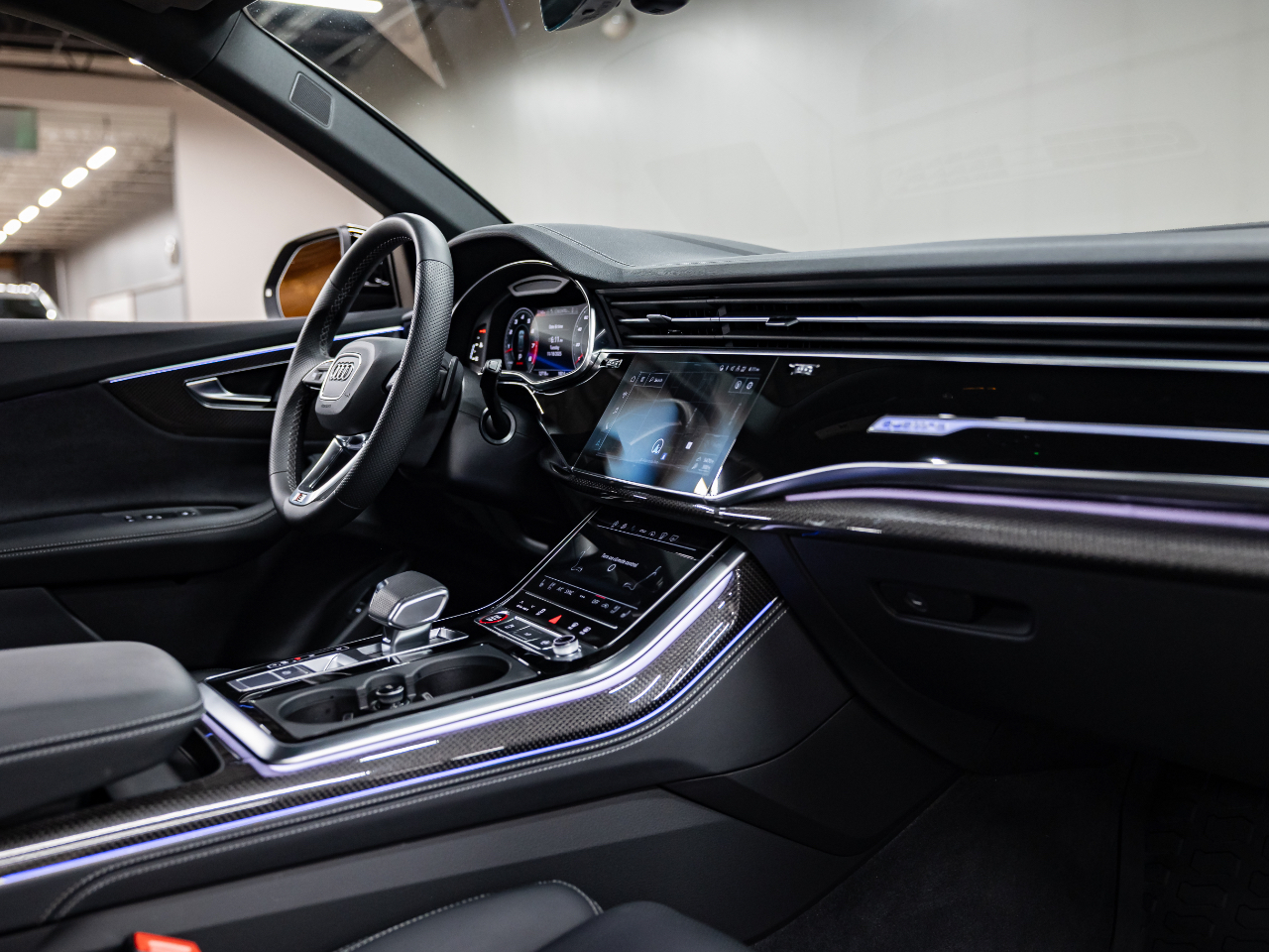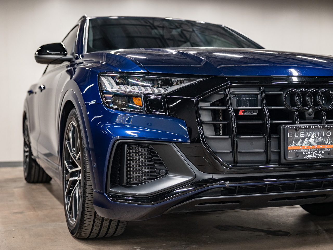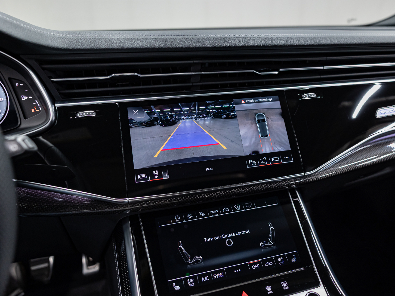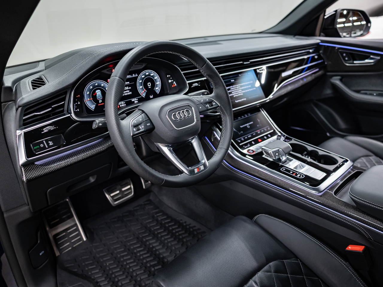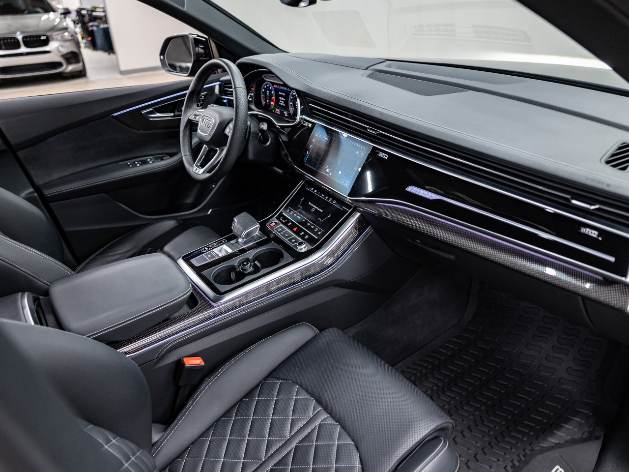 This SQ8 comes well-equipped with the Prestige Package, adding the Executive Package, head-up display, intersection assist, traffic sign recognition, power soft-closing doors, and remote park assist. Additional features include the Sport Package with active roll stabilization, red brake calipers, sport rear differential, night vision assist, Black Optics Package, towing package, Audi Guard protection kit, and black Audi rings and model badging. It rides on 22-inch 5-V-spoke-star design wheels with a bi-color finish, wrapped in Continental CrossContact tires.