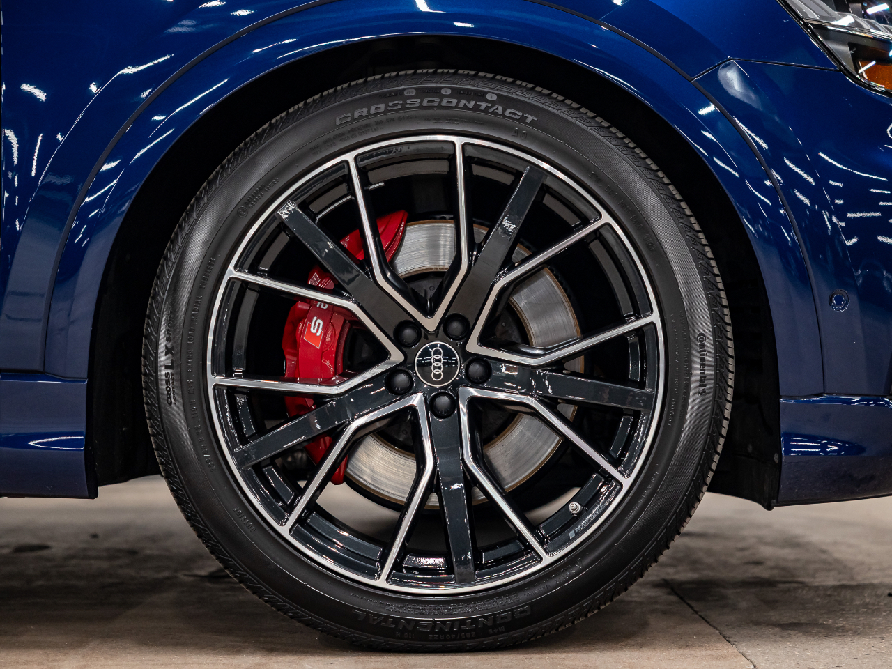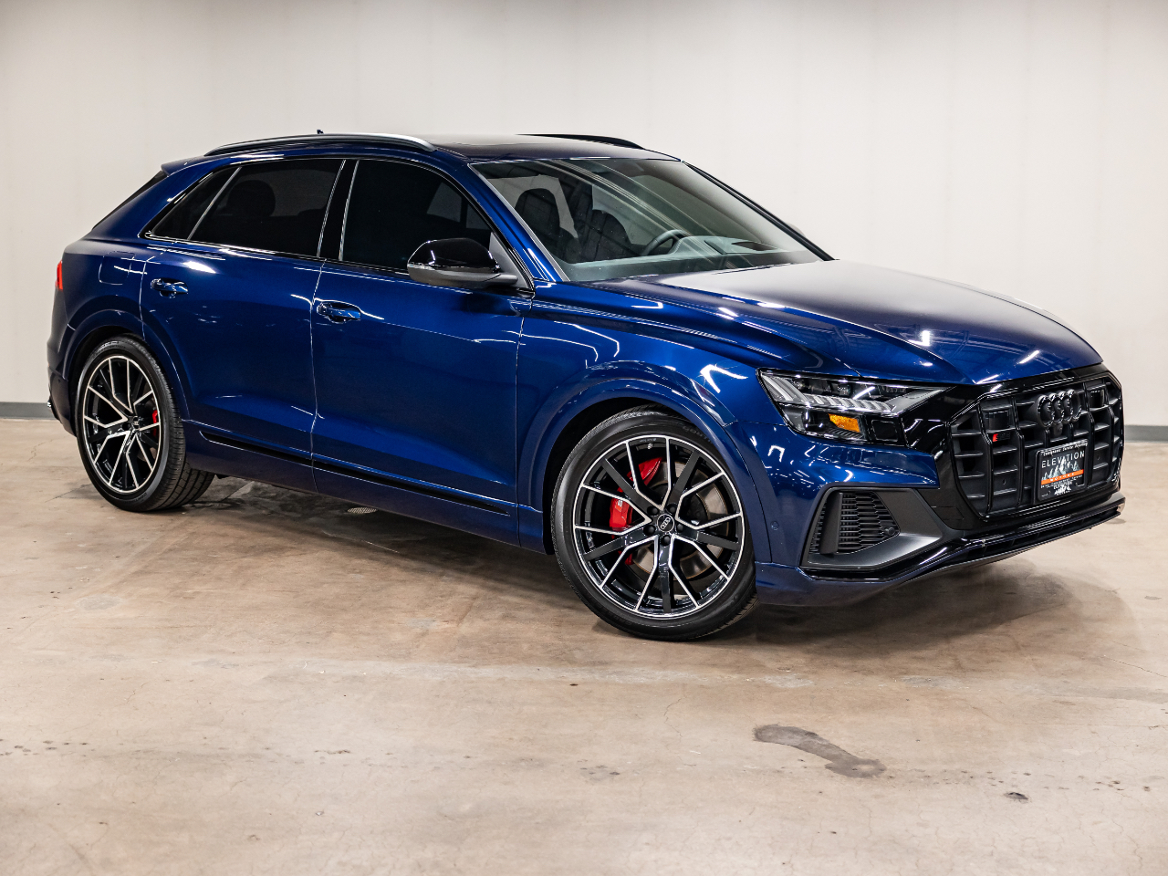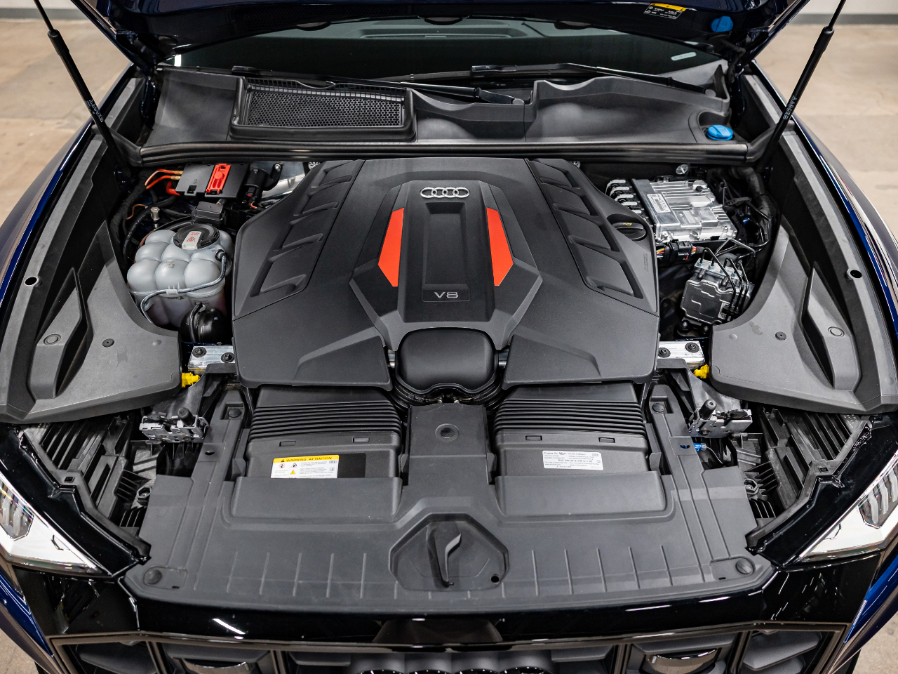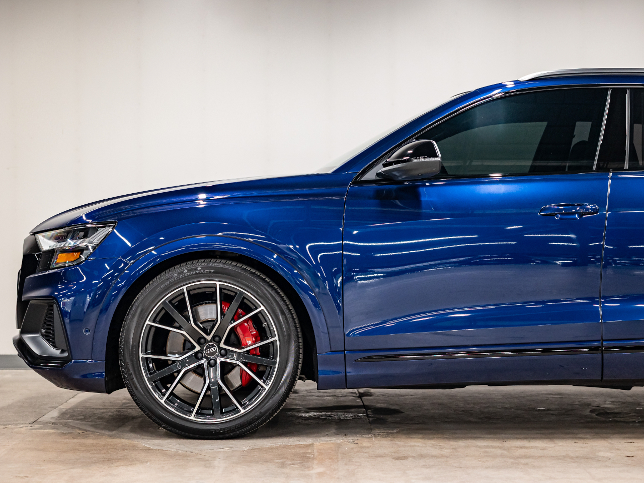 This SQ8 comes well-equipped with the Prestige Package, adding the Executive Package, head-up display, intersection assist, traffic sign recognition, power soft-closing doors, and remote park assist. Additional features include the Sport Package with active roll stabilization, red brake calipers, sport rear differential, night vision assist, Black Optics Package, towing package, Audi Guard protection kit, and black Audi rings and model badging. It rides on 22-inch 5-V-spoke-star design wheels with a bi-color finish, wrapped in Continental CrossContact tires.