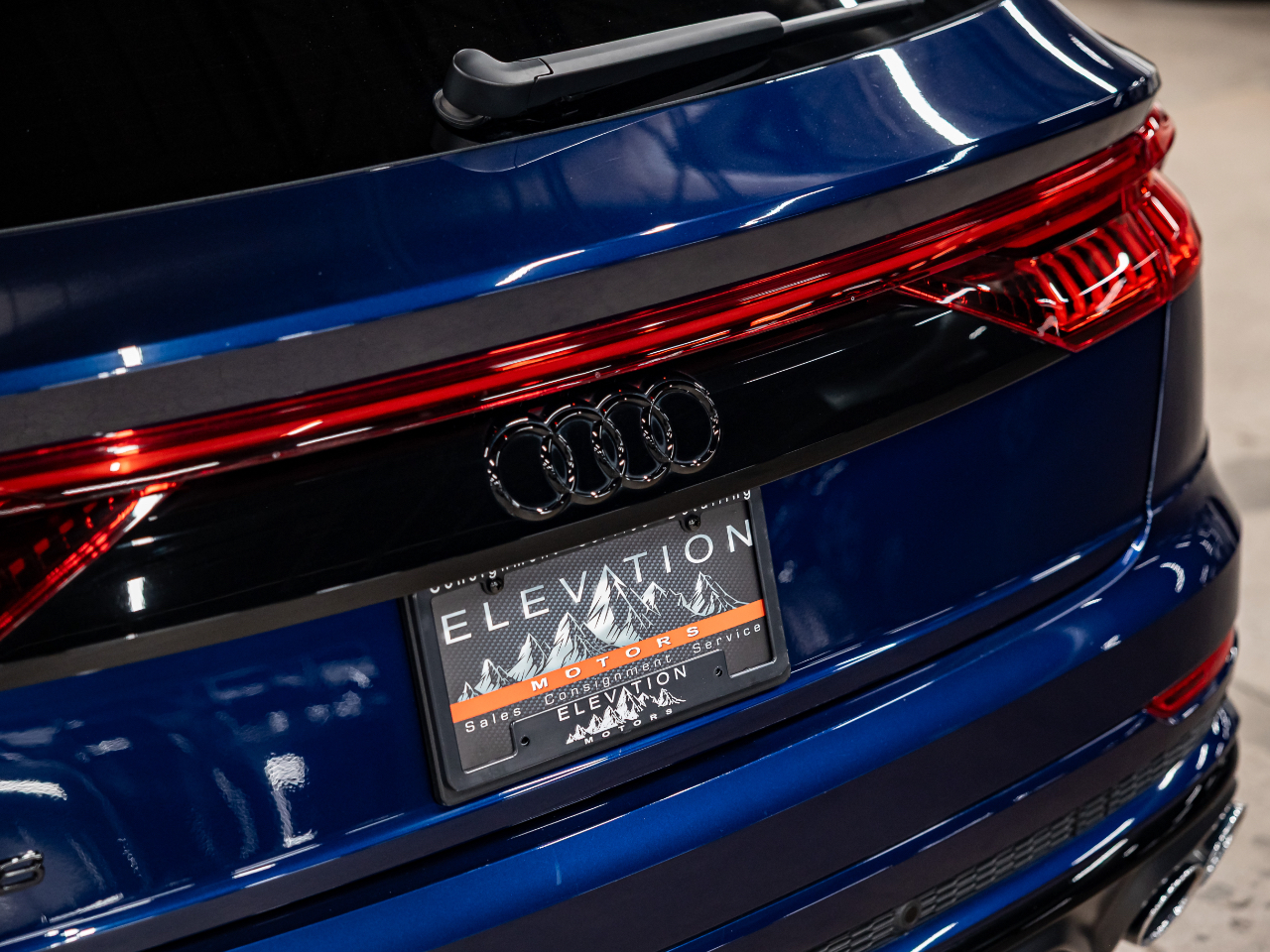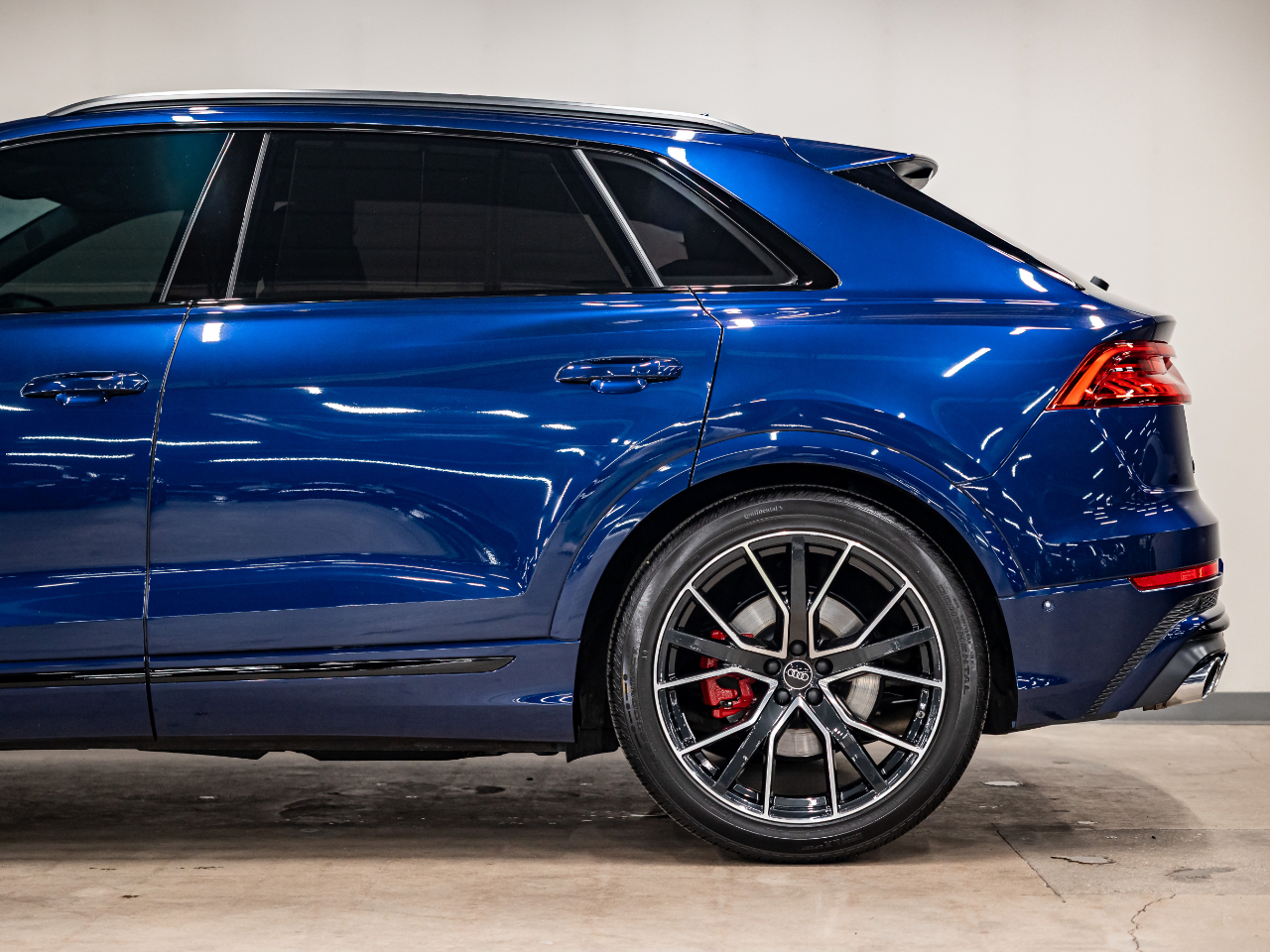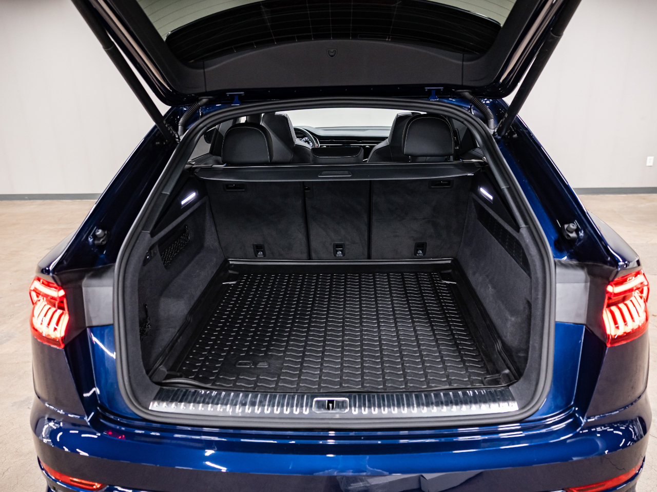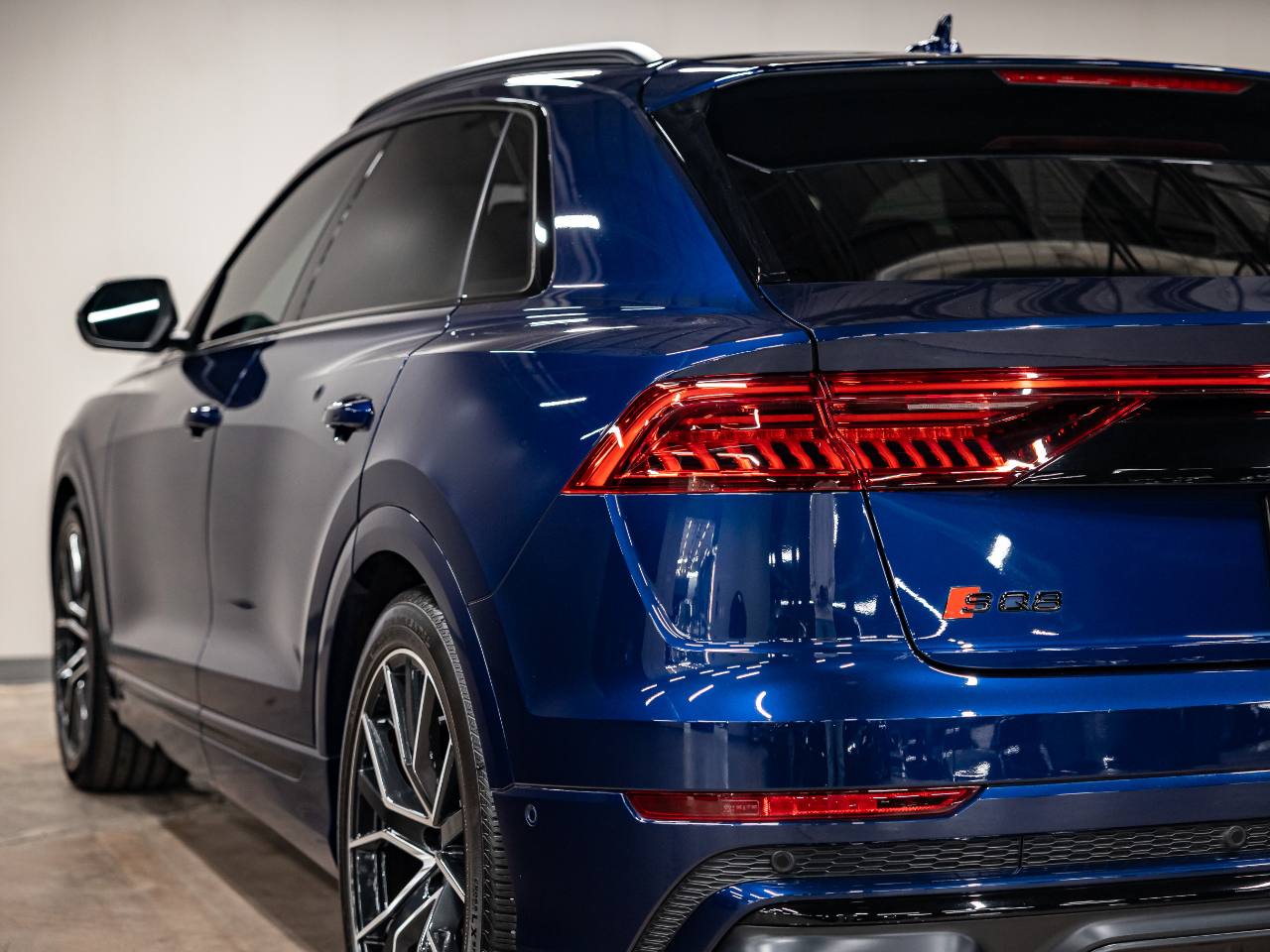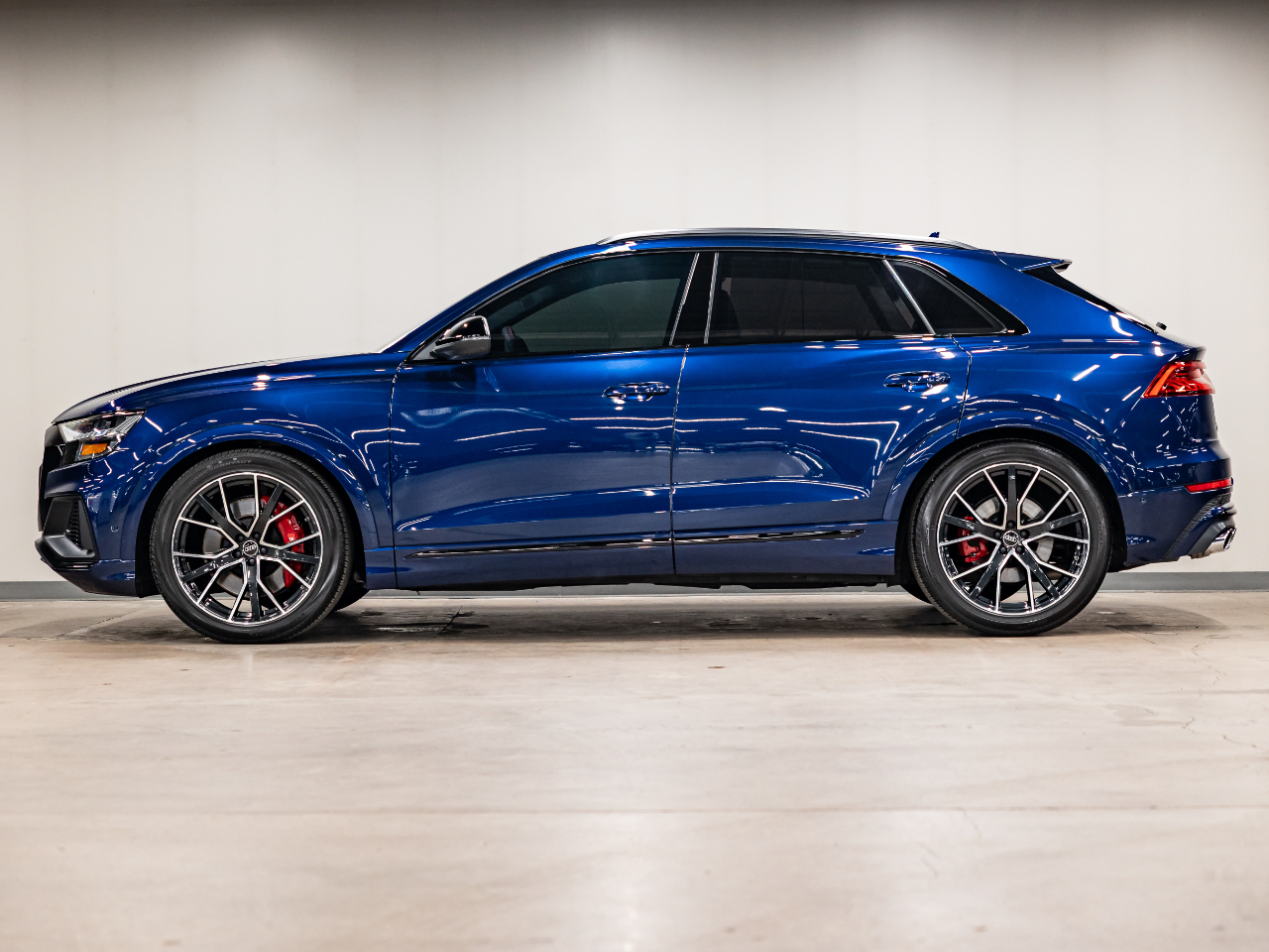 This SQ8 comes well-equipped with the Prestige Package, adding the Executive Package, head-up display, intersection assist, traffic sign recognition, power soft-closing doors, and remote park assist. Additional features include the Sport Package with active roll stabilization, red brake calipers, sport rear differential, night vision assist, Black Optics Package, towing package, Audi Guard protection kit, and black Audi rings and model badging. It rides on 22-inch 5-V-spoke-star design wheels with a bi-color finish, wrapped in Continental CrossContact tires.