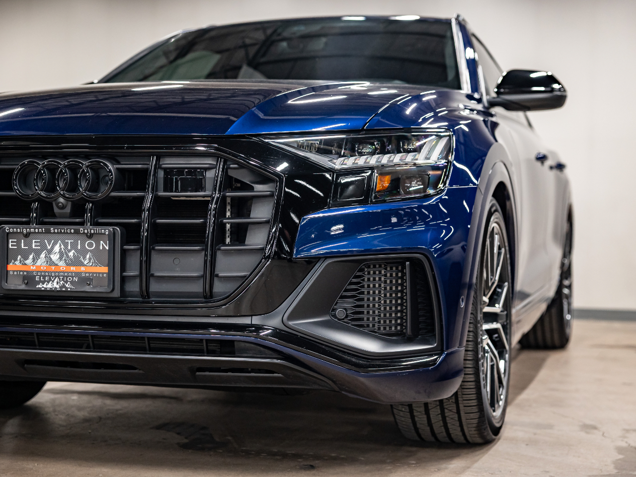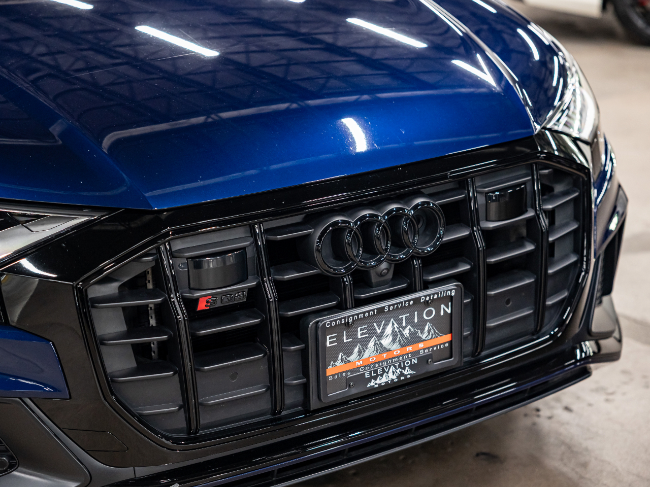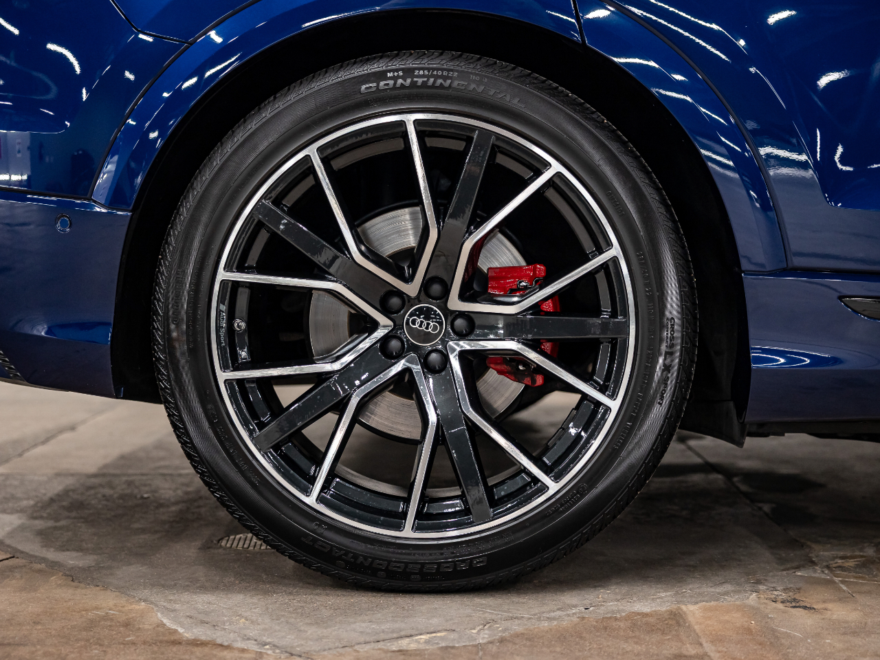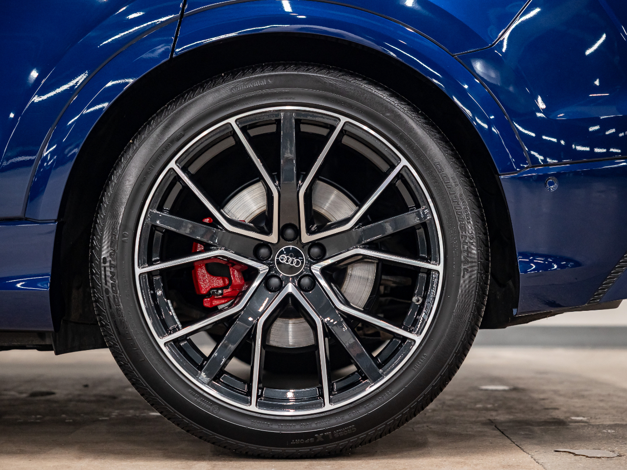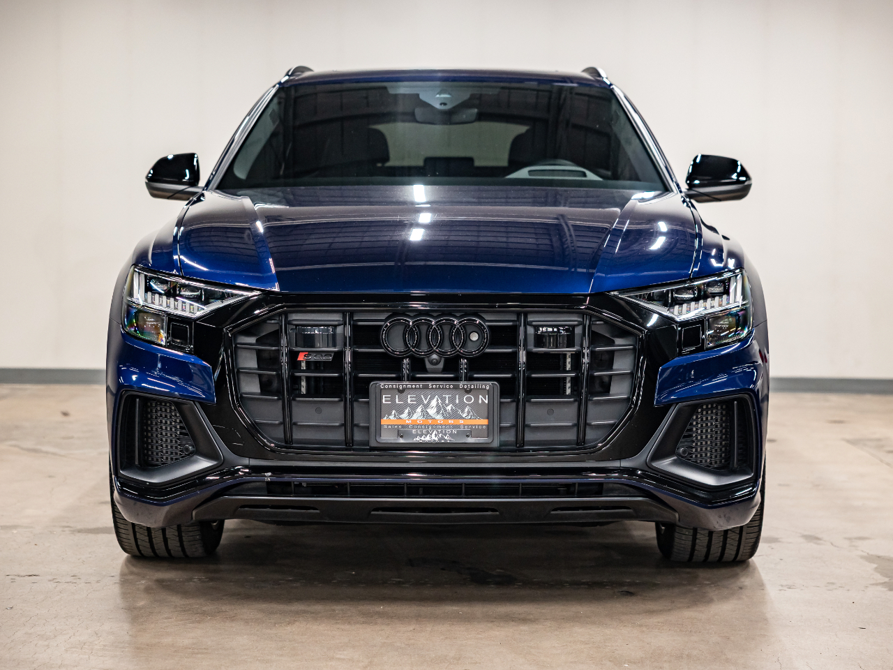 This SQ8 comes well-equipped with the Prestige Package, adding the Executive Package, head-up display, intersection assist, traffic sign recognition, power soft-closing doors, and remote park assist. Additional features include the Sport Package with active roll stabilization, red brake calipers, sport rear differential, night vision assist, Black Optics Package, towing package, Audi Guard protection kit, and black Audi rings and model badging. It rides on 22-inch 5-V-spoke-star design wheels with a bi-color finish, wrapped in Continental CrossContact tires.