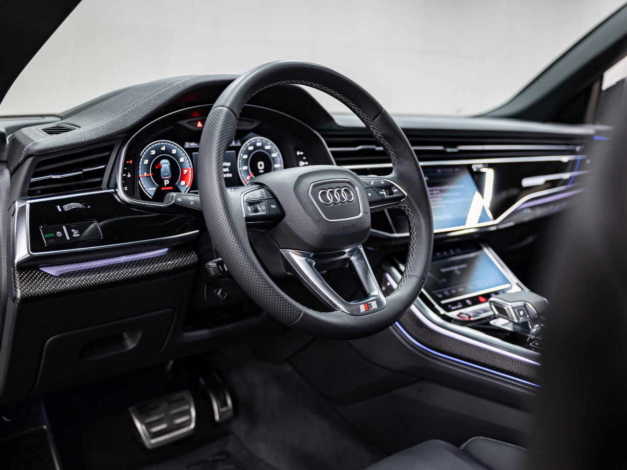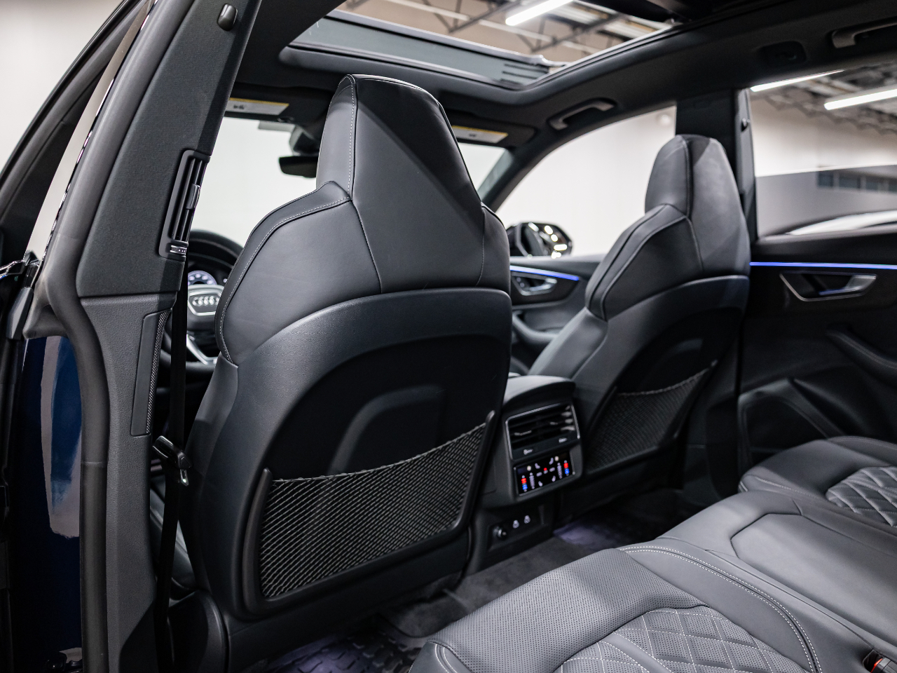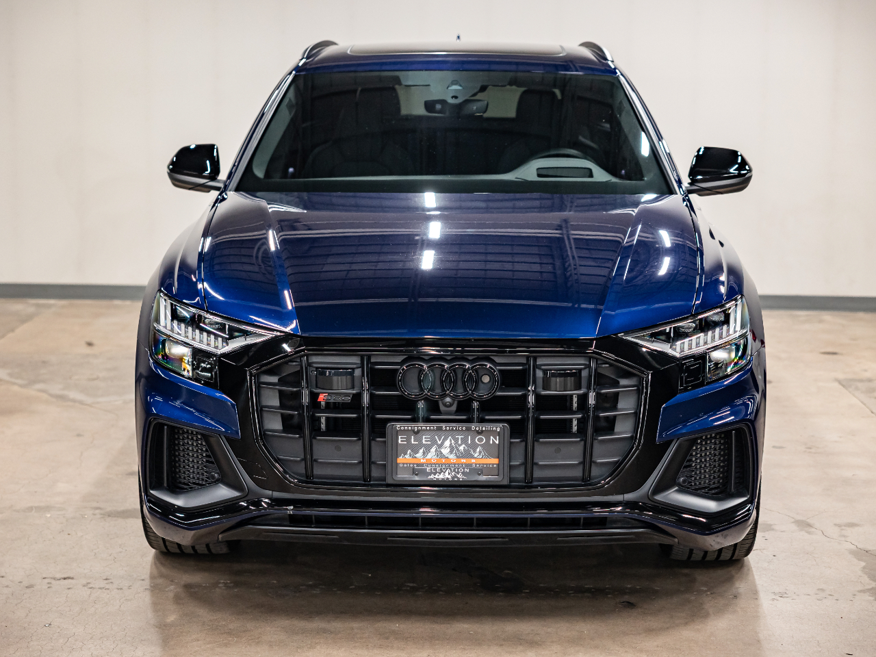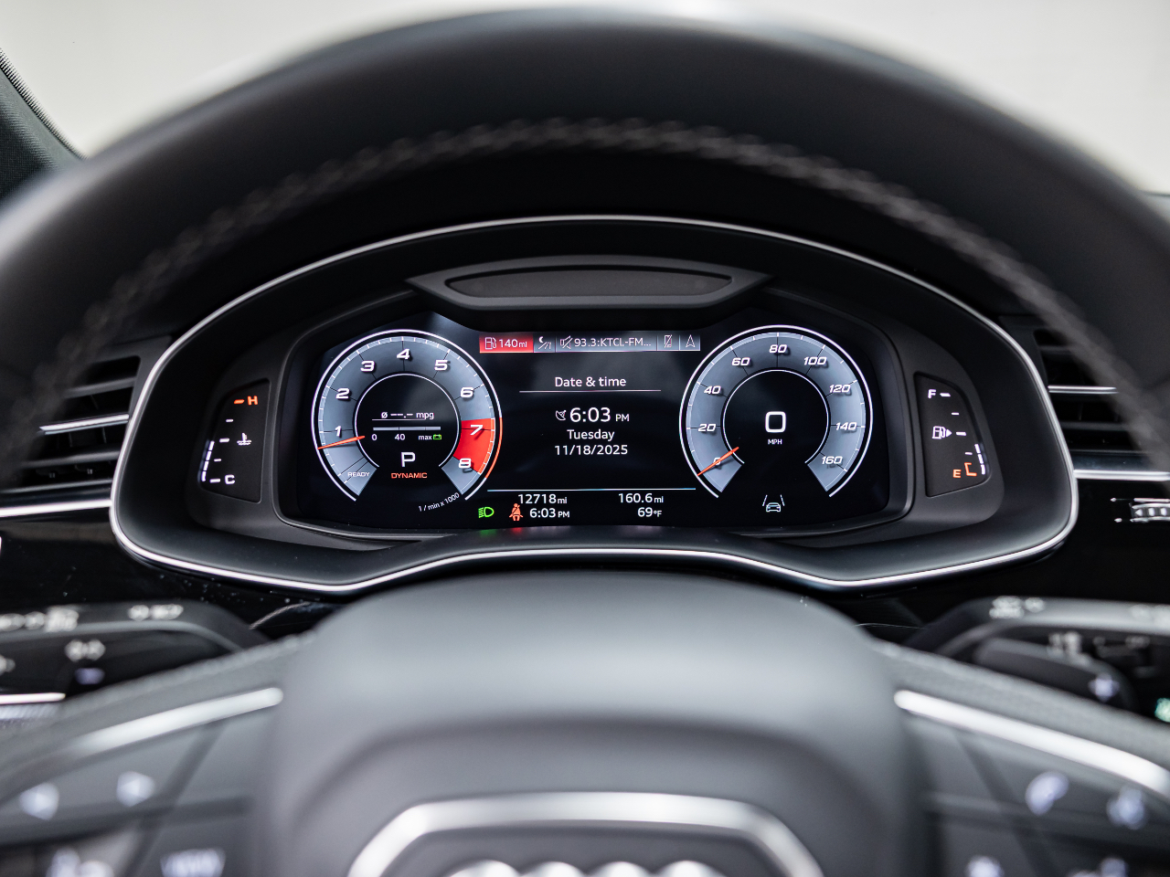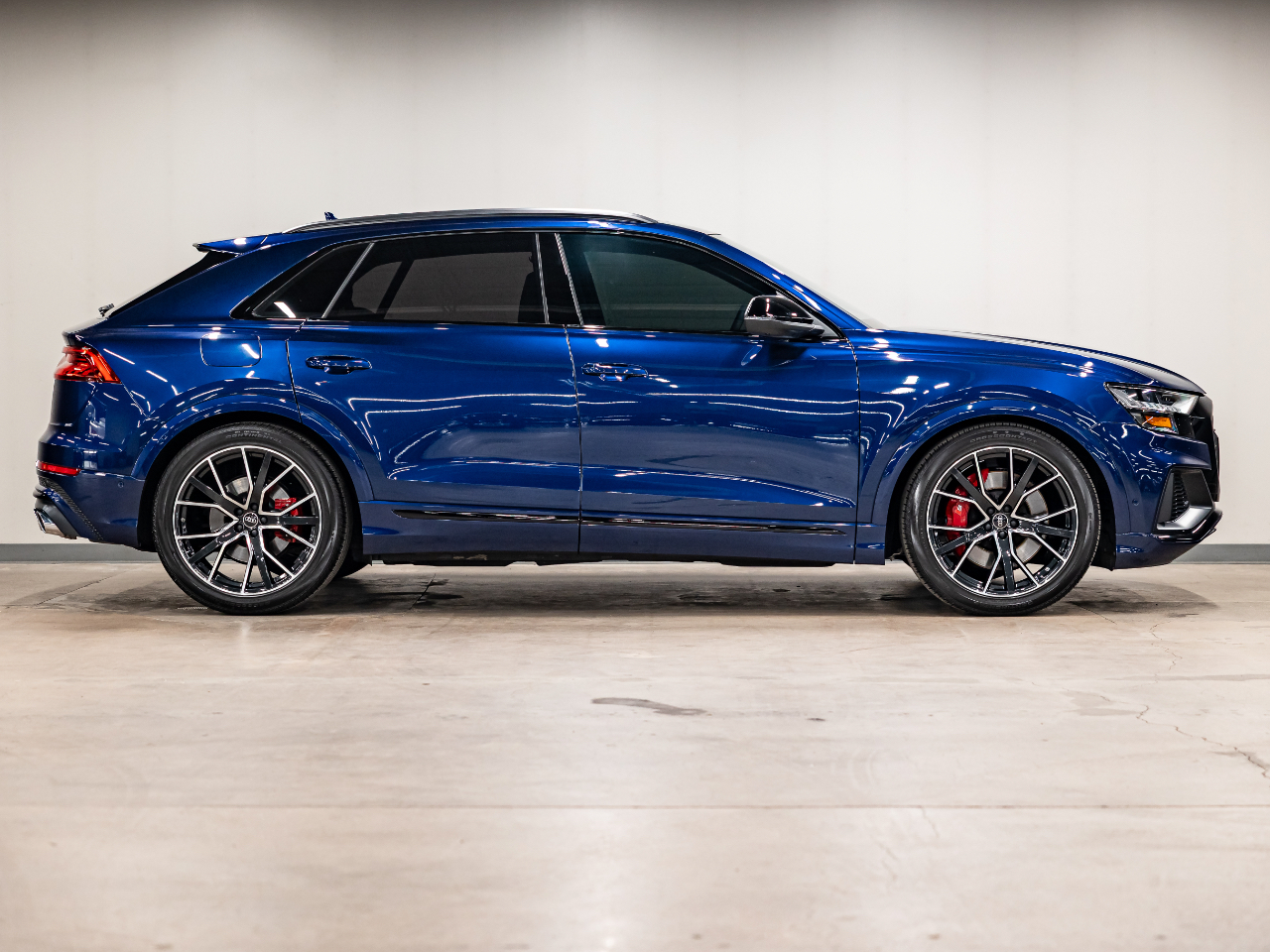 This SQ8 comes well-equipped with the Prestige Package, adding the Executive Package, head-up display, intersection assist, traffic sign recognition, power soft-closing doors, and remote park assist. Additional features include the Sport Package with active roll stabilization, red brake calipers, sport rear differential, night vision assist, Black Optics Package, towing package, Audi Guard protection kit, and black Audi rings and model badging. It rides on 22-inch 5-V-spoke-star design wheels with a bi-color finish, wrapped in Continental CrossContact tires.