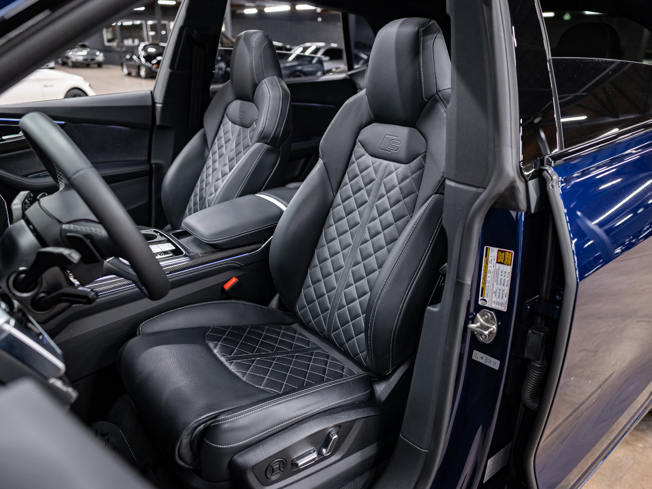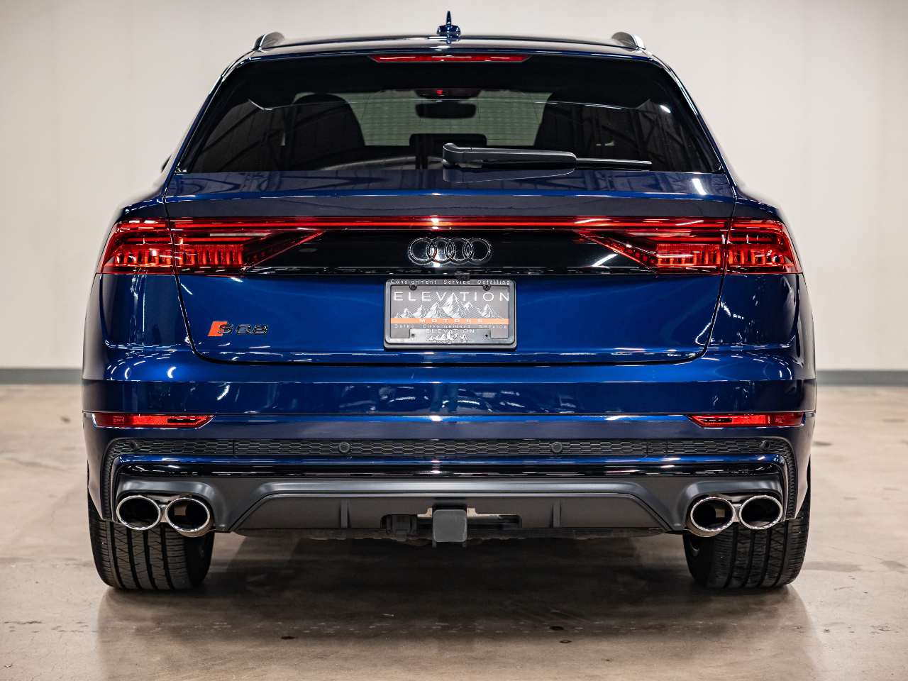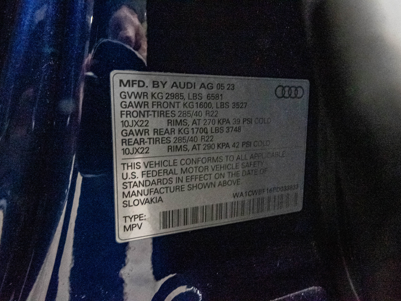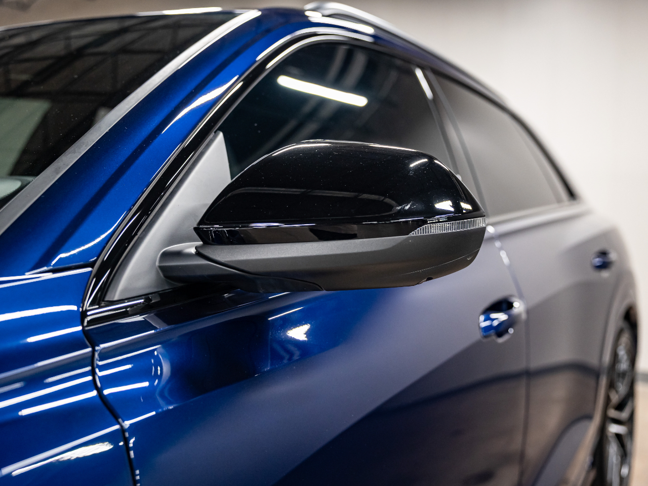 This SQ8 comes well-equipped with the Prestige Package, adding the Executive Package, head-up display, intersection assist, traffic sign recognition, power soft-closing doors, and remote park assist. Additional features include the Sport Package with active roll stabilization, red brake calipers, sport rear differential, night vision assist, Black Optics Package, towing package, Audi Guard protection kit, and black Audi rings and model badging. It rides on 22-inch 5-V-spoke-star design wheels with a bi-color finish, wrapped in Continental CrossContact tires.