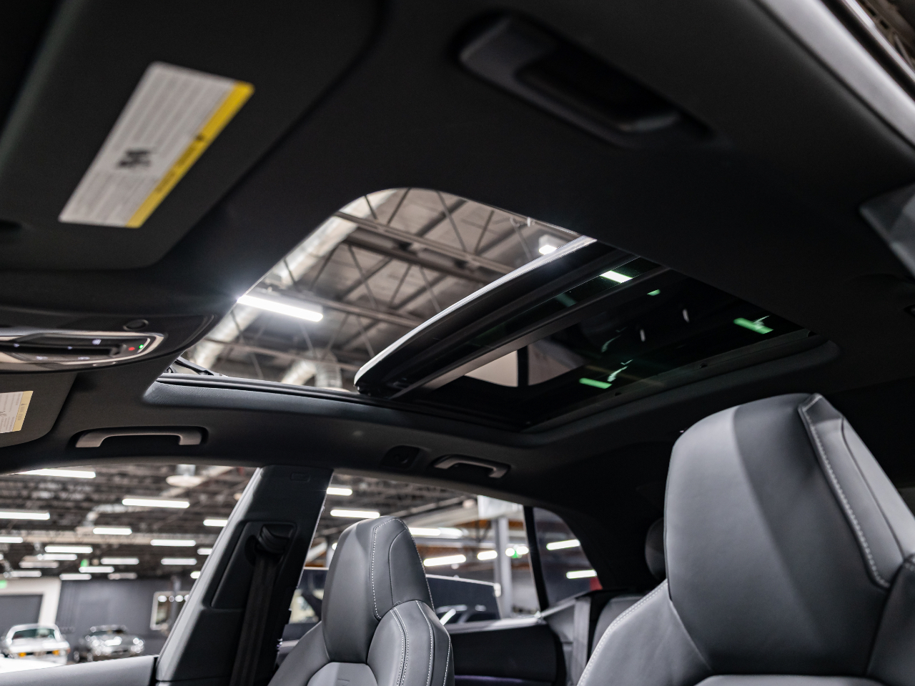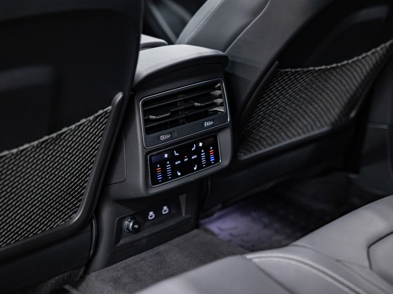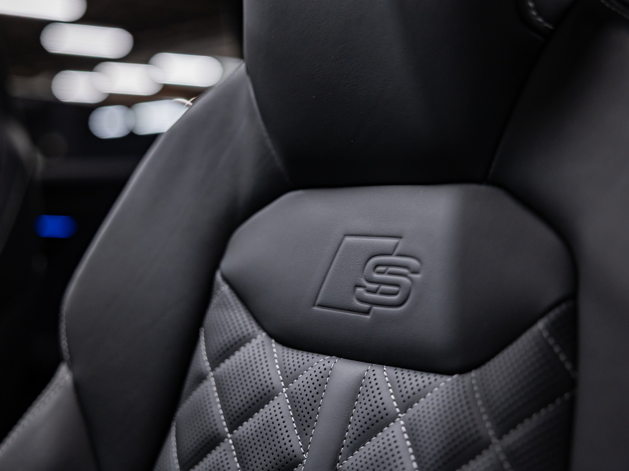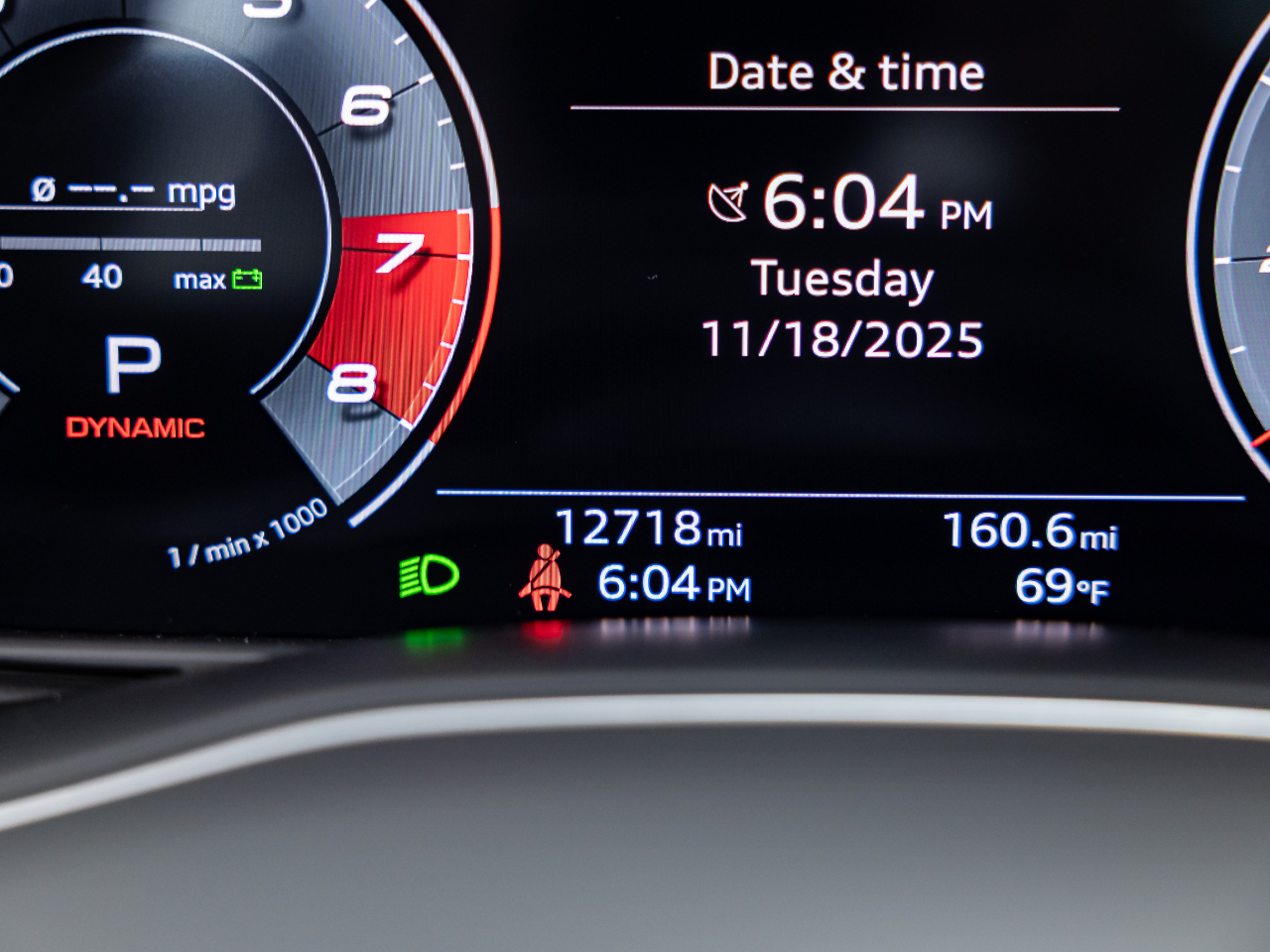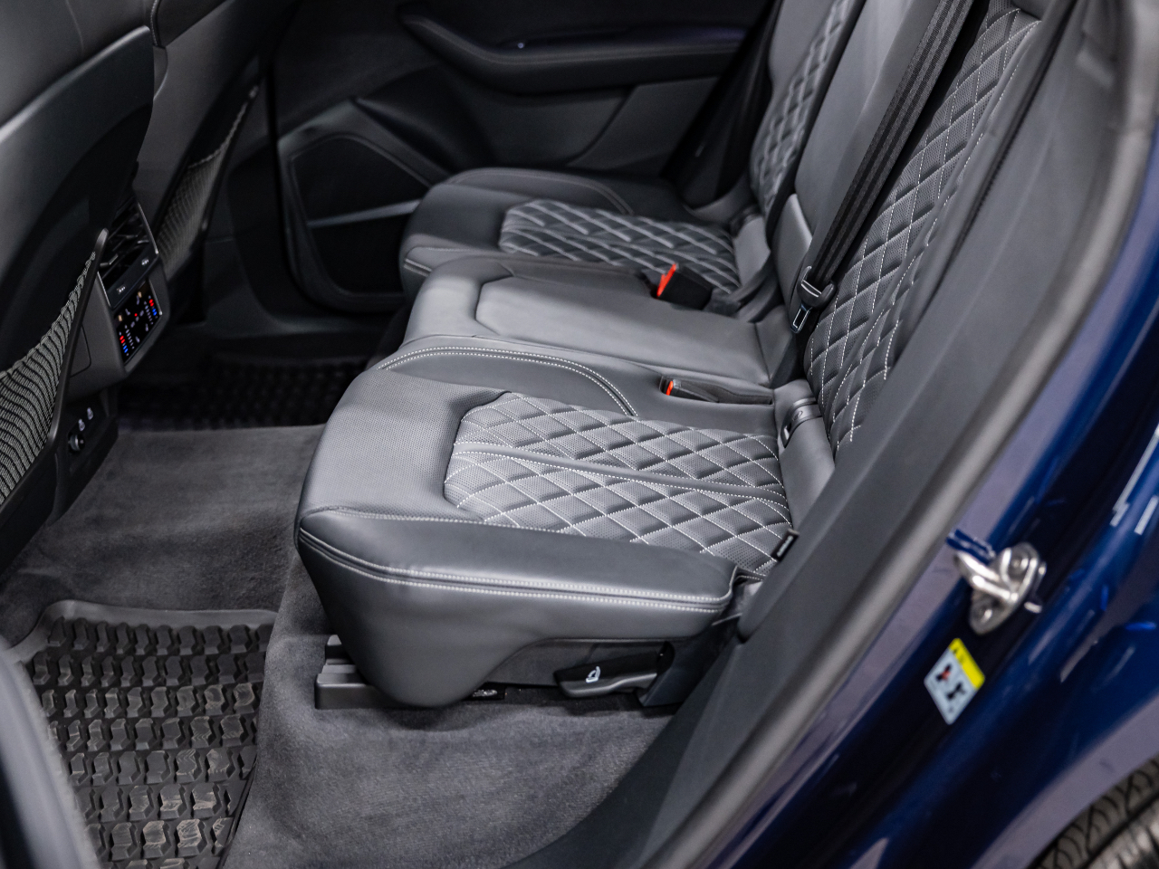 This SQ8 comes well-equipped with the Prestige Package, adding the Executive Package, head-up display, intersection assist, traffic sign recognition, power soft-closing doors, and remote park assist. Additional features include the Sport Package with active roll stabilization, red brake calipers, sport rear differential, night vision assist, Black Optics Package, towing package, Audi Guard protection kit, and black Audi rings and model badging. It rides on 22-inch 5-V-spoke-star design wheels with a bi-color finish, wrapped in Continental CrossContact tires.