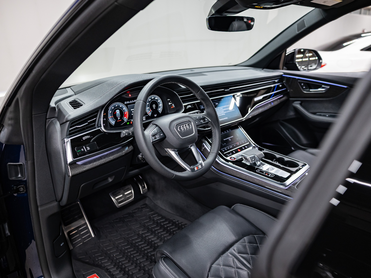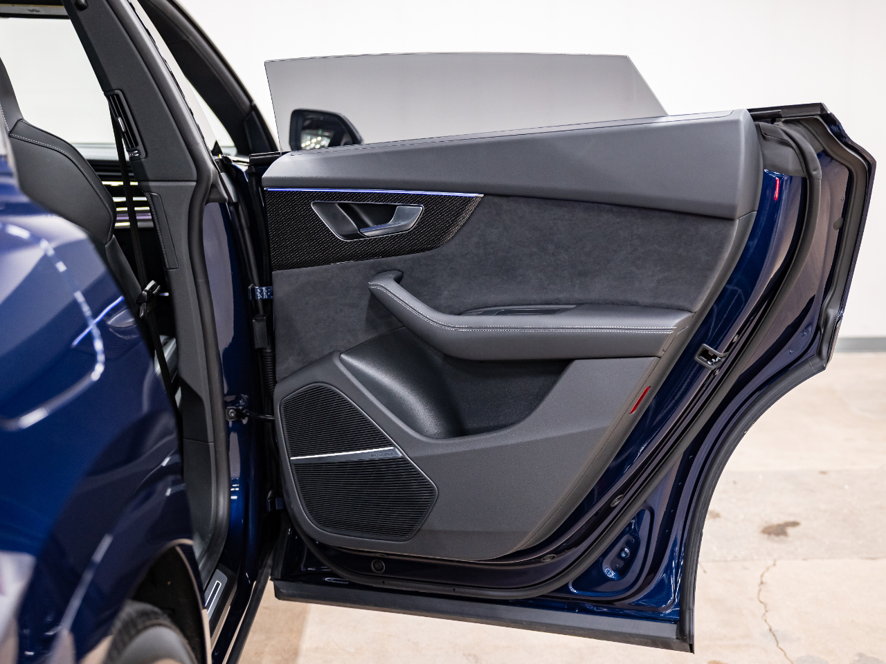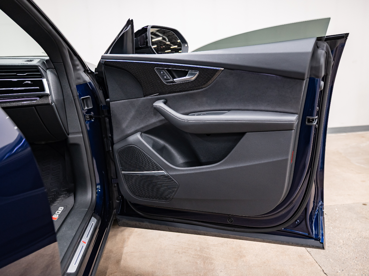This 2023 Audi SQ8 Prestige is finished in Navarra Blue Metallic over Black leather with carbon fiber interior trim. Power comes from a 4.0L TFSI twin-turbocharged V8 producing 500 horsepower and 568 lb-ft of torque, sent to all four wheels through an 8-speed automatic transmission and Audi’s Quattro all-wheel-drive system.