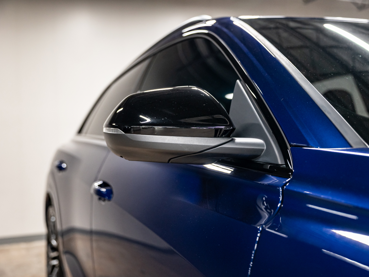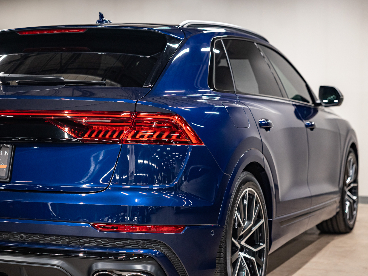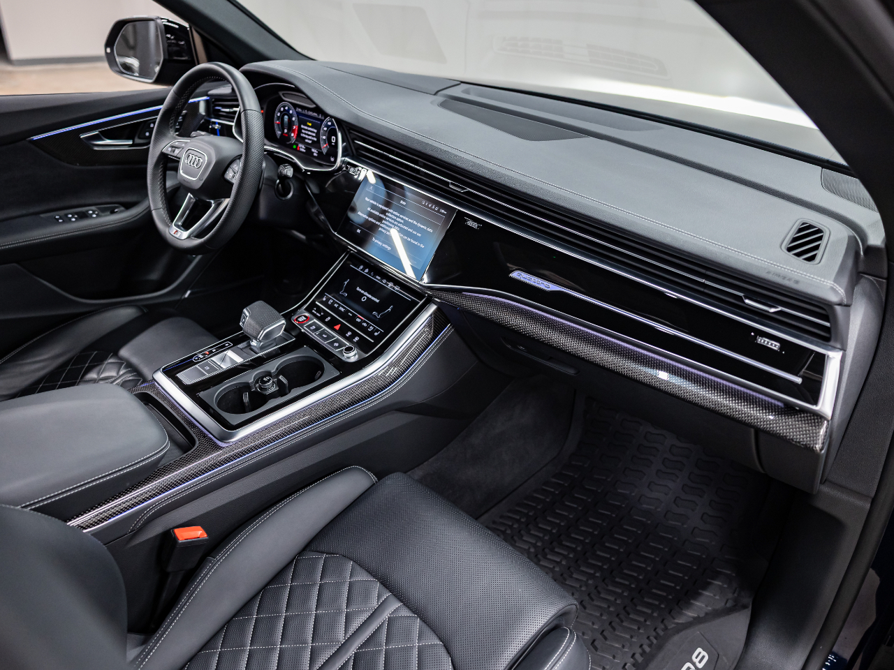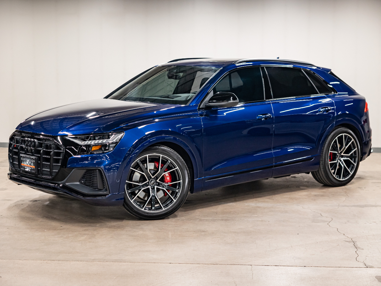 This 2023 Audi SQ8 Prestige is finished in Navarra Blue Metallic over Black leather with carbon fiber interior trim. Power comes from a 4.0L TFSI twin-turbocharged V8 producing 500 horsepower and 568 lb-ft of torque, sent to all four wheels through an 8-speed automatic transmission and Audi’s Quattro all-wheel-drive system.