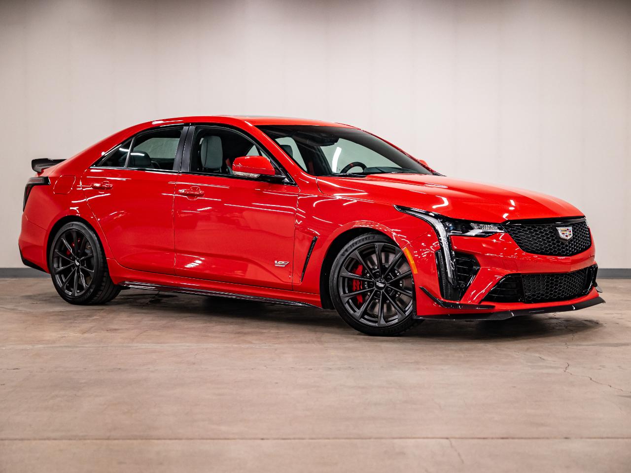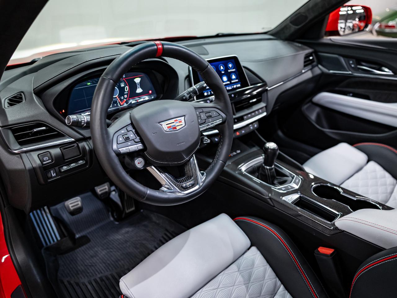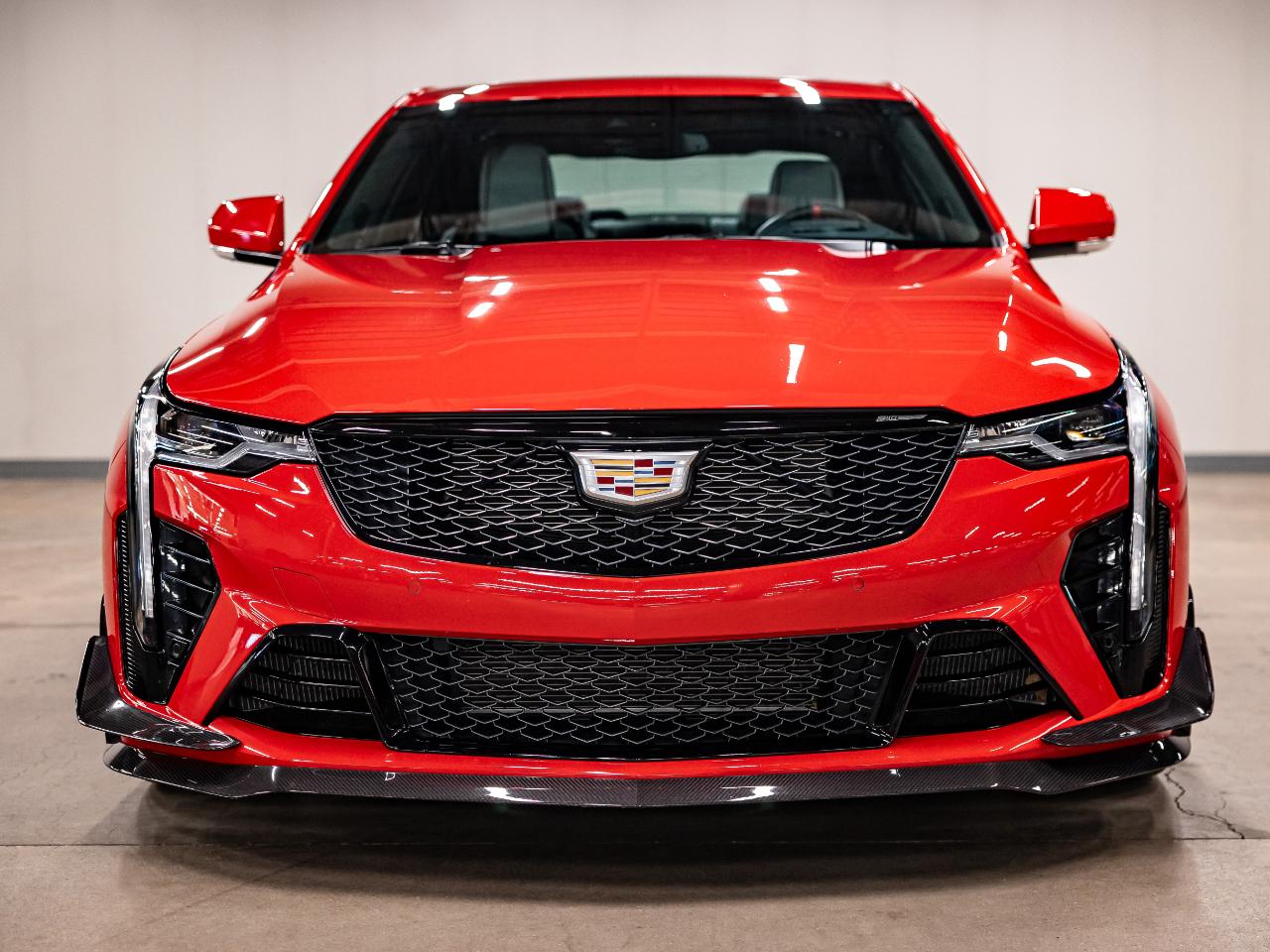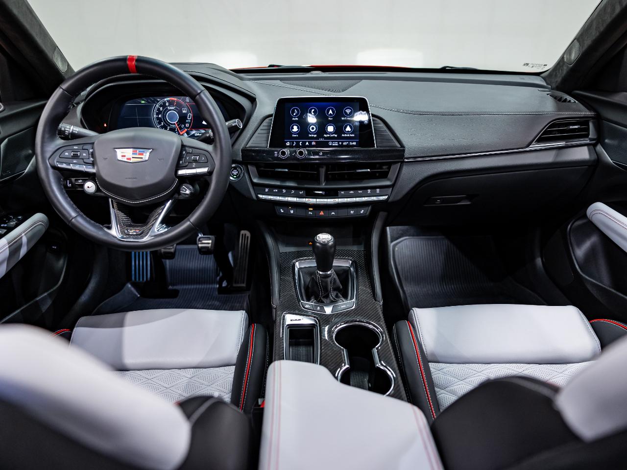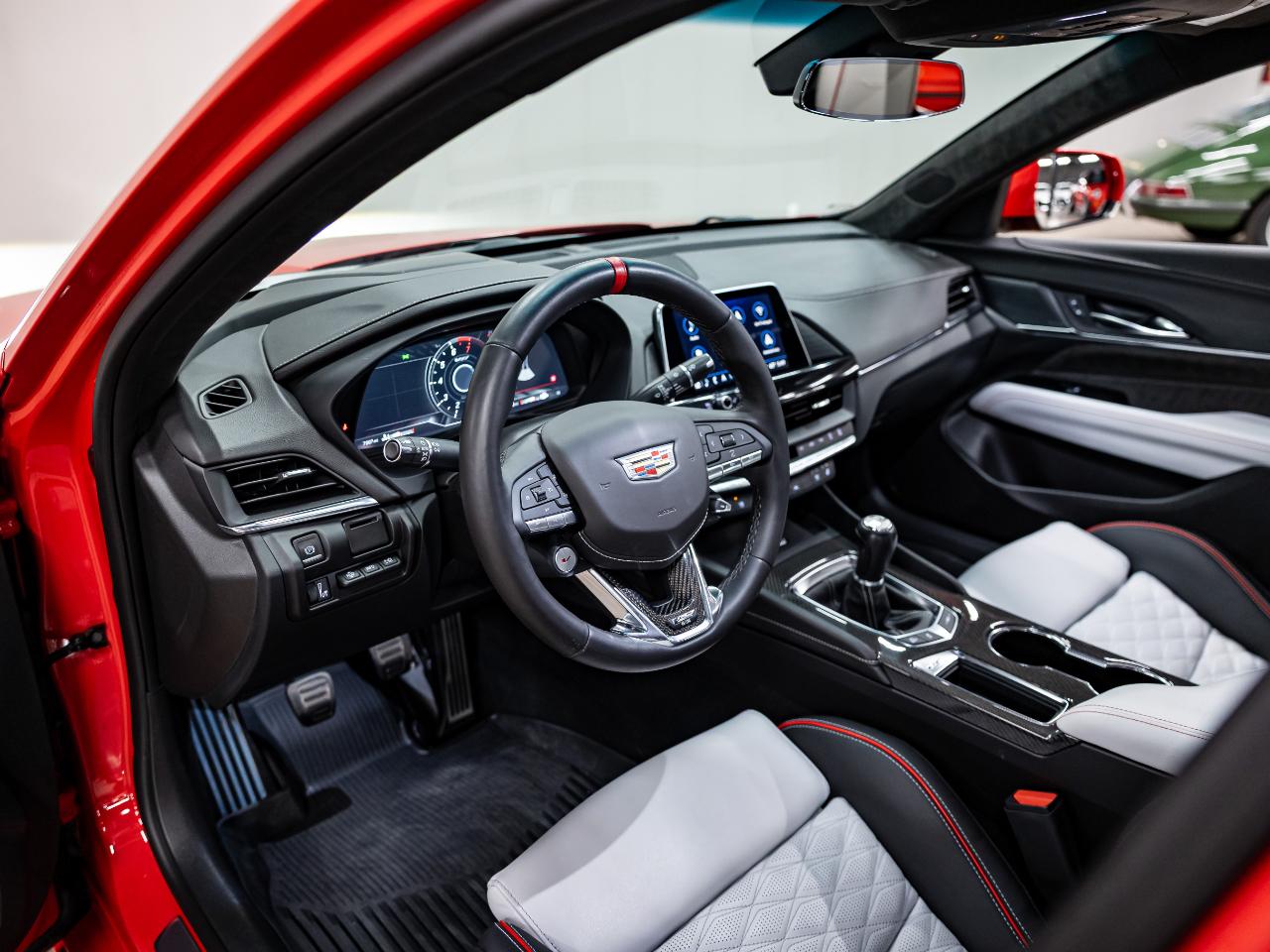 This 2024 Cadillac CT4-V Blackwing is finished in Velocity Red over a Sky Cool Gray interior with Jet Black accents, trimmed in leather and suede microfiber. Power comes from a 3.6-liter twin-turbocharged V6 producing 472 horsepower and 445 lb-ft of torque, sent to the rear wheels through a 6-speed manual transmission.