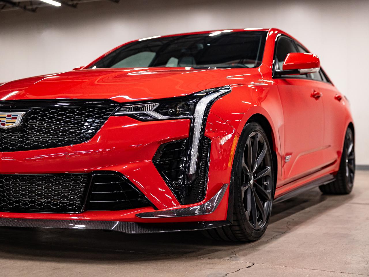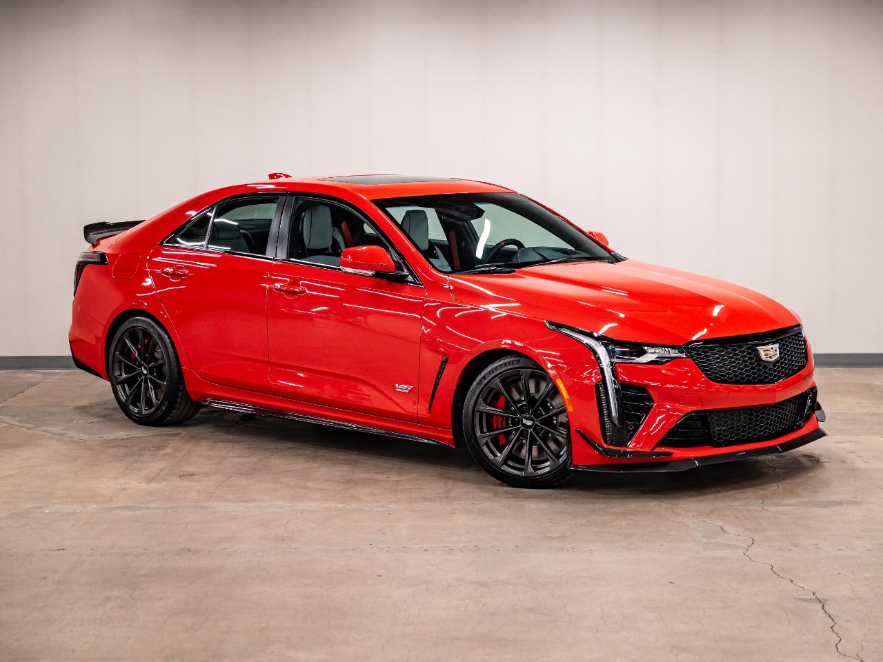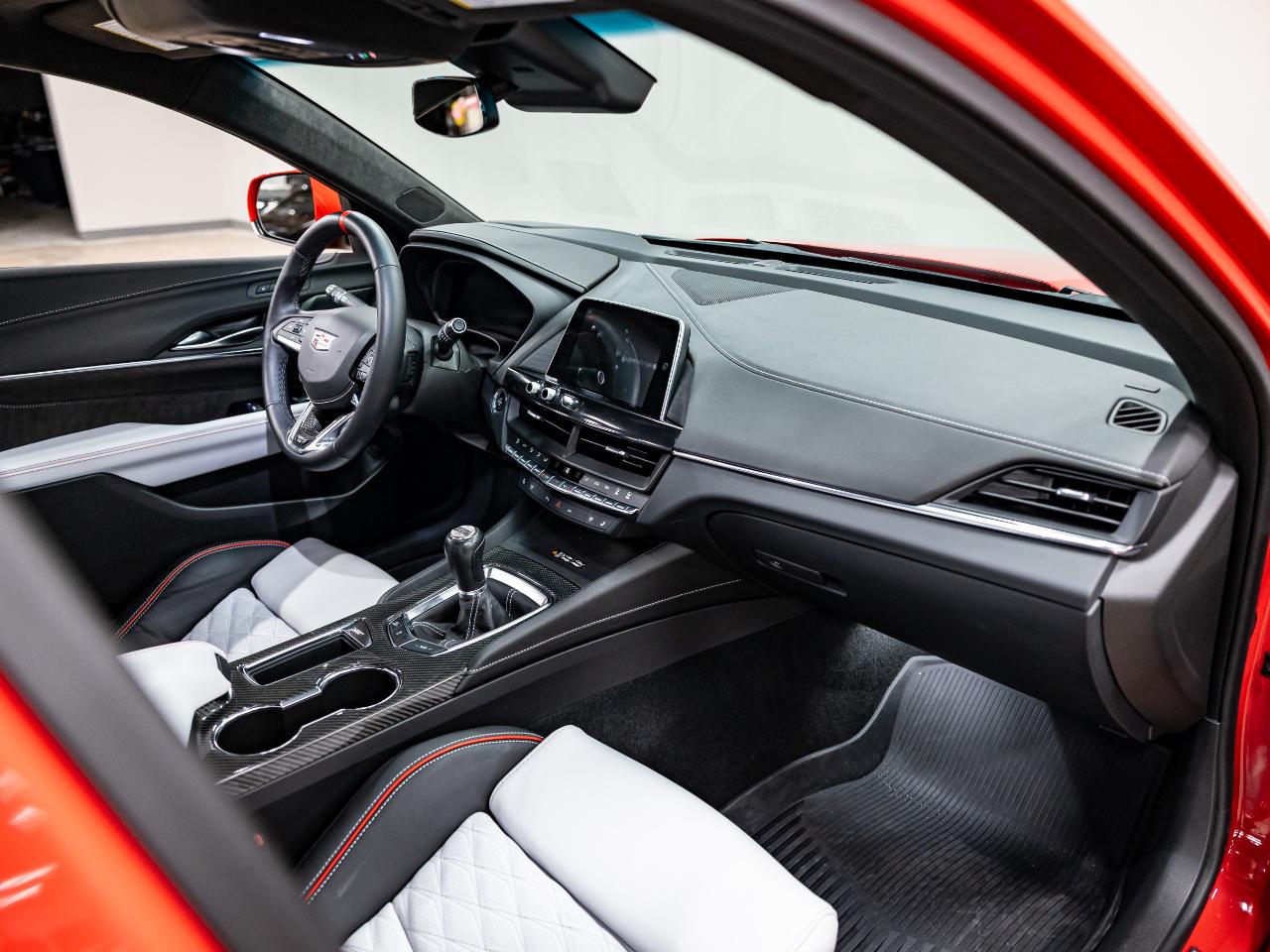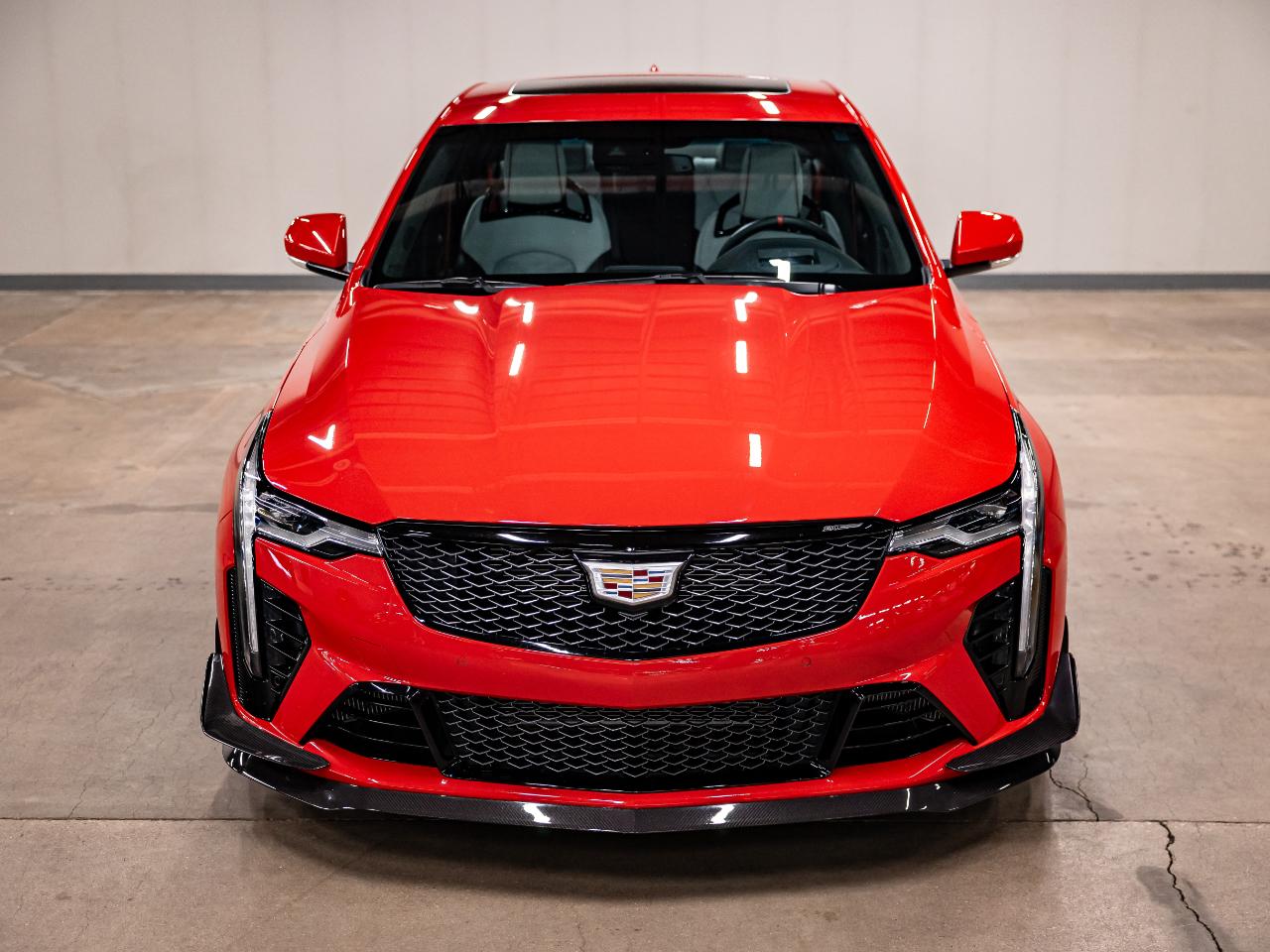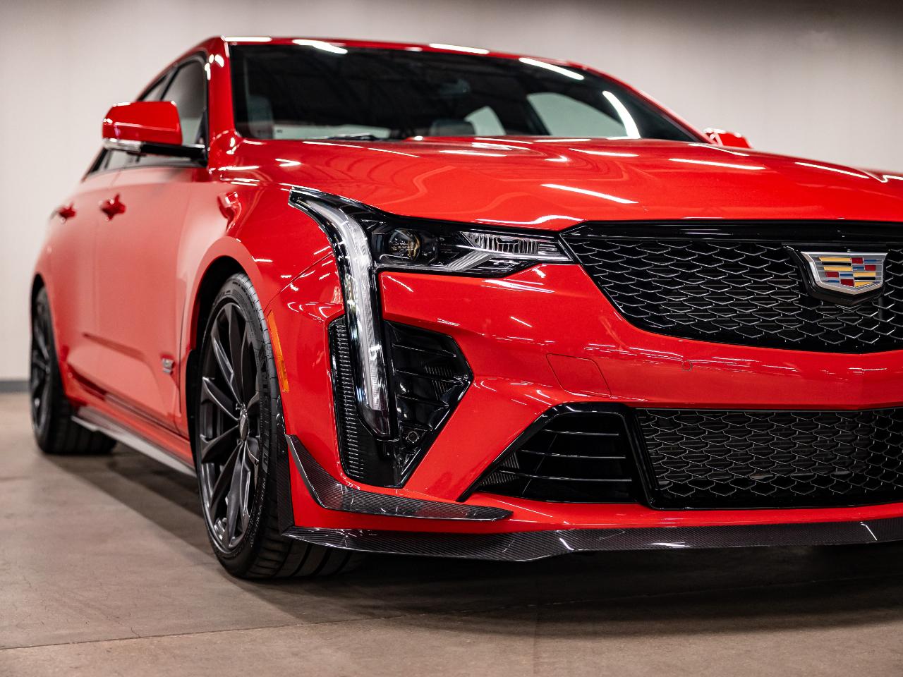 This 2024 Cadillac CT4-V Blackwing is finished in Velocity Red over a Sky Cool Gray interior with Jet Black accents, trimmed in leather and suede microfiber. Power comes from a 3.6-liter twin-turbocharged V6 producing 472 horsepower and 445 lb-ft of torque, sent to the rear wheels through a 6-speed manual transmission.