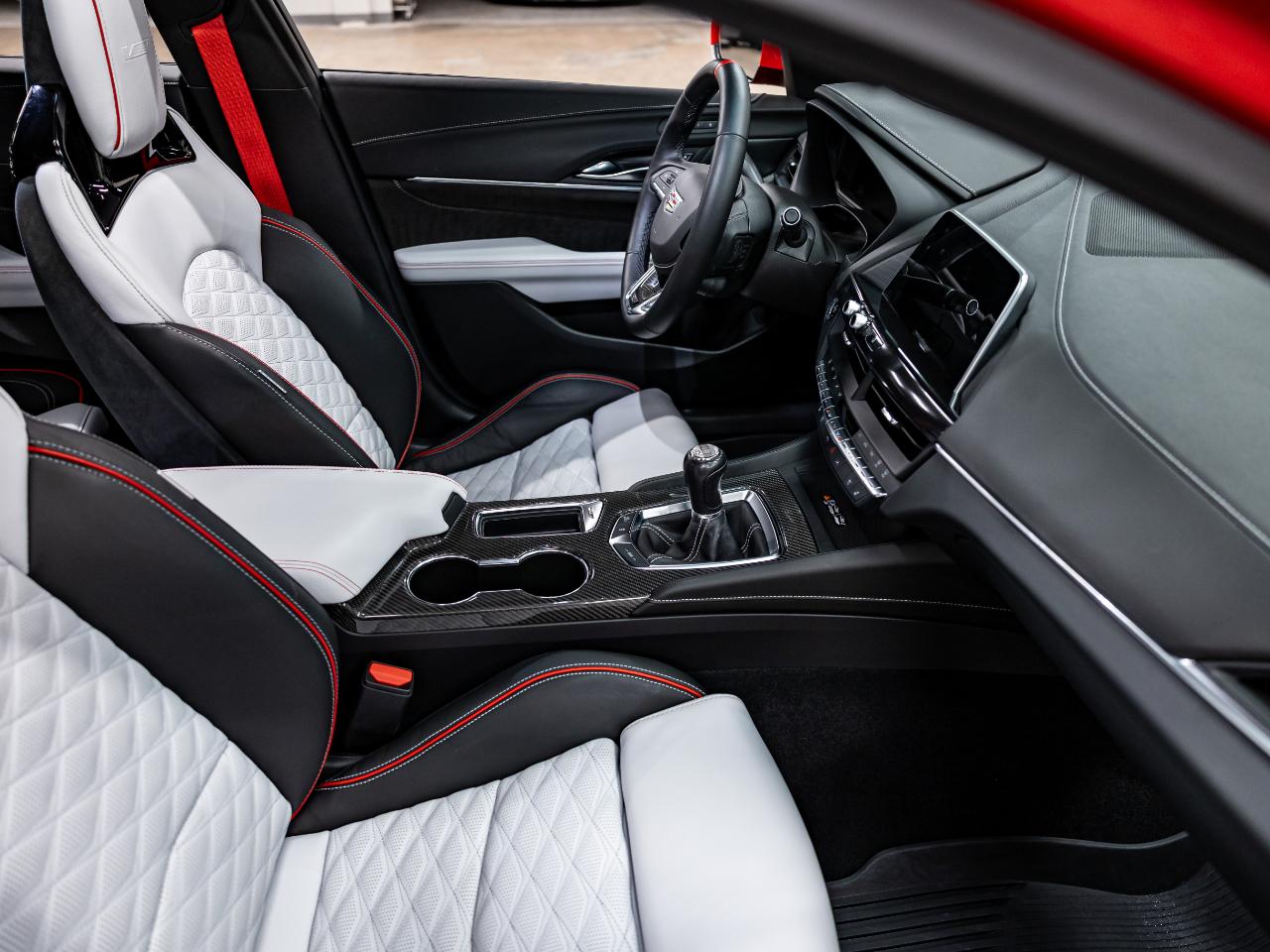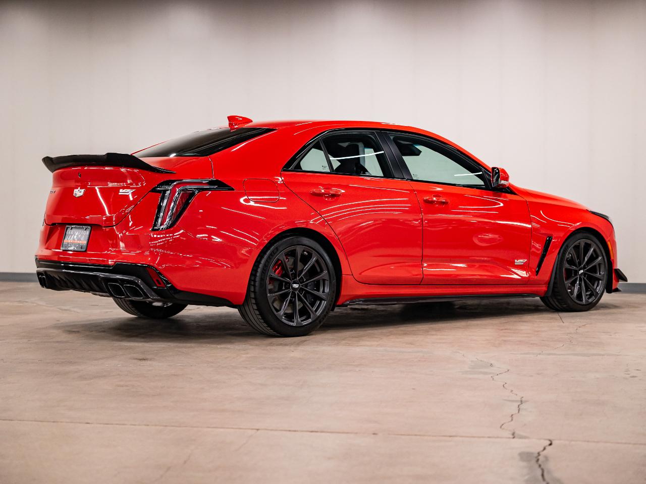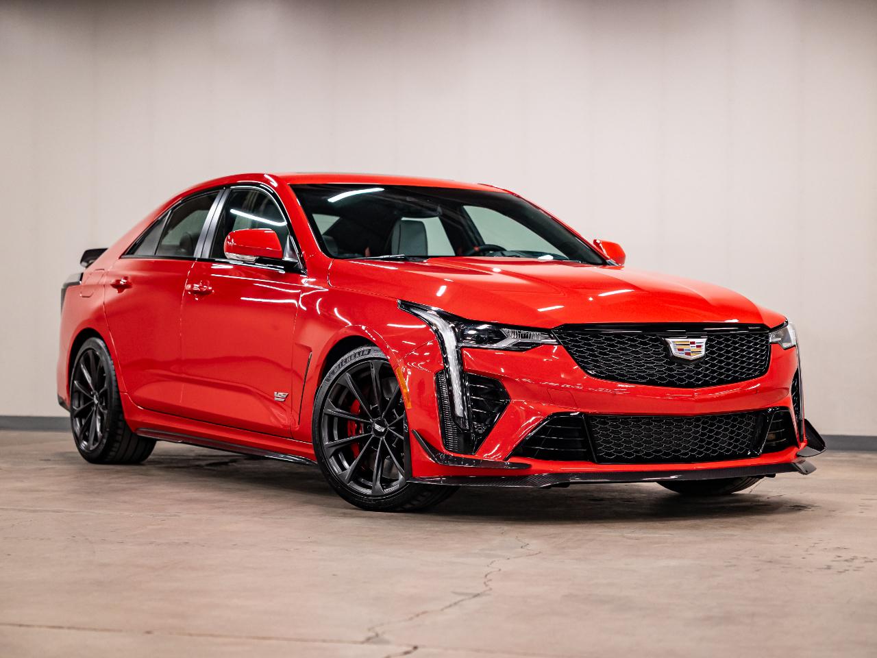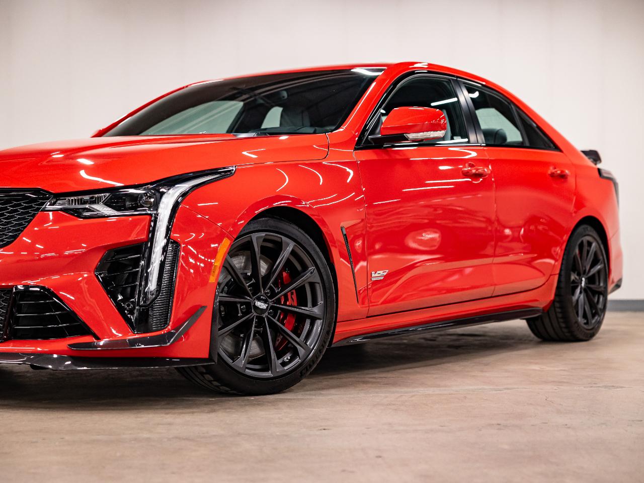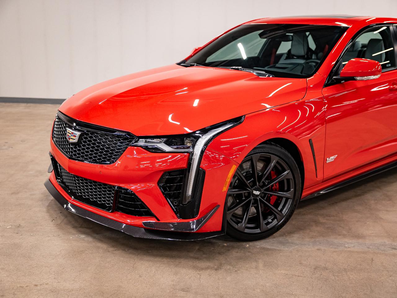 This 2024 Cadillac CT4-V Blackwing is finished in Velocity Red over a Sky Cool Gray interior with Jet Black accents, trimmed in leather and suede microfiber. Power comes from a 3.6-liter twin-turbocharged V6 producing 472 horsepower and 445 lb-ft of torque, sent to the rear wheels through a 6-speed manual transmission.
