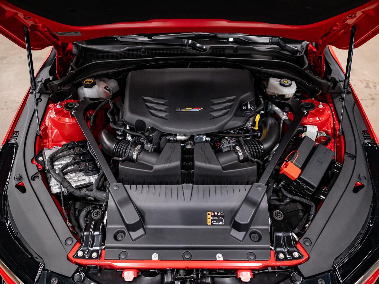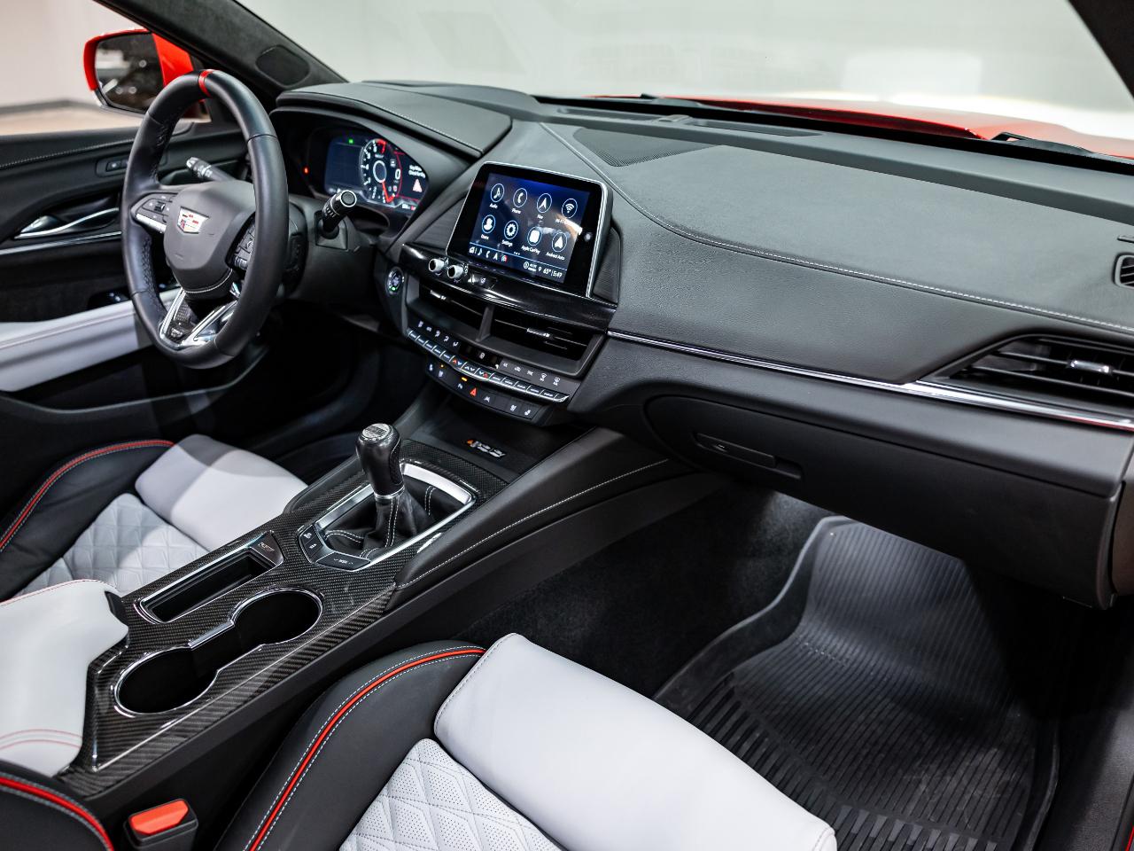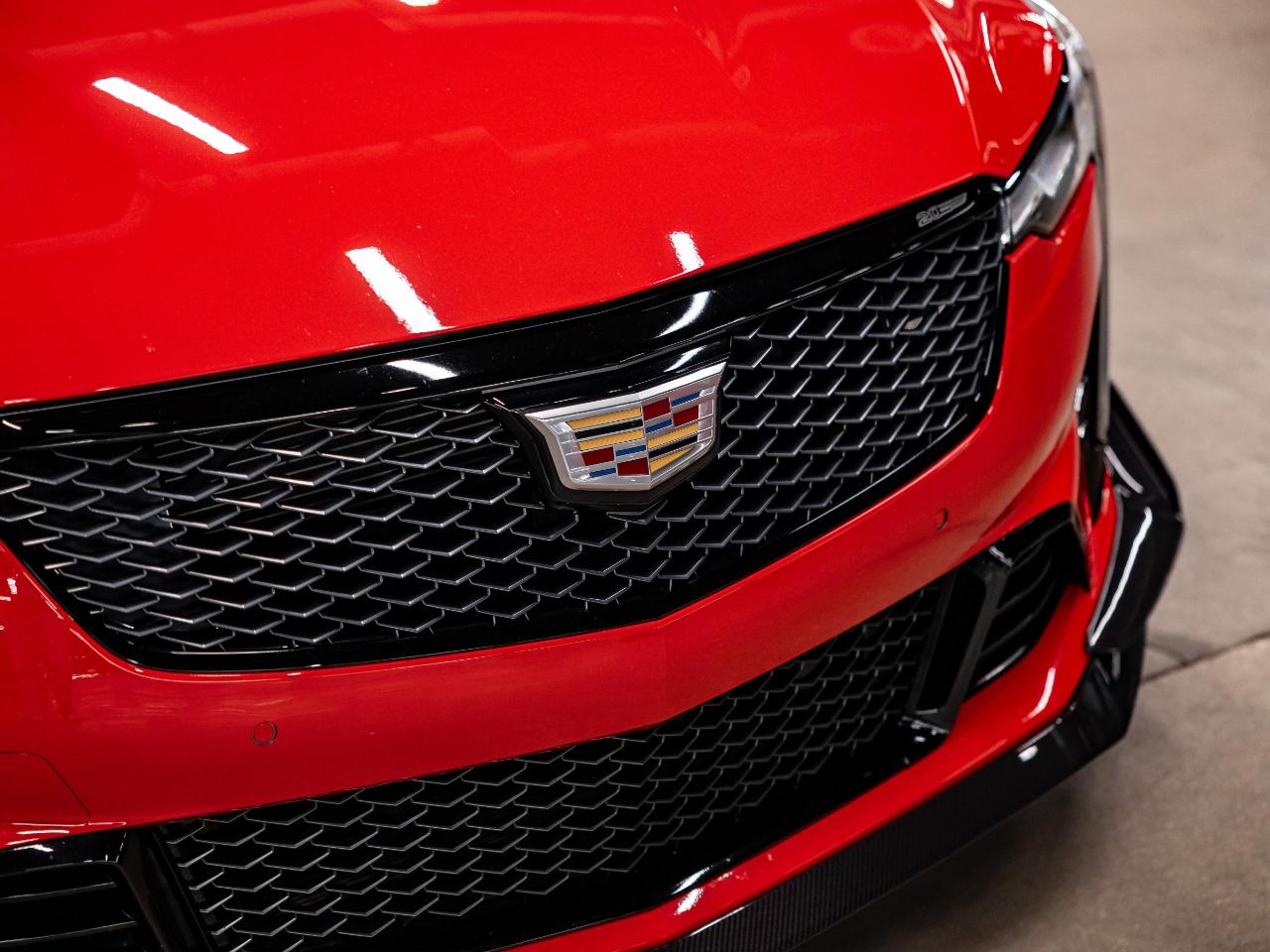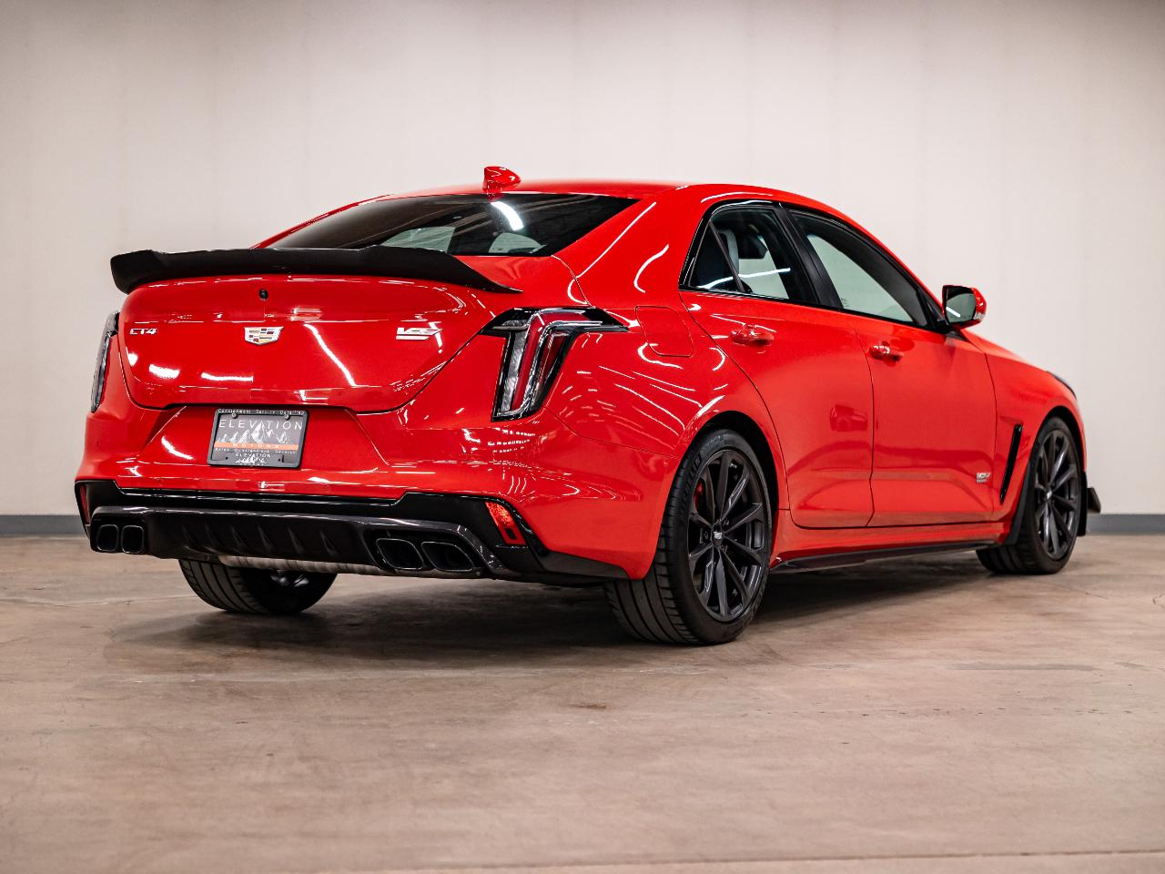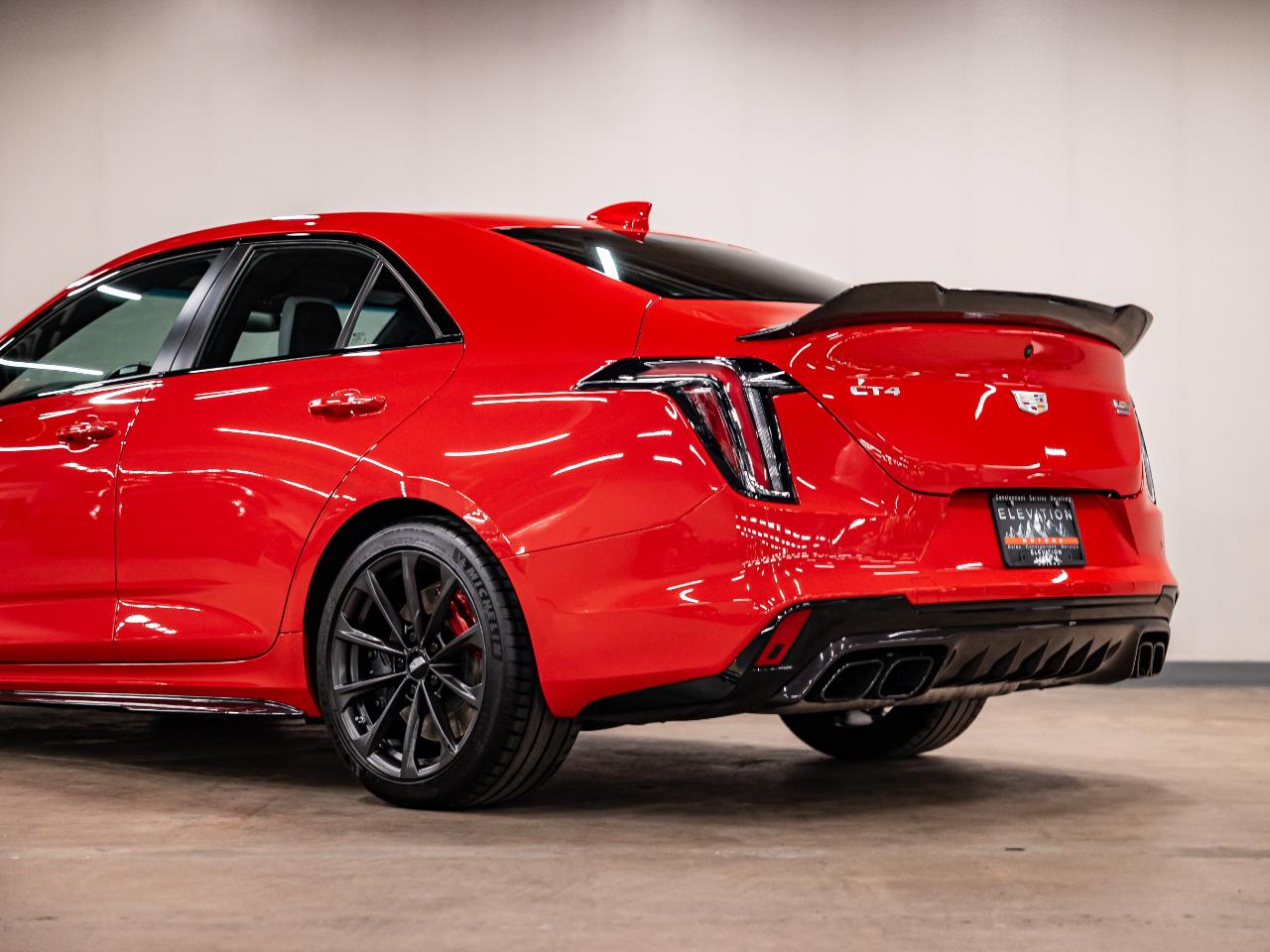 This 2024 Cadillac CT4-V Blackwing is finished in Velocity Red over a Sky Cool Gray interior with Jet Black accents, trimmed in leather and suede microfiber. Power comes from a 3.6-liter twin-turbocharged V6 producing 472 horsepower and 445 lb-ft of torque, sent to the rear wheels through a 6-speed manual transmission.