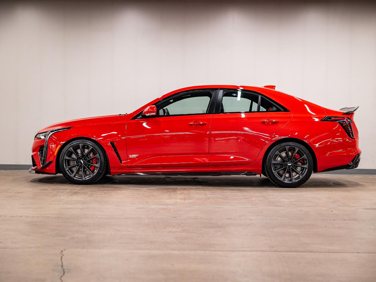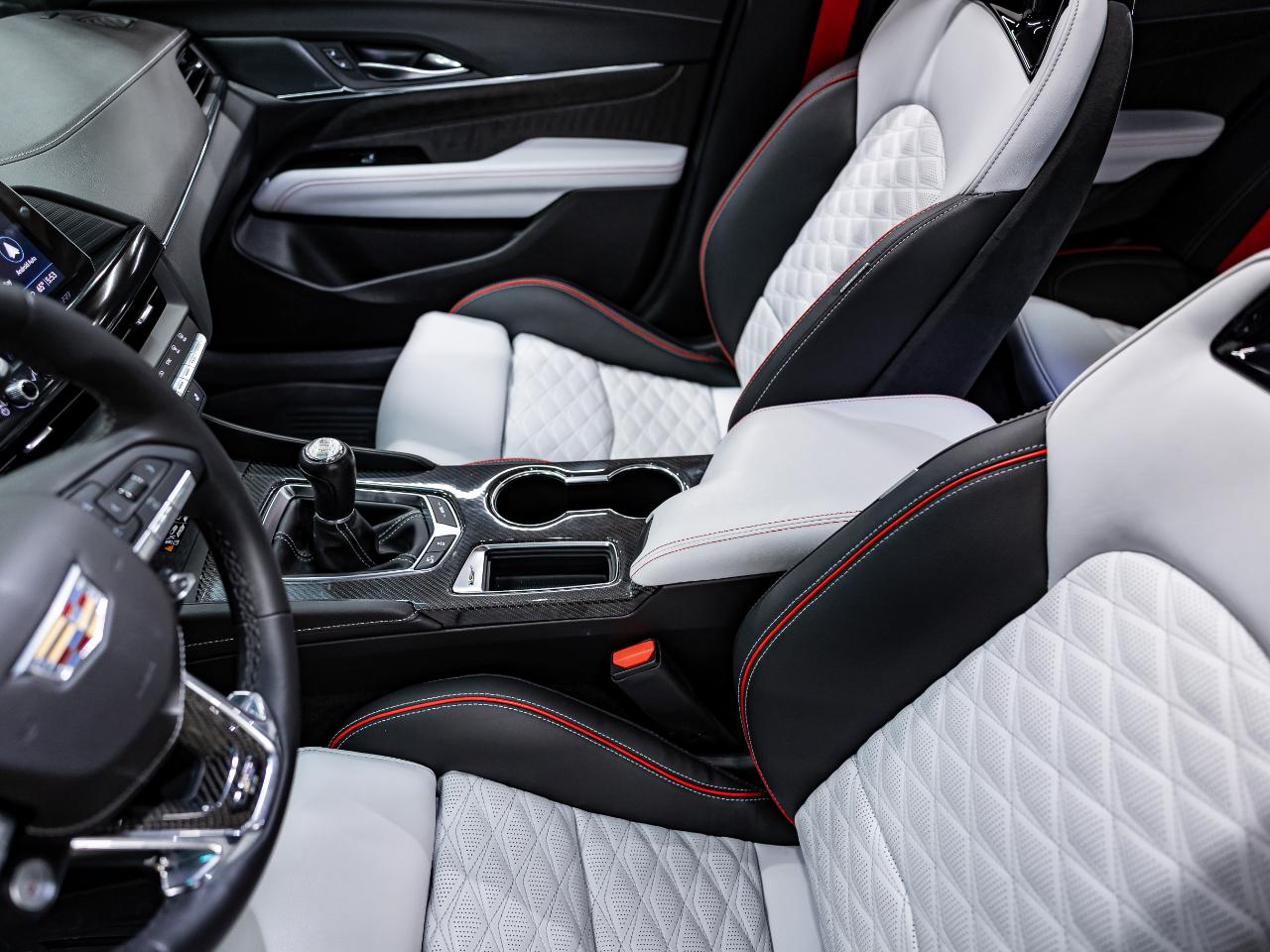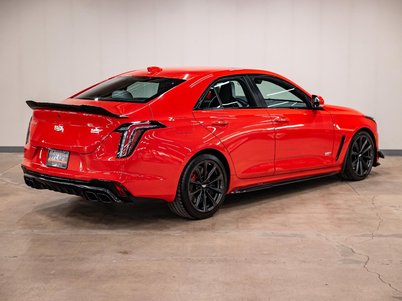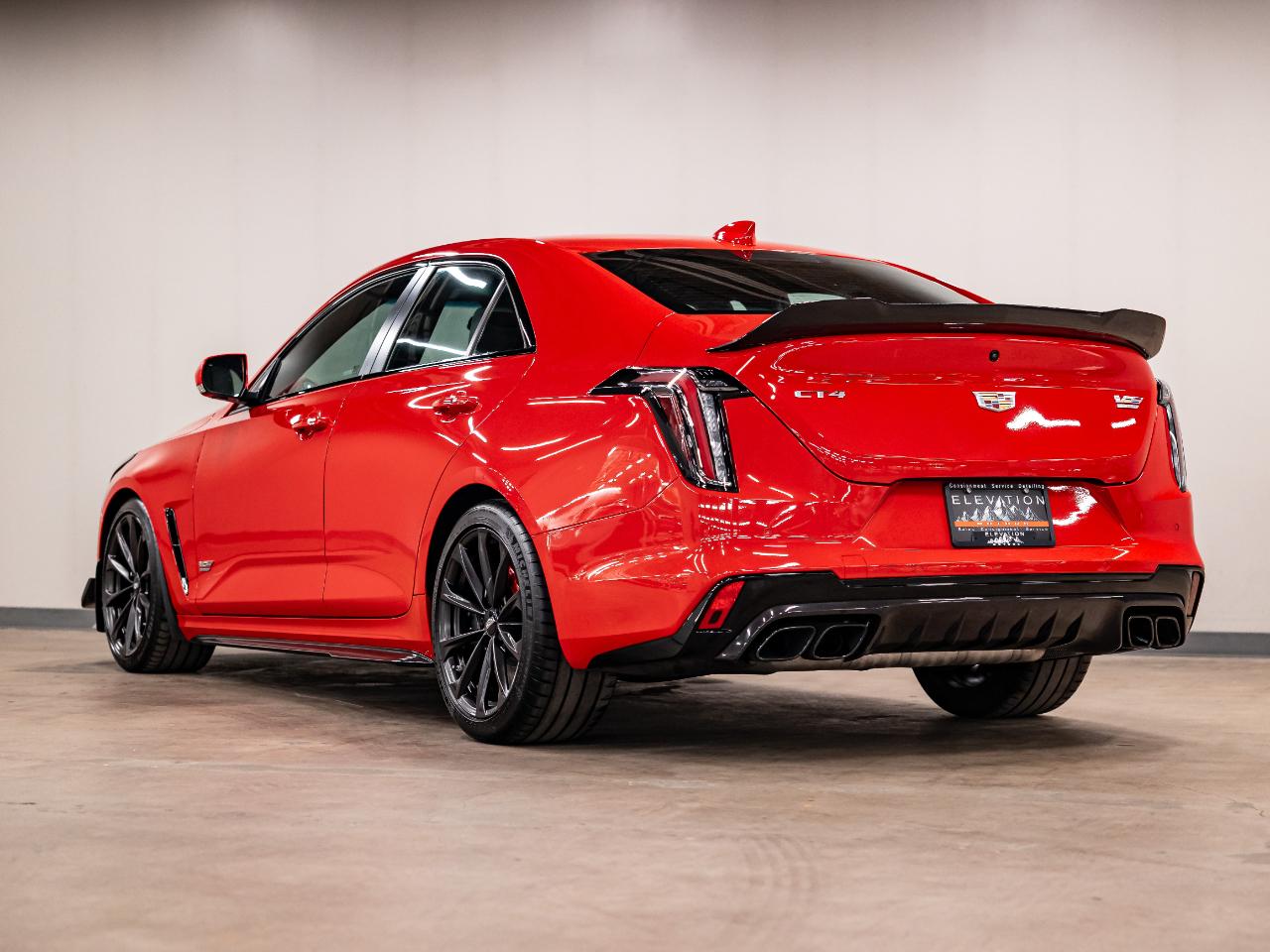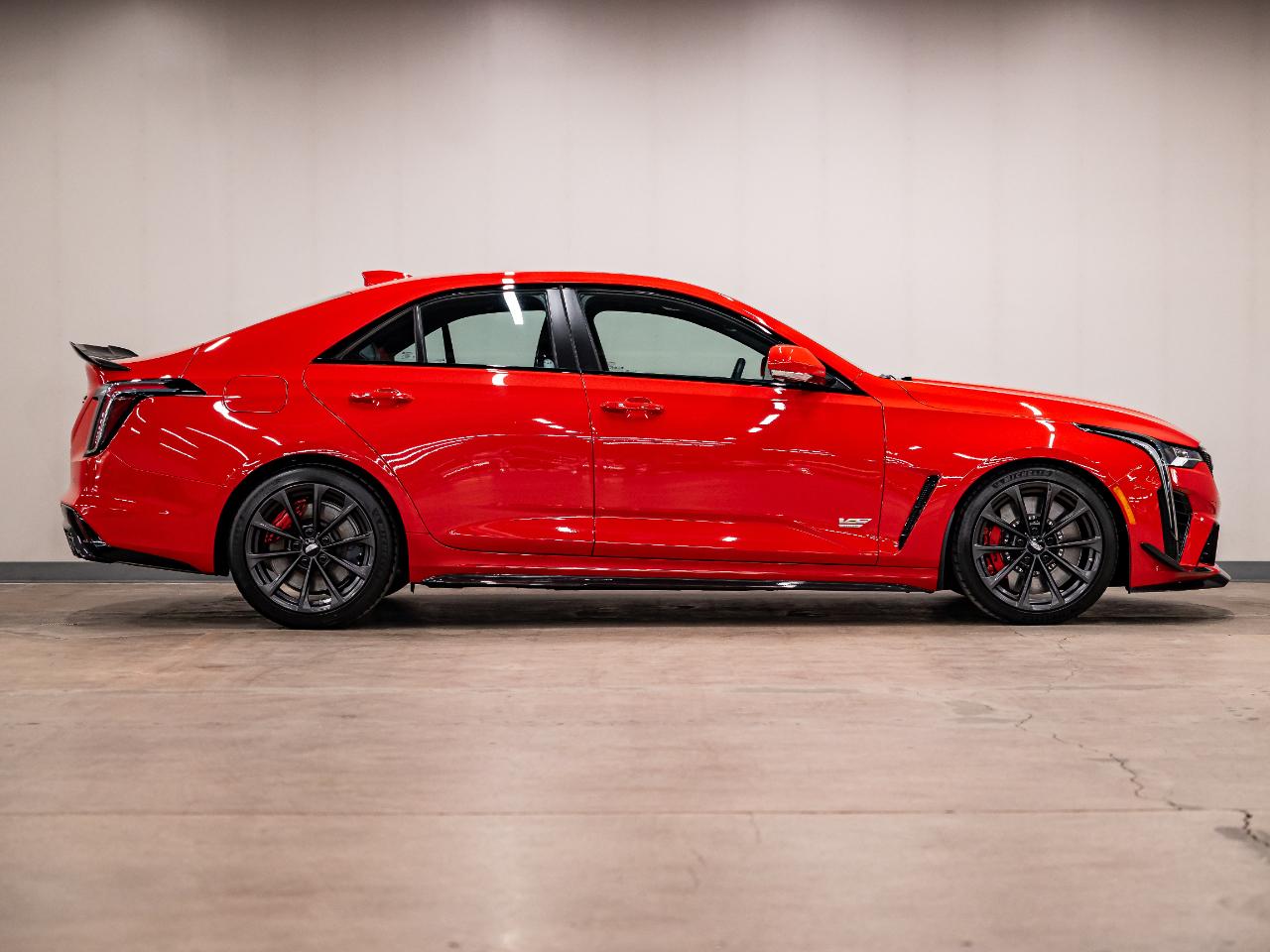 This 2024 Cadillac CT4-V Blackwing is finished in Velocity Red over a Sky Cool Gray interior with Jet Black accents, trimmed in leather and suede microfiber. Power comes from a 3.6-liter twin-turbocharged V6 producing 472 horsepower and 445 lb-ft of torque, sent to the rear wheels through a 6-speed manual transmission.