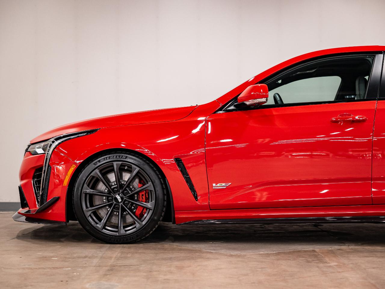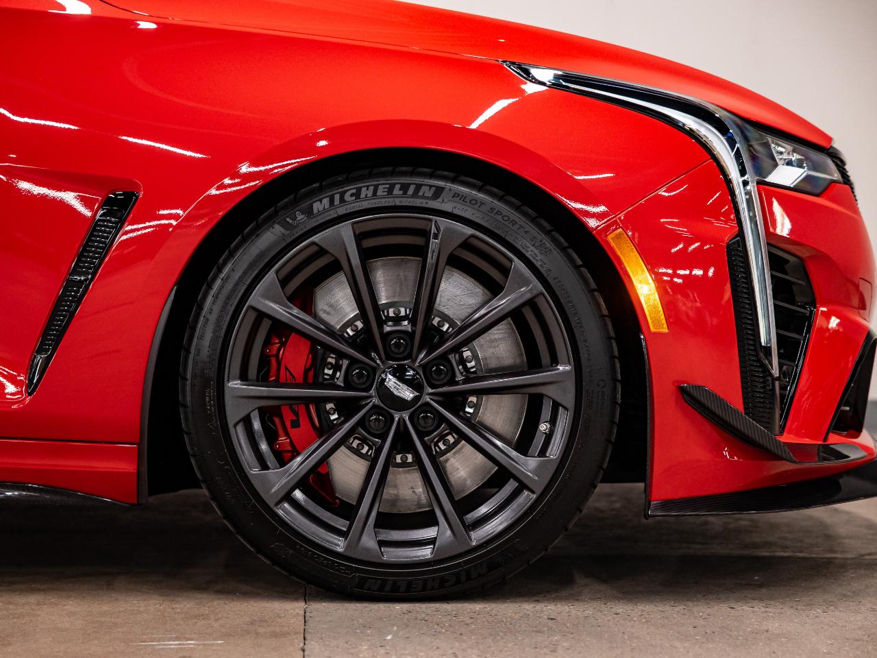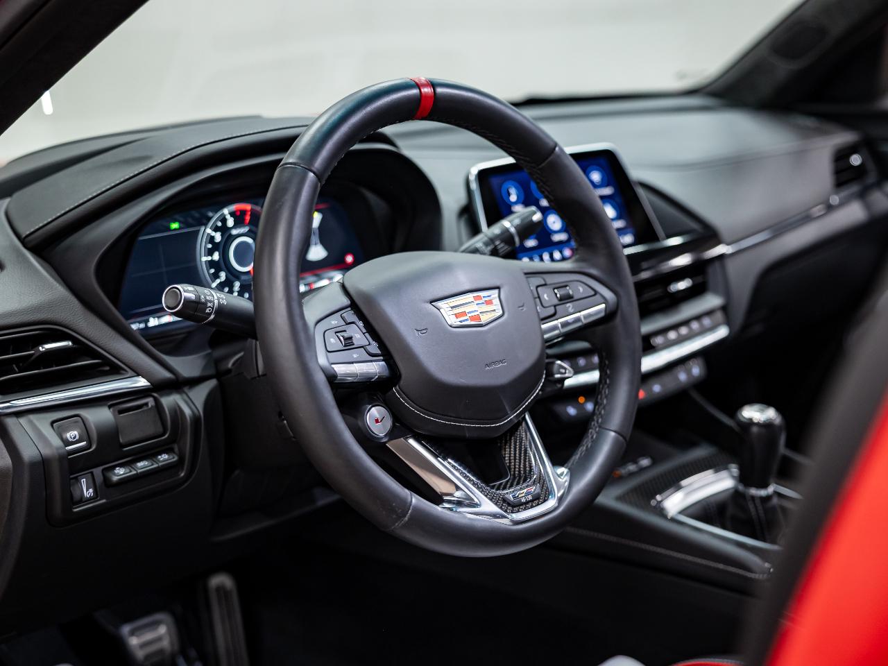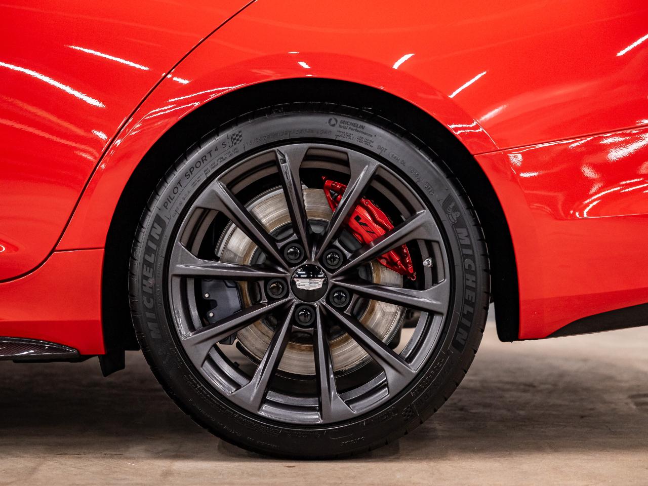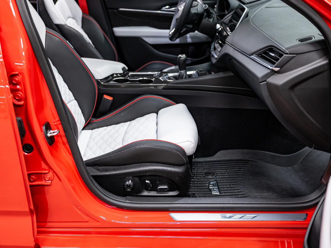 This 2024 Cadillac CT4-V Blackwing is finished in Velocity Red over a Sky Cool Gray interior with Jet Black accents, trimmed in leather and suede microfiber. Power comes from a 3.6-liter twin-turbocharged V6 producing 472 horsepower and 445 lb-ft of torque, sent to the rear wheels through a 6-speed manual transmission.
