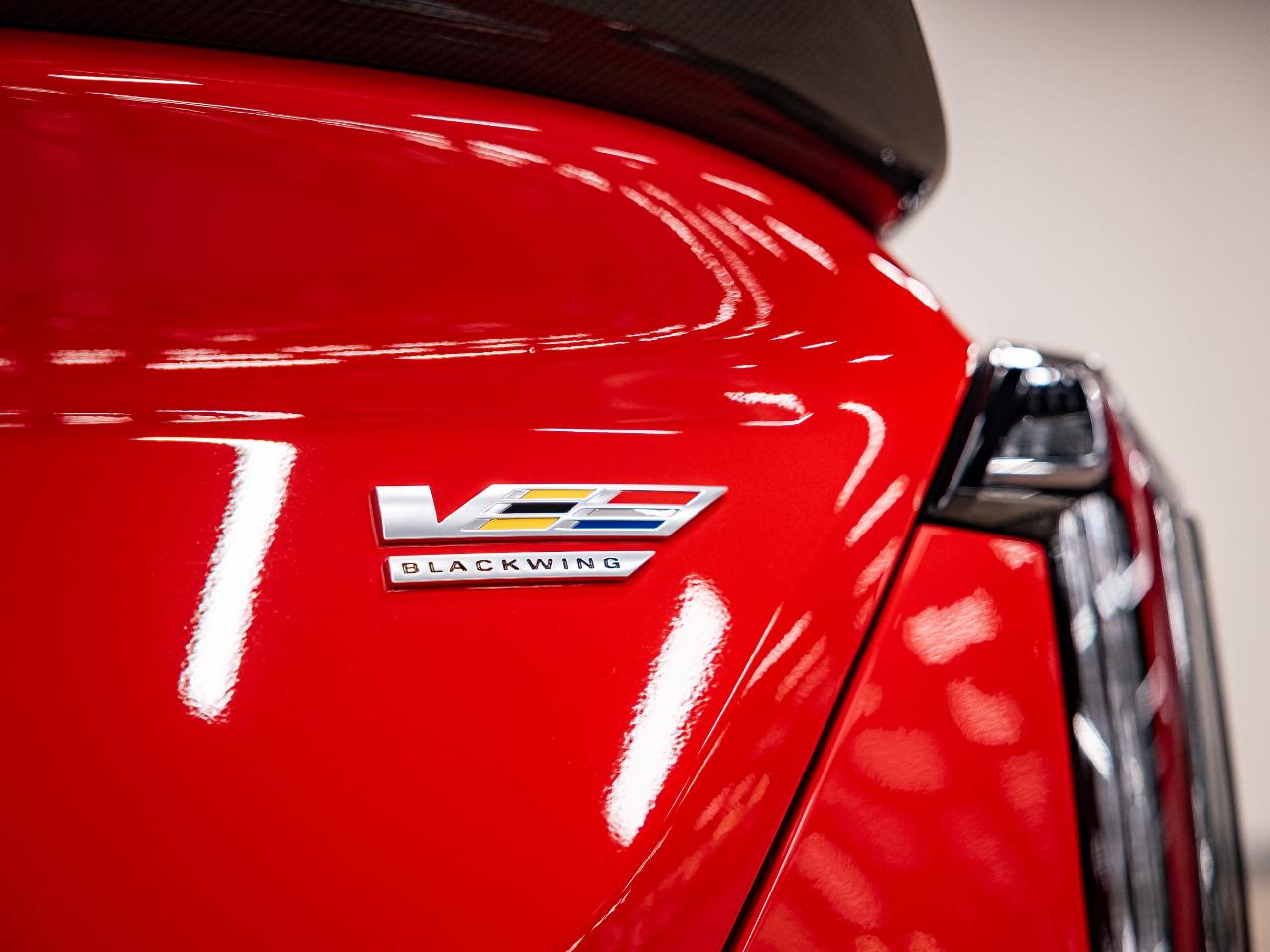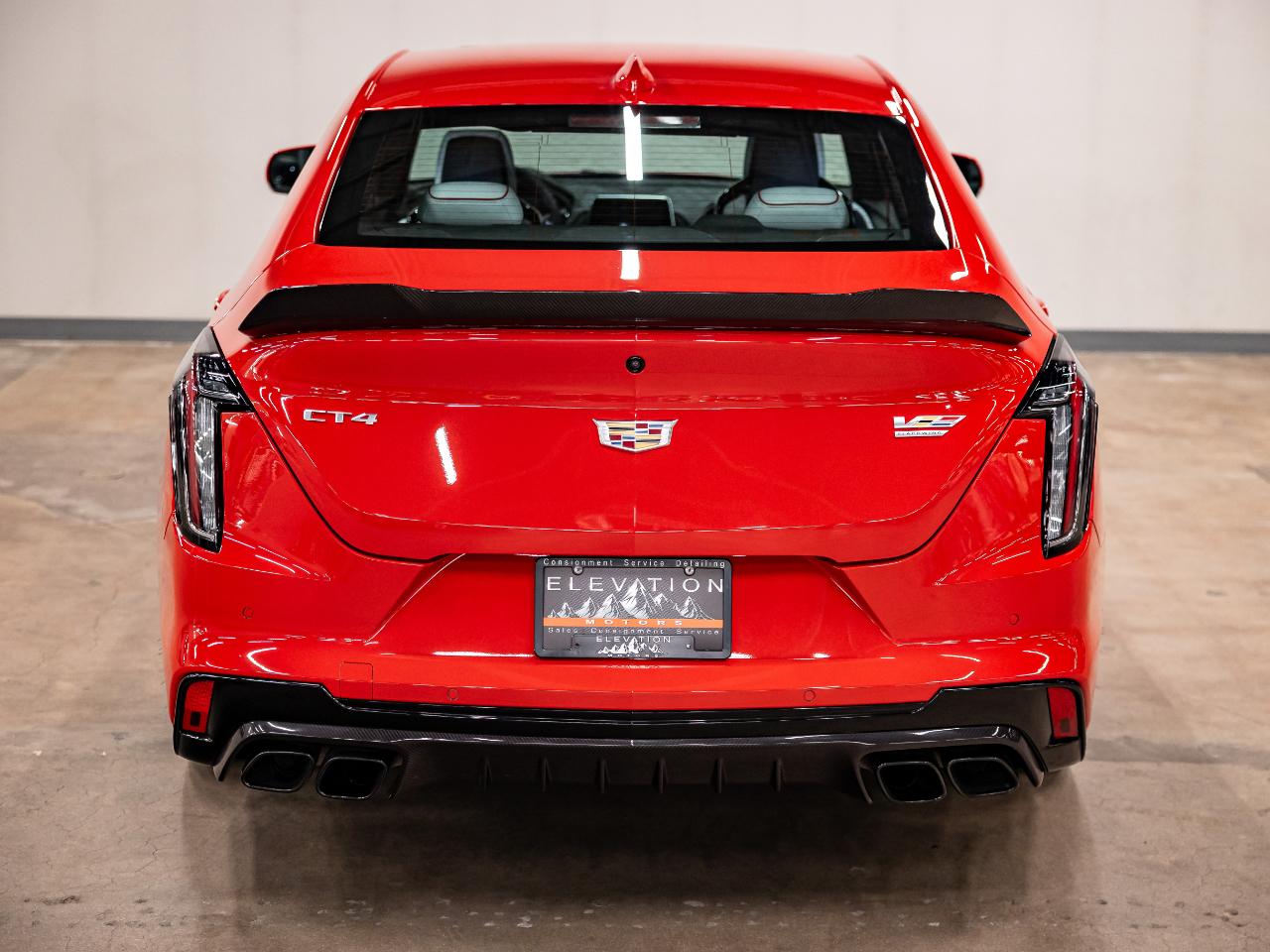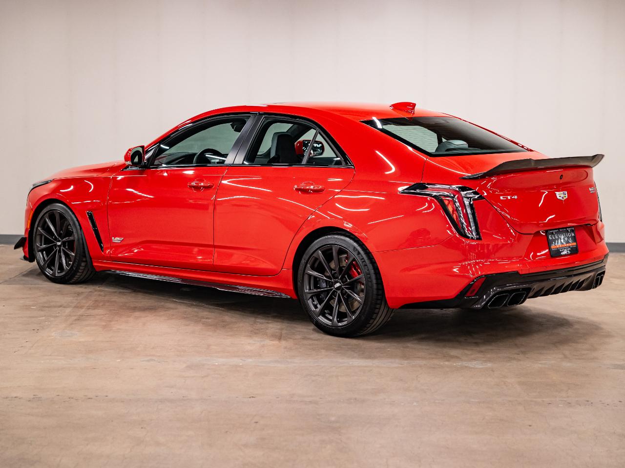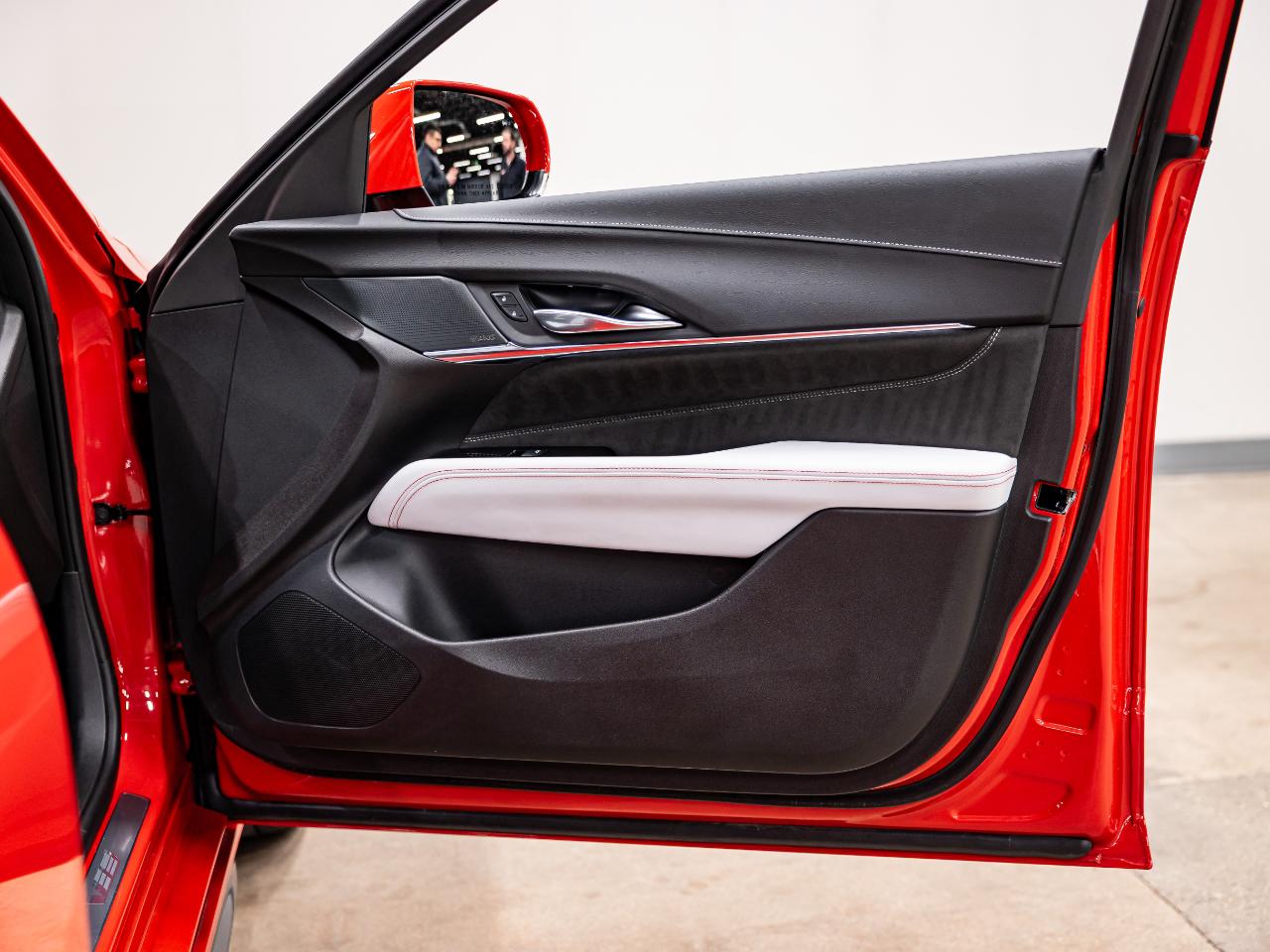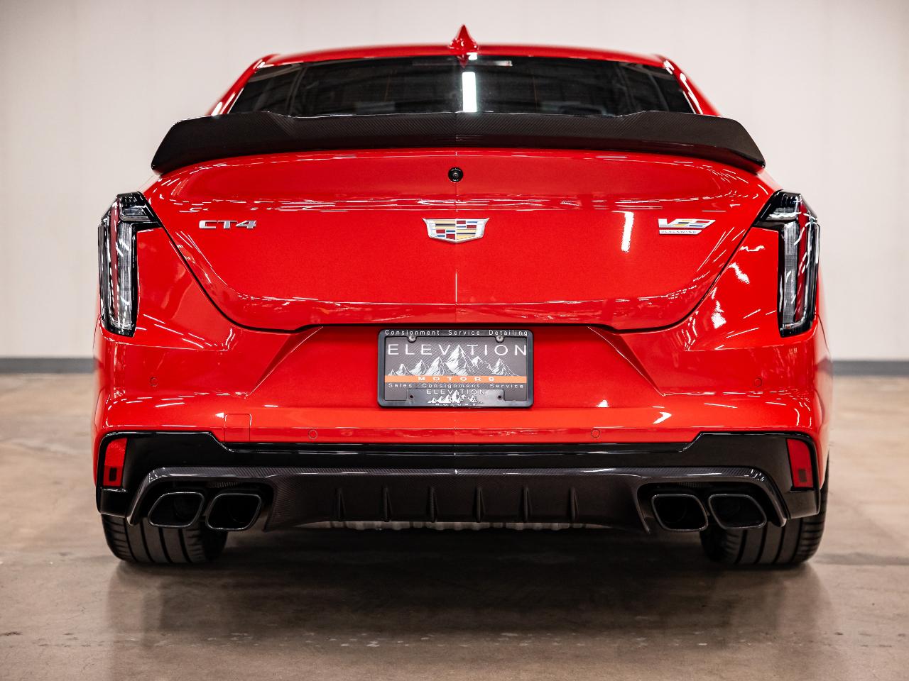 This 2024 Cadillac CT4-V Blackwing is finished in Velocity Red over a Sky Cool Gray interior with Jet Black accents, trimmed in leather and suede microfiber. Power comes from a 3.6-liter twin-turbocharged V6 producing 472 horsepower and 445 lb-ft of torque, sent to the rear wheels through a 6-speed manual transmission.