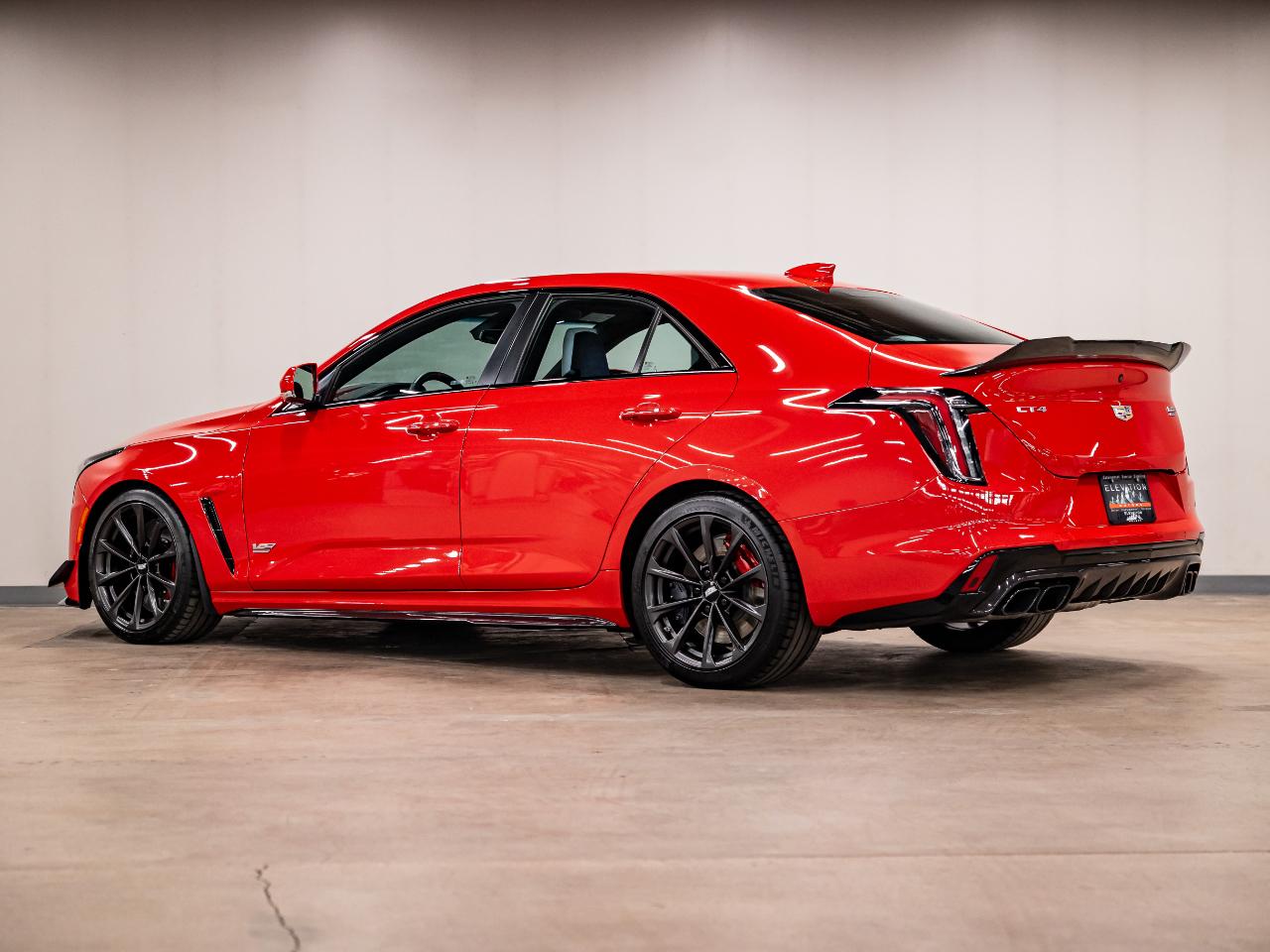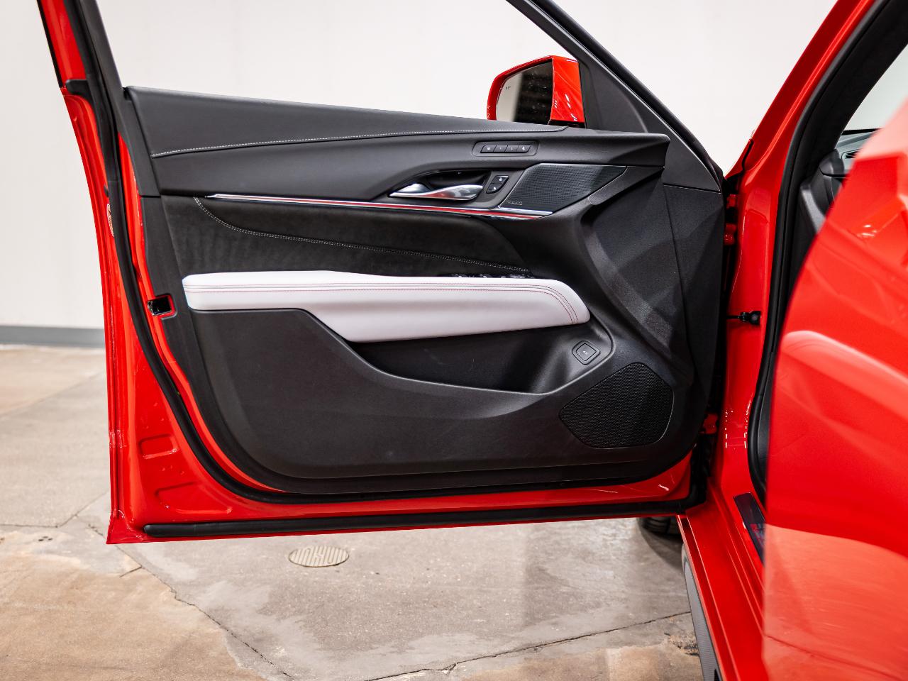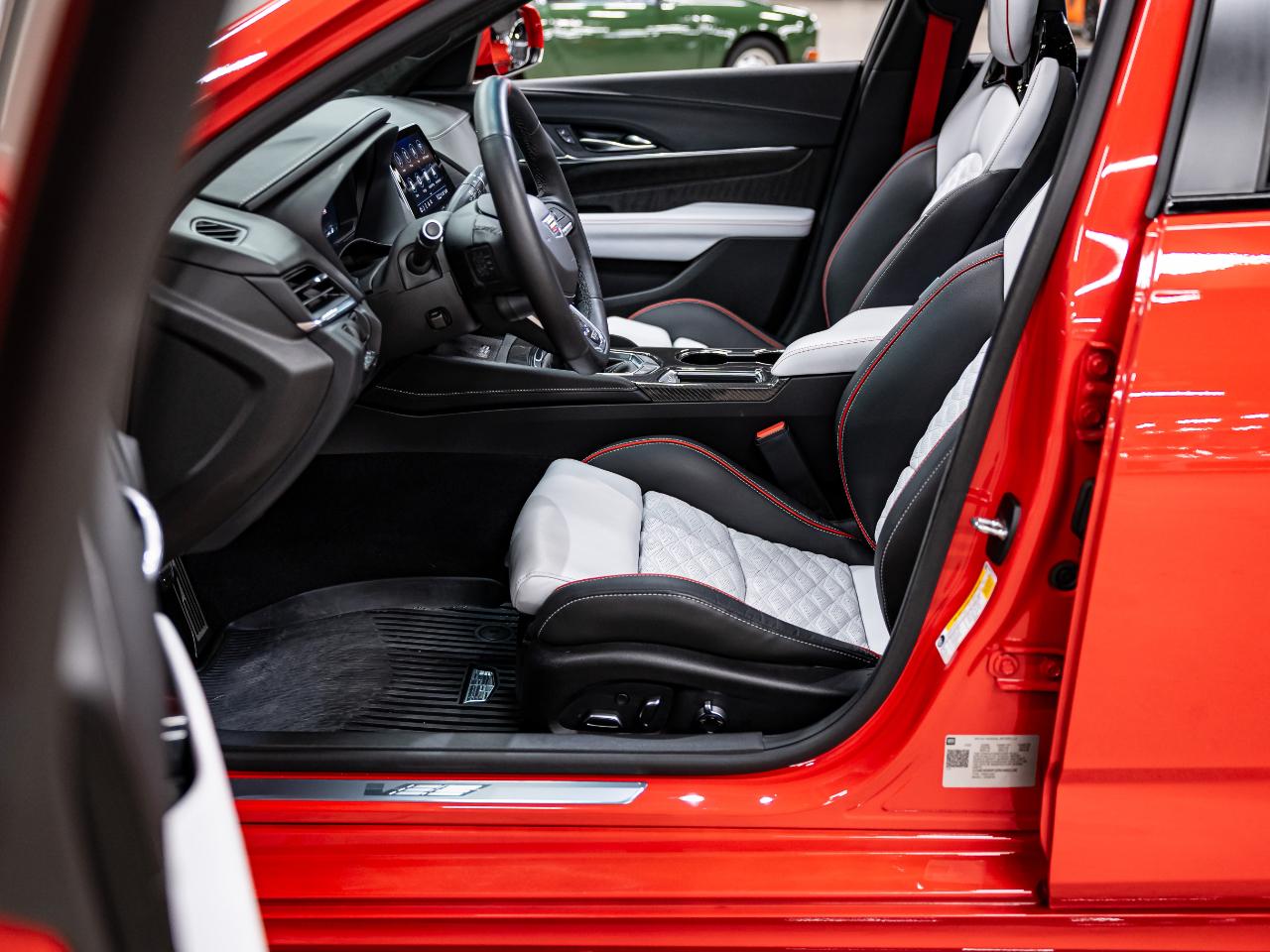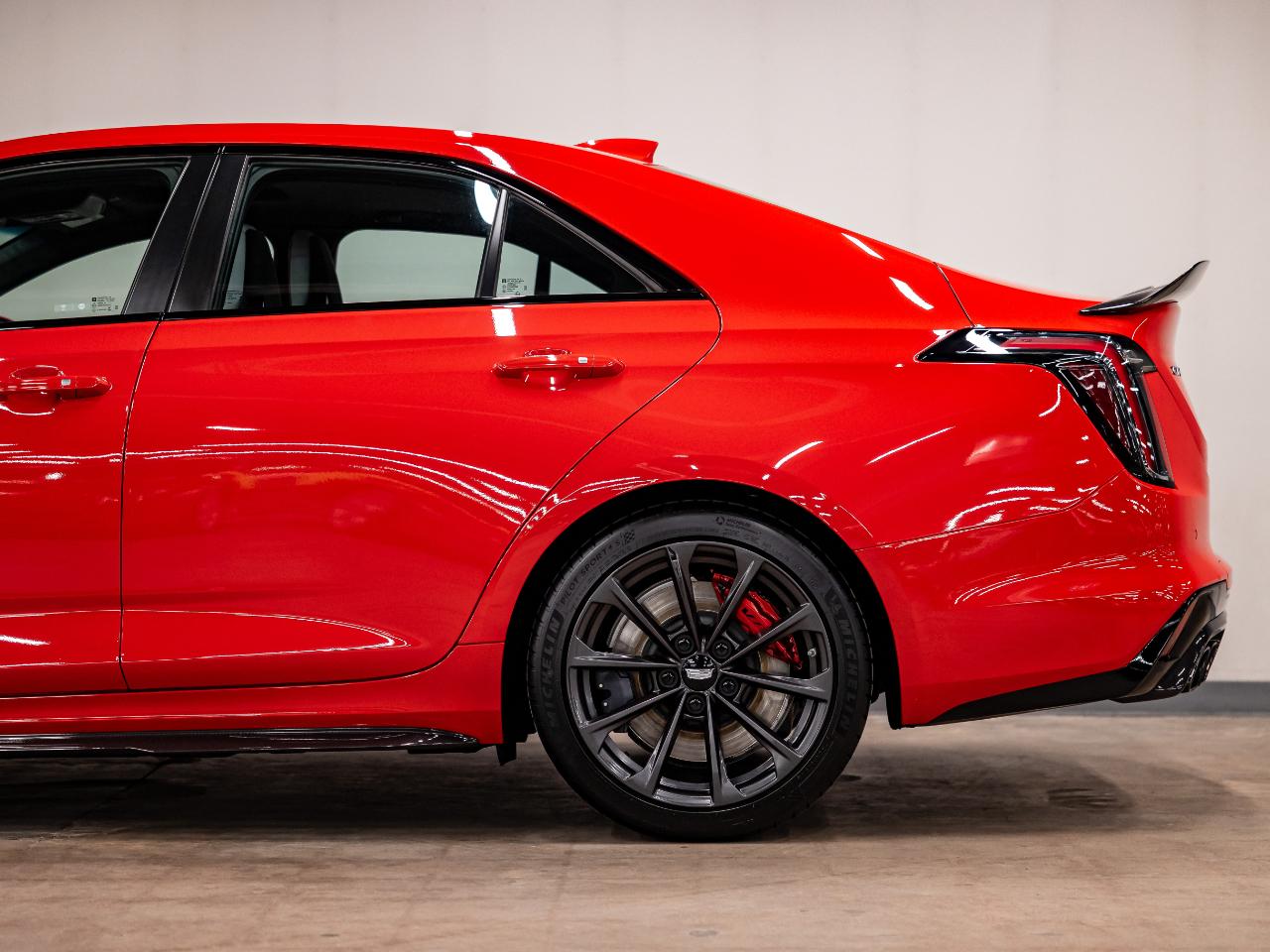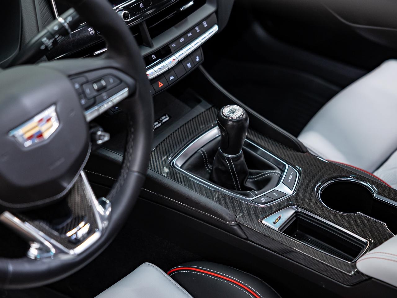 This 2024 Cadillac CT4-V Blackwing is finished in Velocity Red over a Sky Cool Gray interior with Jet Black accents, trimmed in leather and suede microfiber. Power comes from a 3.6-liter twin-turbocharged V6 producing 472 horsepower and 445 lb-ft of torque, sent to the rear wheels through a 6-speed manual transmission.