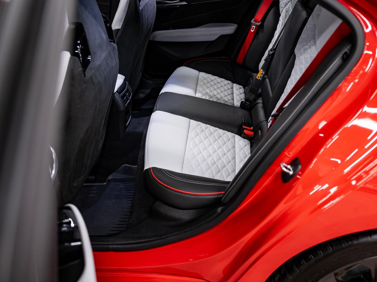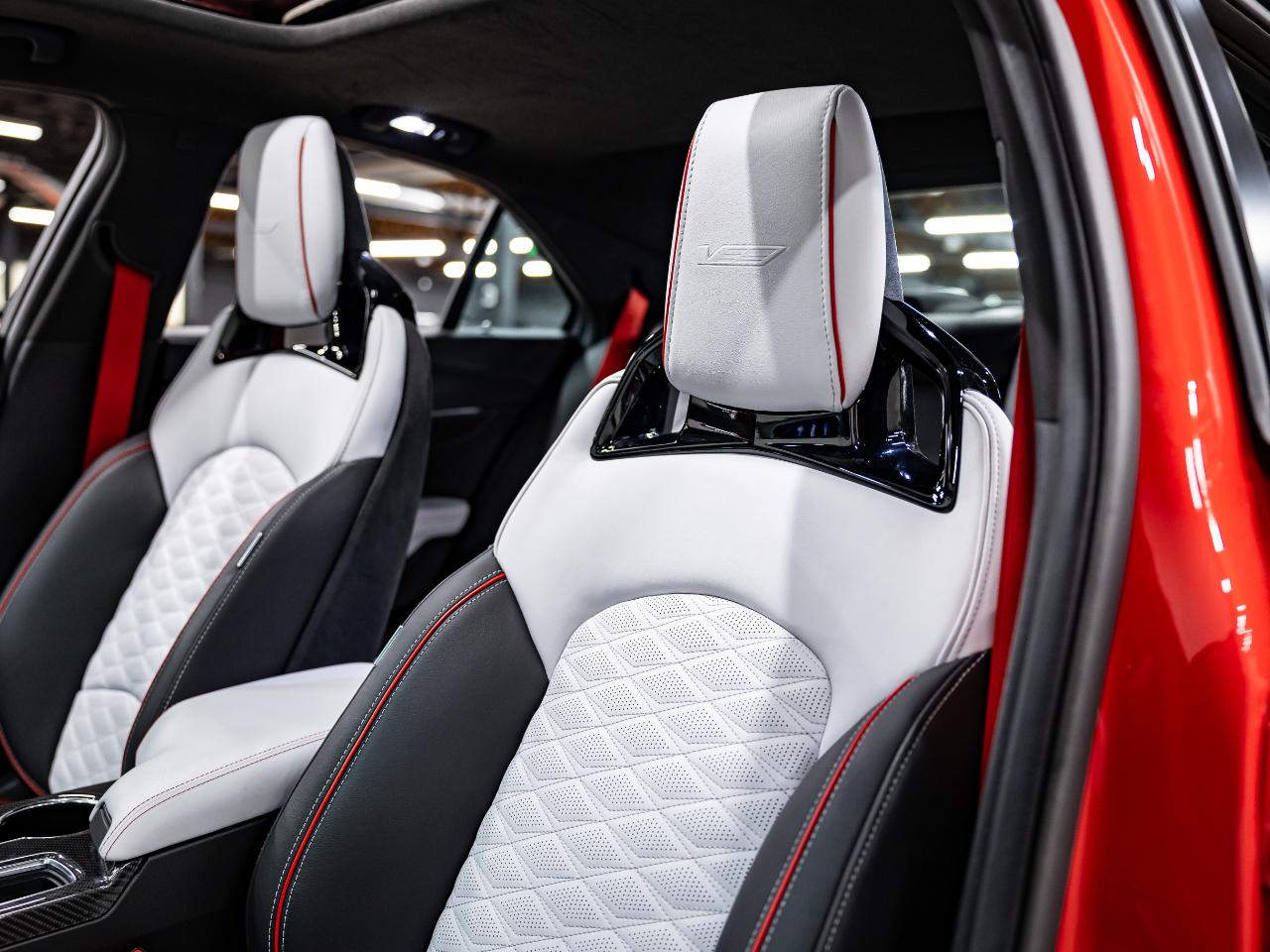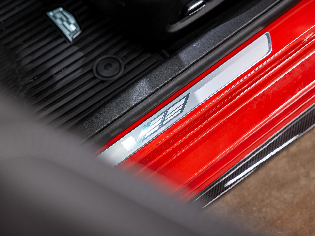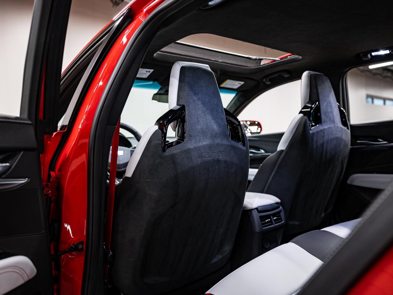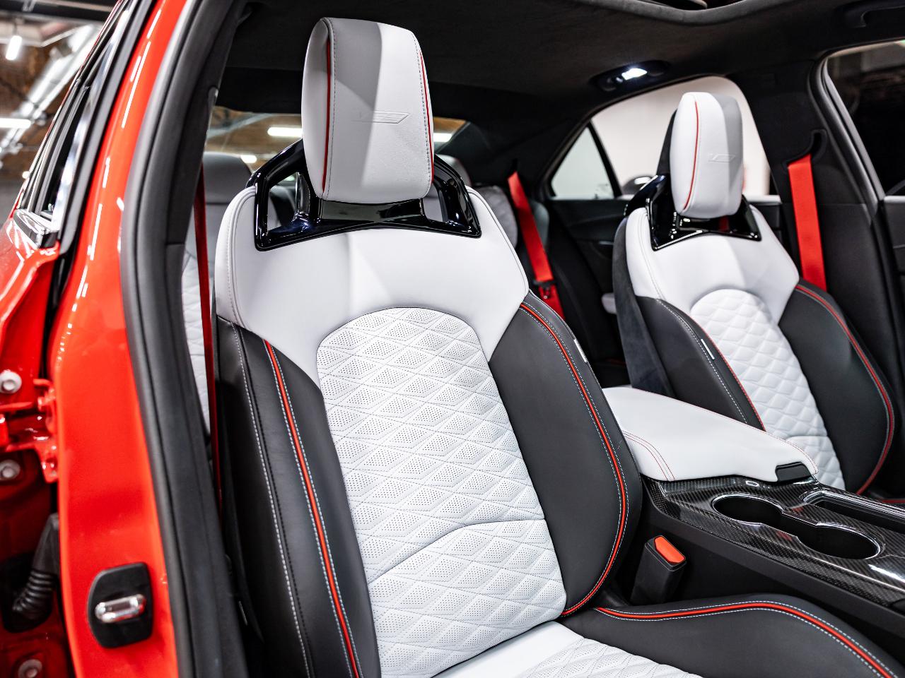 This 2024 Cadillac CT4-V Blackwing is finished in Velocity Red over a Sky Cool Gray interior with Jet Black accents, trimmed in leather and suede microfiber. Power comes from a 3.6-liter twin-turbocharged V6 producing 472 horsepower and 445 lb-ft of torque, sent to the rear wheels through a 6-speed manual transmission.