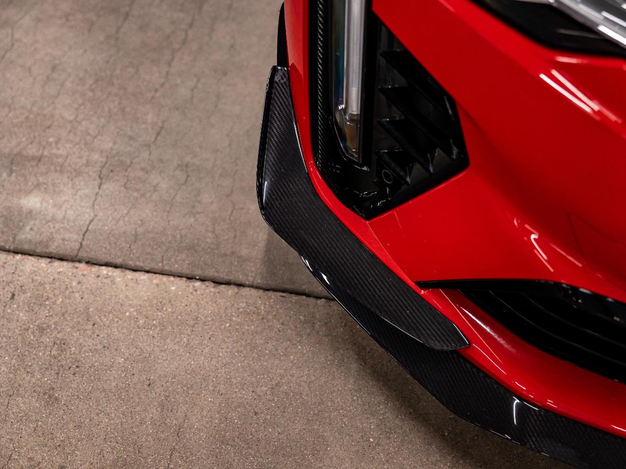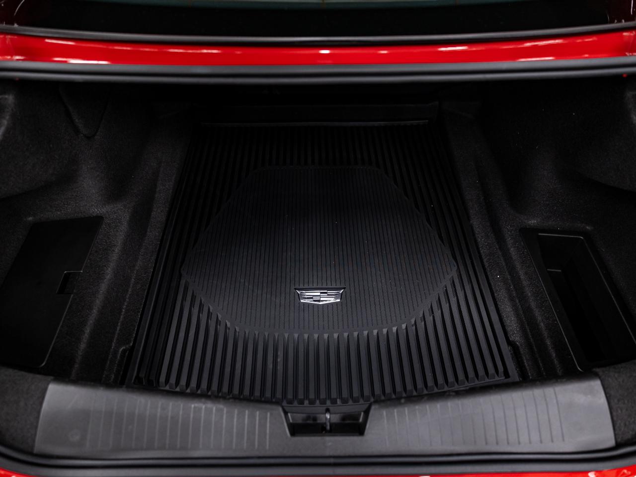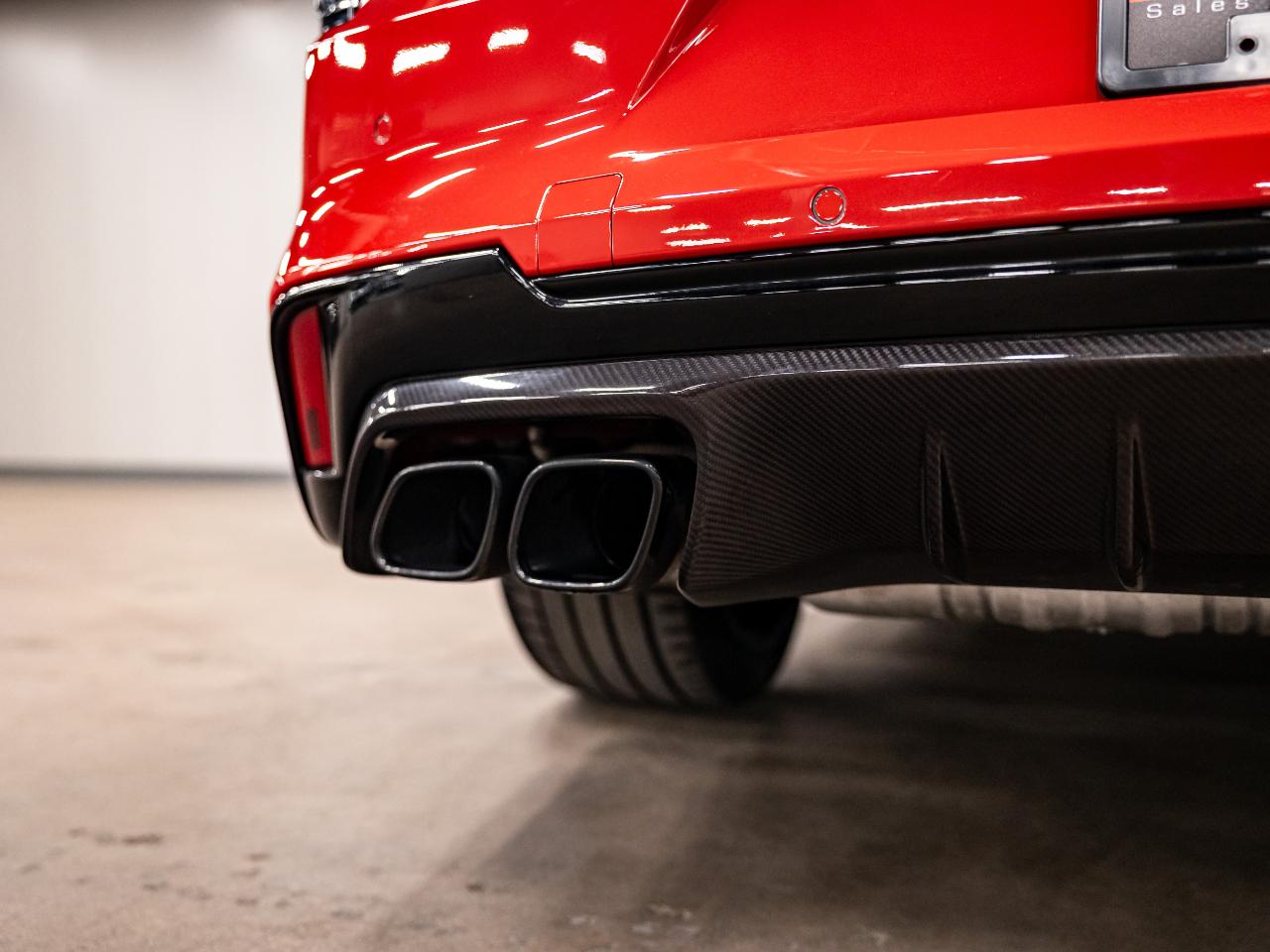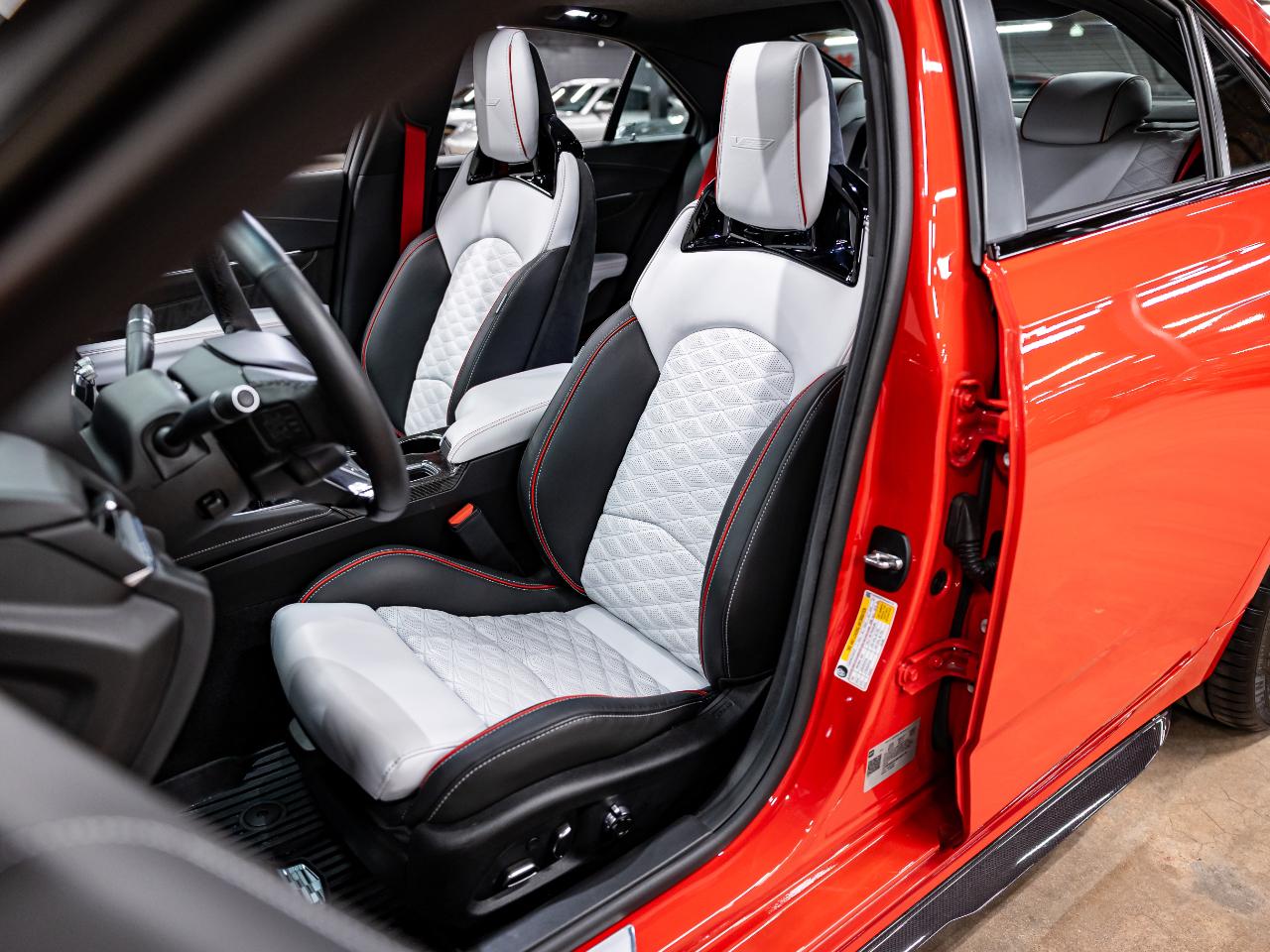 This CT4-V Blackwing is well equipped with the Carbon Fiber Package 2, Performance Data and Video Recorder, and a power sunroof. Additional features include the Technology Package, Climate Package, Brembo brakes with red painted calipers, Torch Red seat belts, Interior Protection Package, black mirror covers, and black lug nuts, giving the car a distinctive and aggressive look.