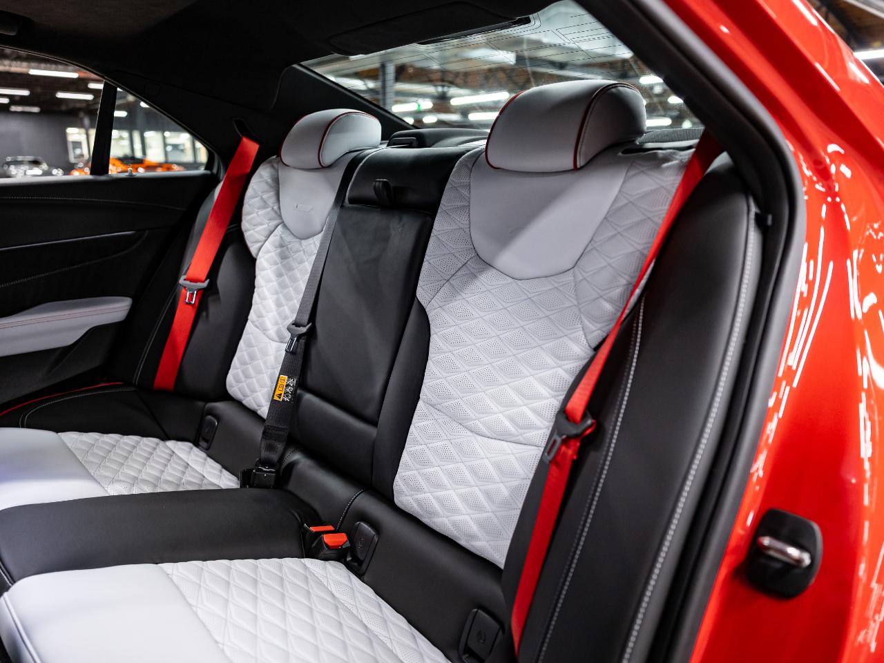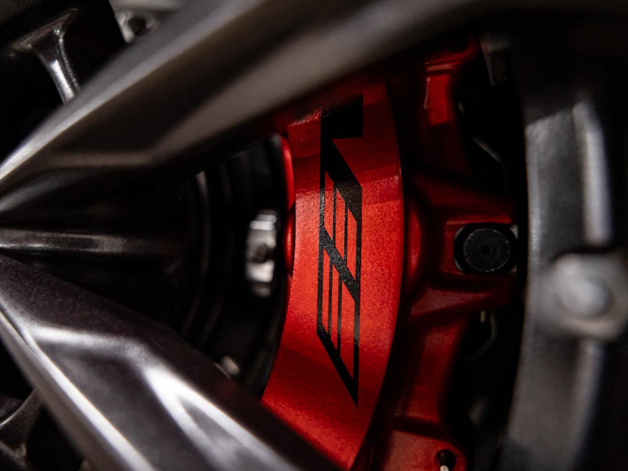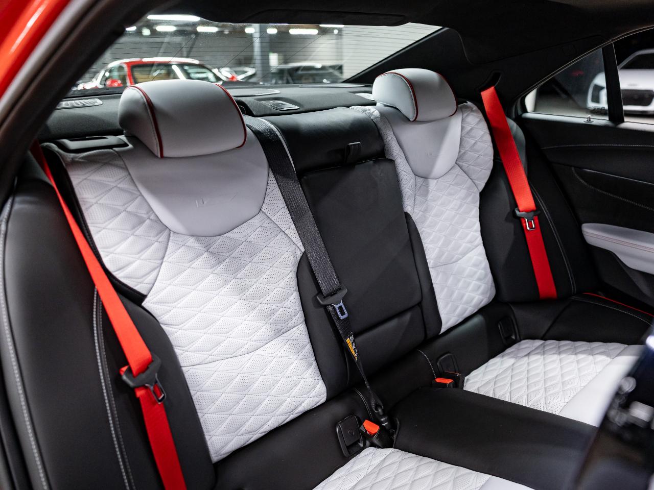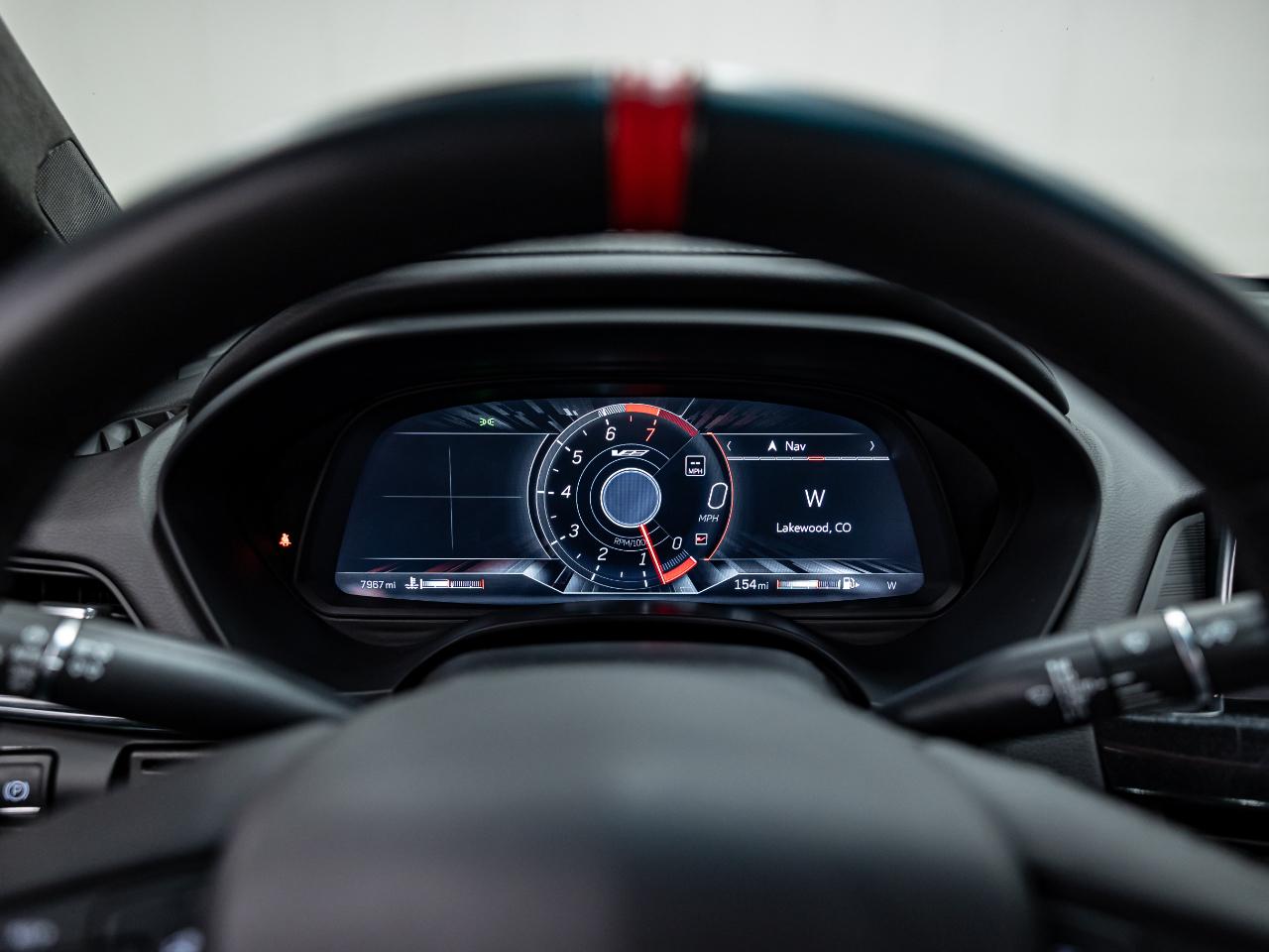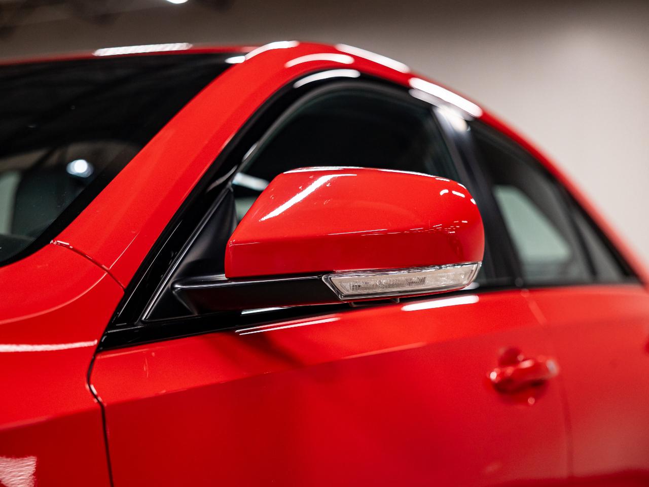 This CT4-V Blackwing is well equipped with the Carbon Fiber Package 2, Performance Data and Video Recorder, and a power sunroof. Additional features include the Technology Package, Climate Package, Brembo brakes with red painted calipers, Torch Red seat belts, Interior Protection Package, black mirror covers, and black lug nuts, giving the car a distinctive and aggressive look.
